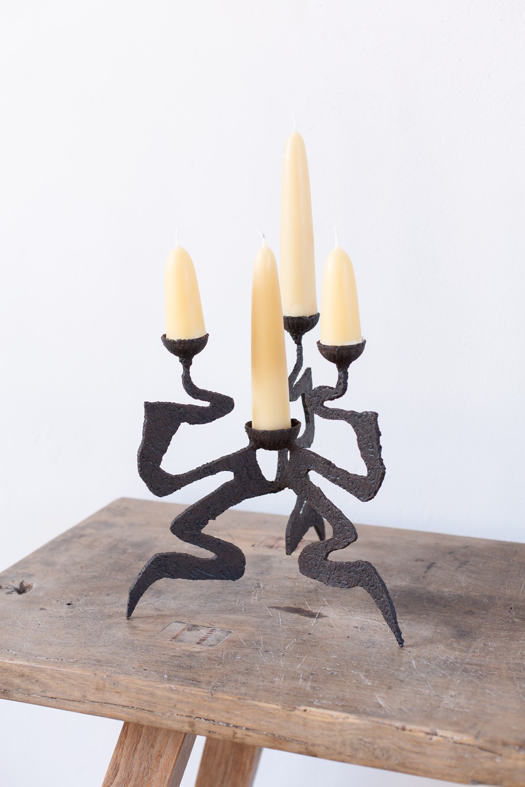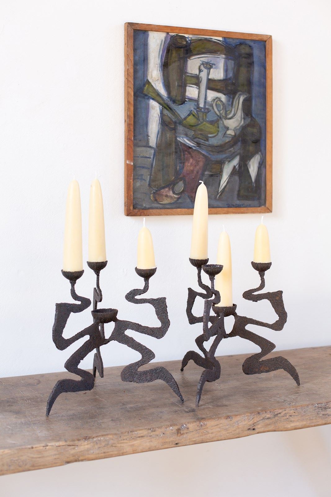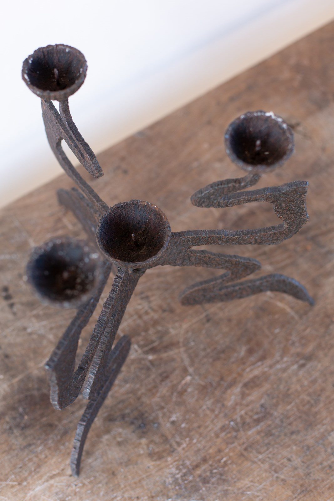 Hand forged  Brutalist candleabra from Spain, C1960.  Made from solid iron, with mark-making adding texture across the surface, these have a sculptural feel. Priced individually.