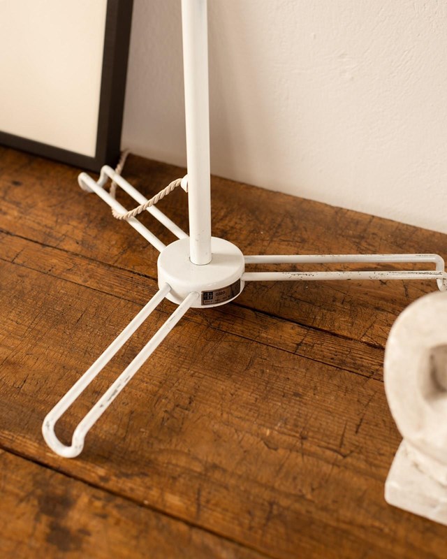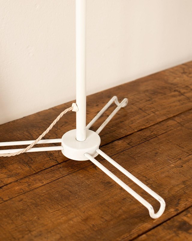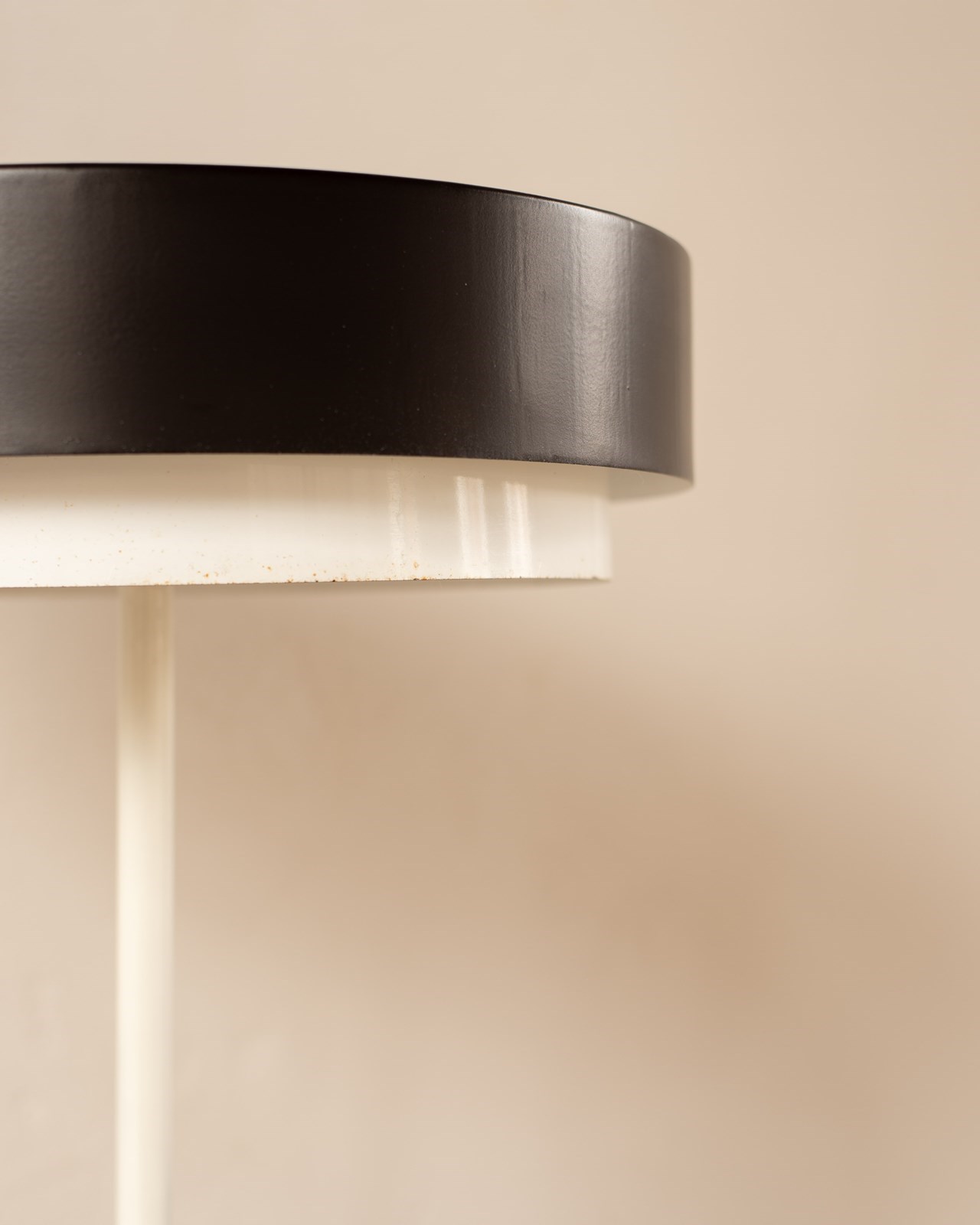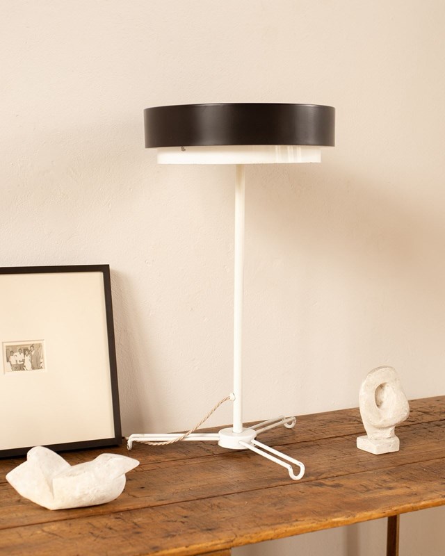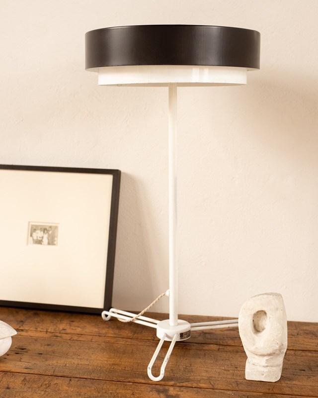 Simplistically designed, a metal lamp by Meyer, Germany sitting on a metal tripod base C1960. The spun aluminium shade is constructed in two layers, the top in a deep brown with the under in white. In good vintage condition, this piece has been professionally re-wired and pat tested.
