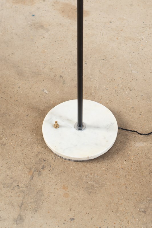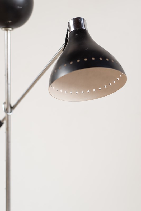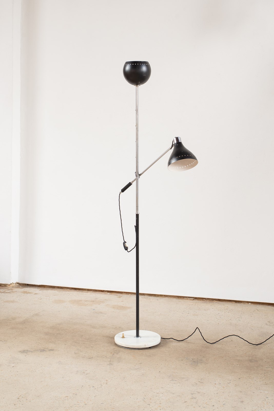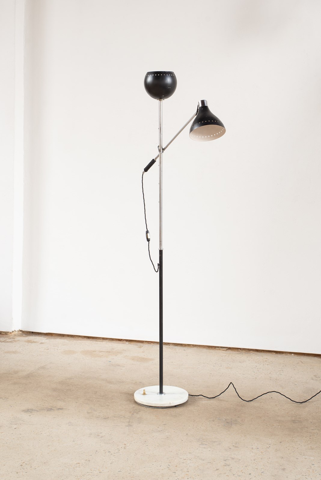 A double-headed floor lamp by renowned Italian maker Stilux, Milano, C1960/70. The lower lamp can be raised and lowered on a peg system along the pole.  The spun aluminium shades are black painted, and the pole is chrome, sitting atop a marble base, which has its foot switch intact.   In good vintage condition with some age to the surface.