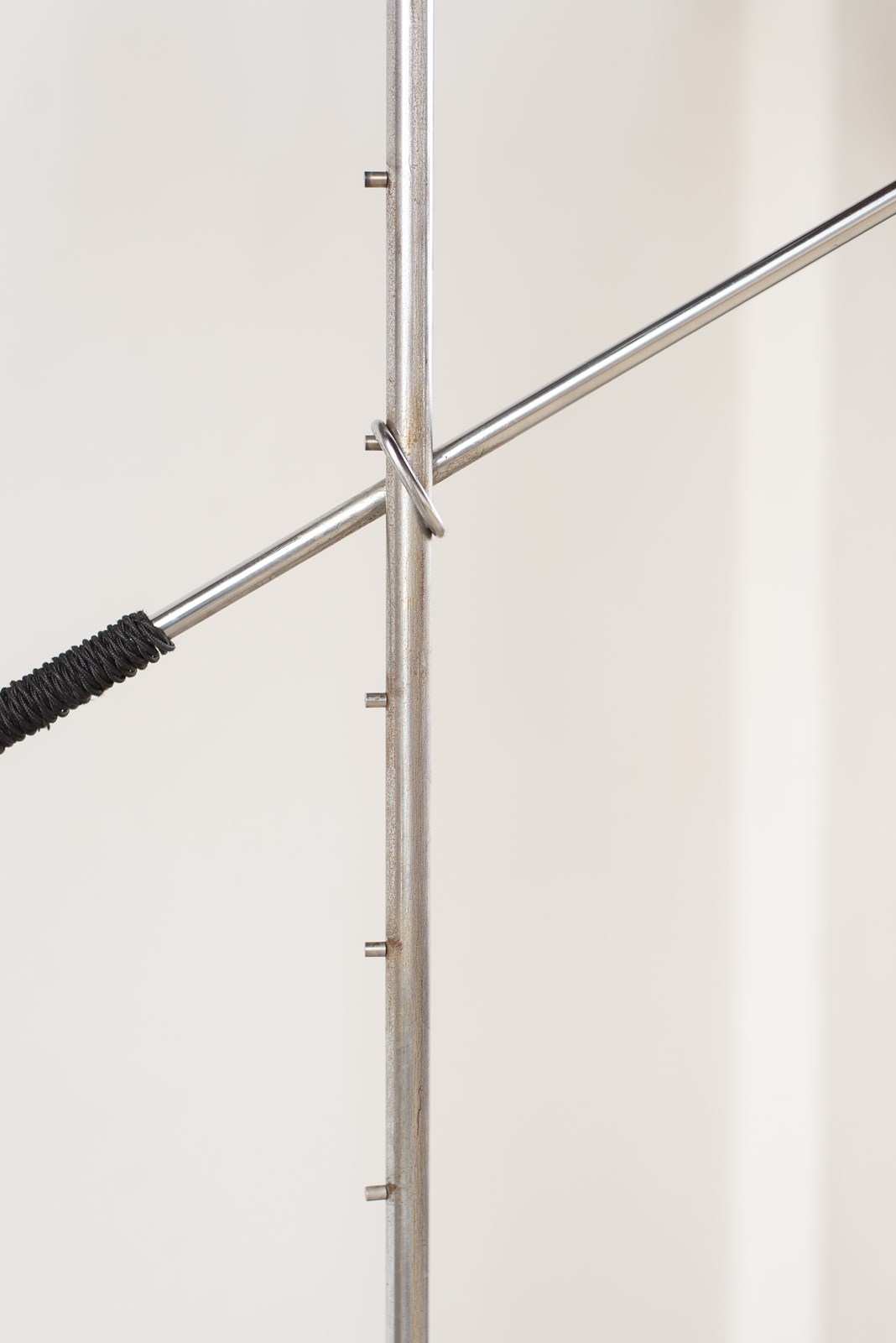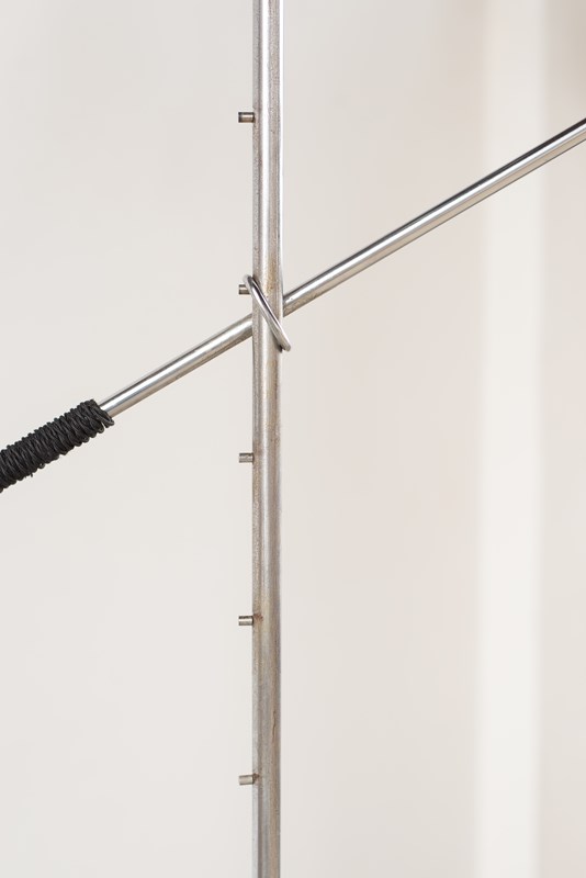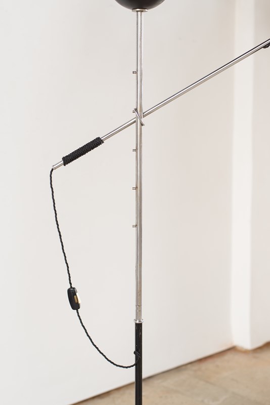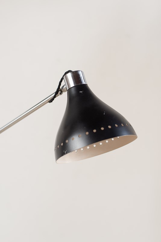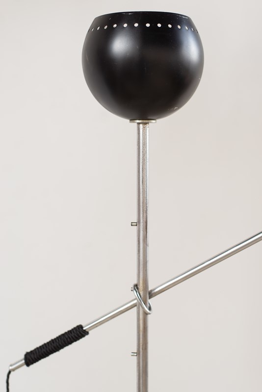 A double-headed floor lamp by renowned Italian maker Stilux, Milano, C1960/70. The lower lamp can be raised and lowered on a peg system along the pole.  The spun aluminium shades are black painted, and the pole is chrome, sitting atop a marble base, which has its foot switch intact.   In good vintage condition with some age to the surface.