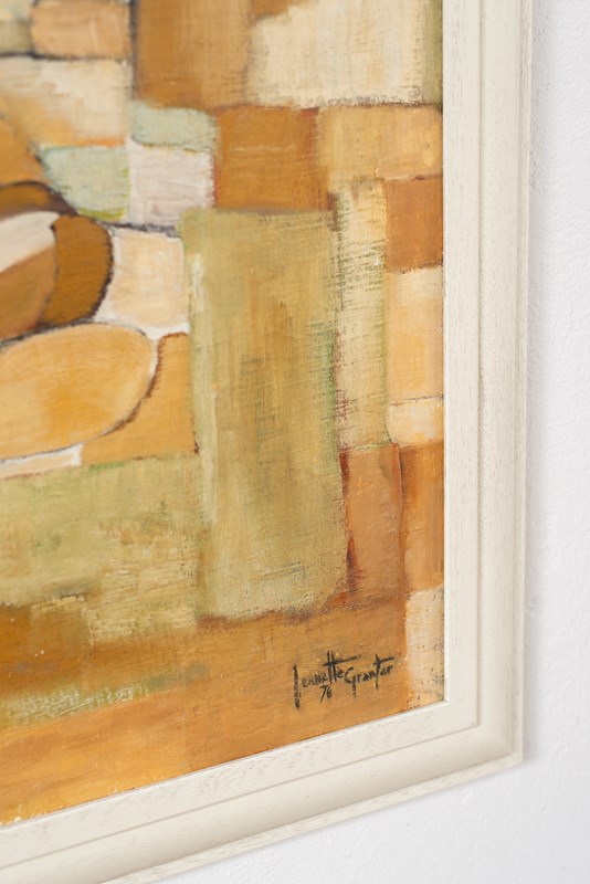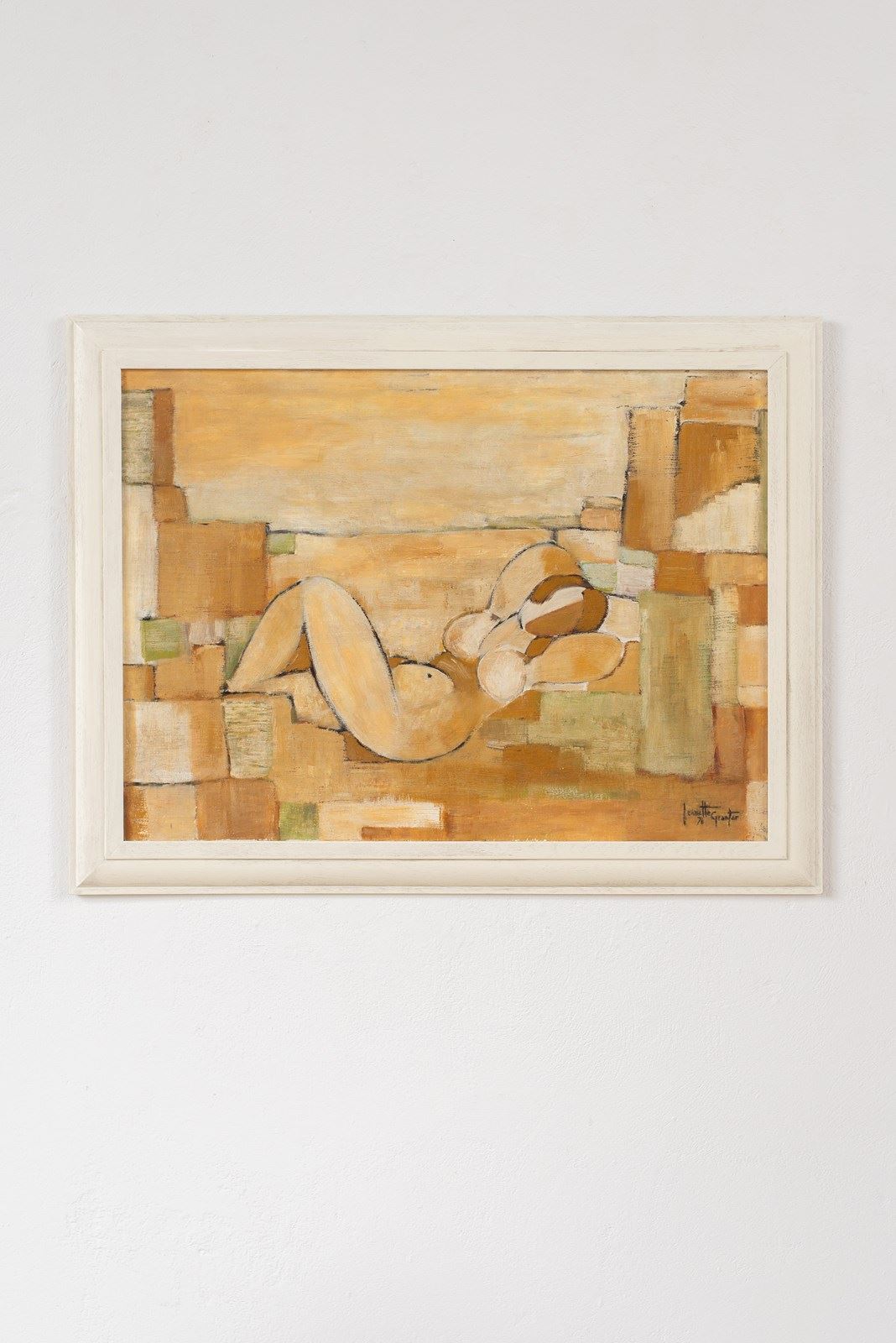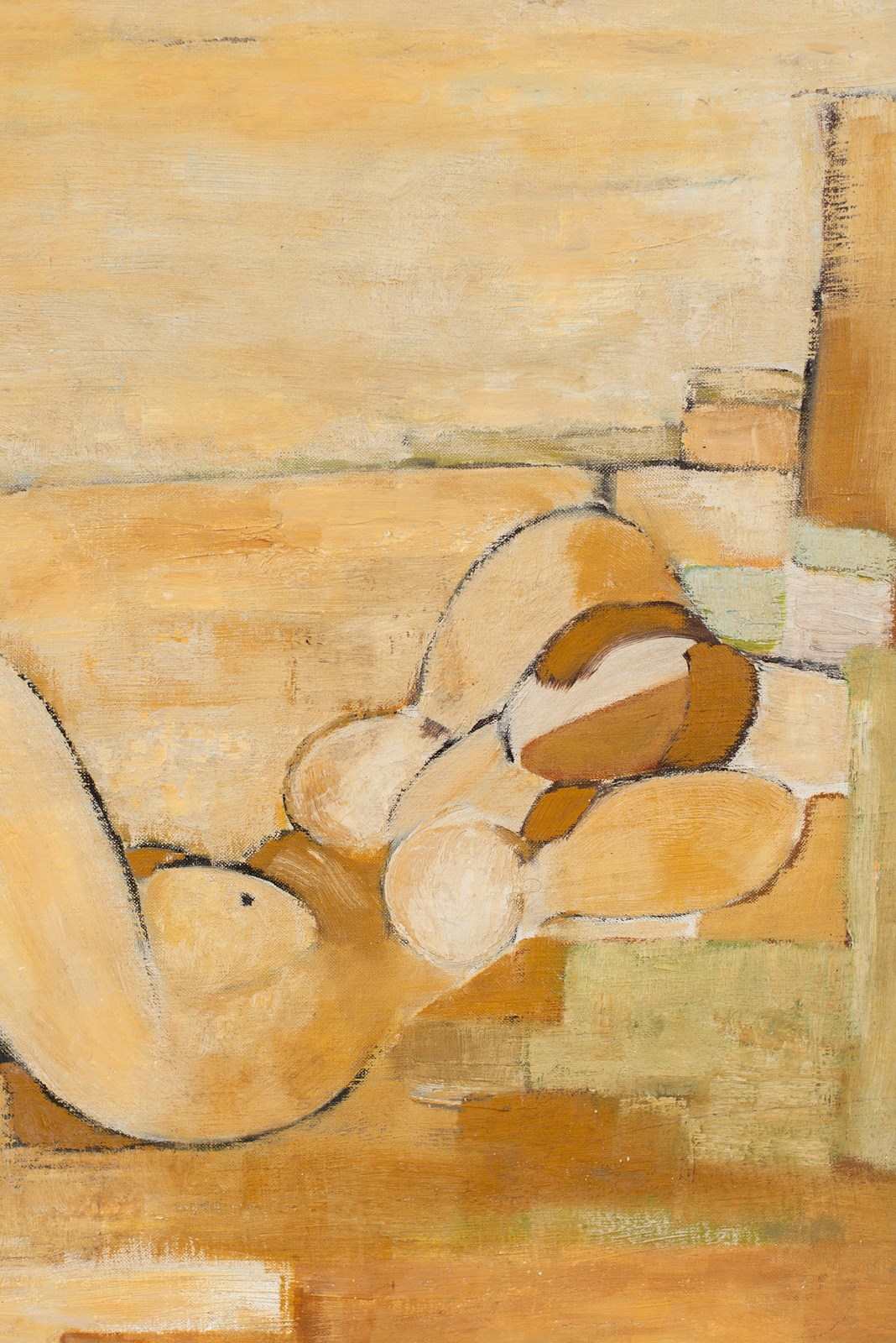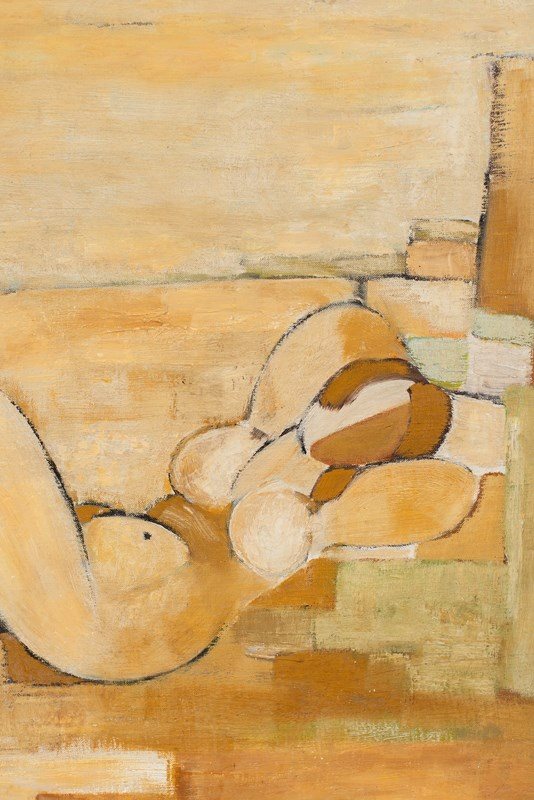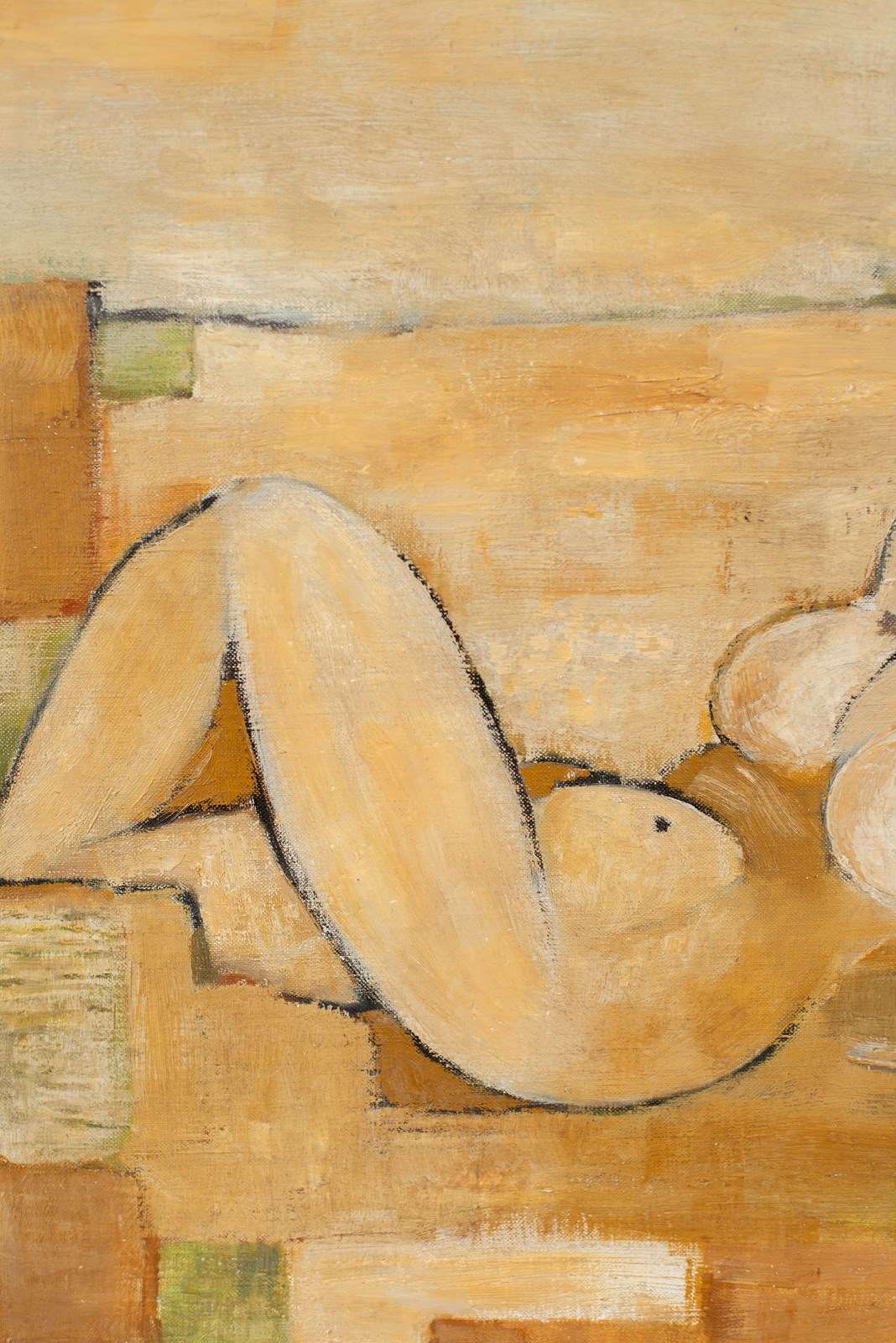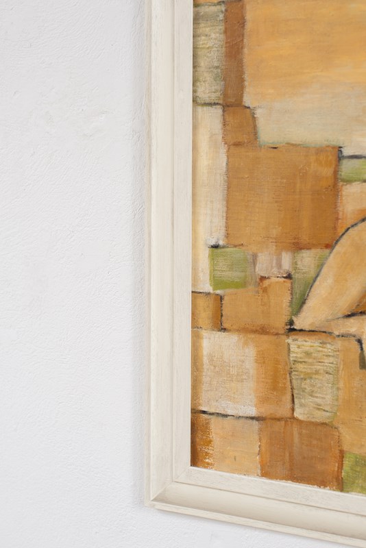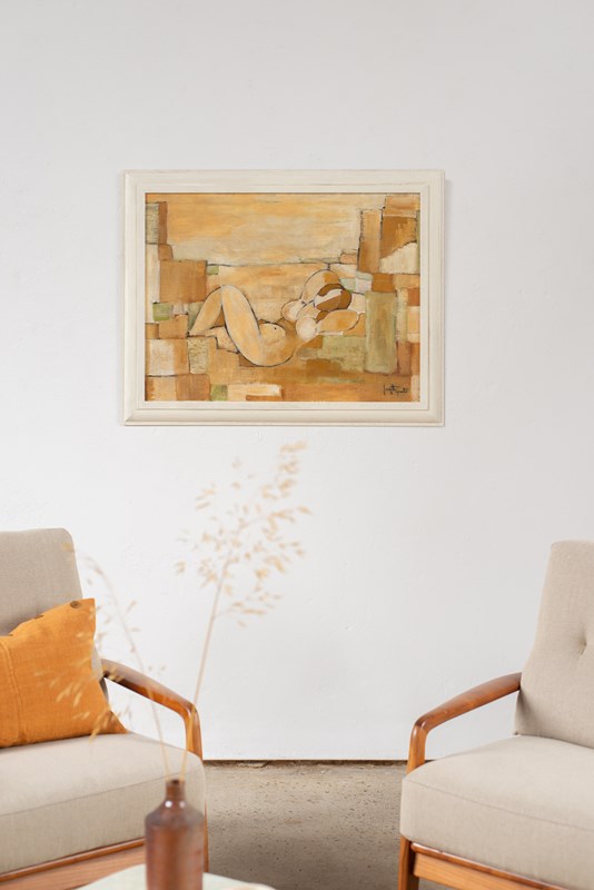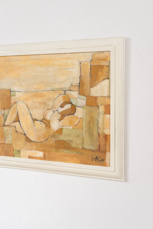 A large-scale cubist painting of a nude in acrylic on canvas, mounted on board, signed and dated 1976. The artist uses graphic blocks of carmel, tan, soft green and white within a defined soft-black outline.  Presented in a bespoke glazed, hand-painted wooden frame.