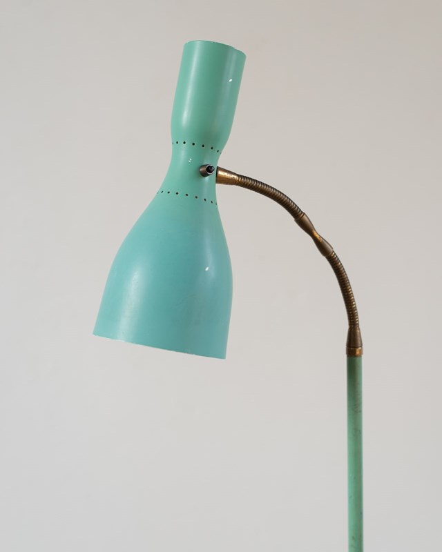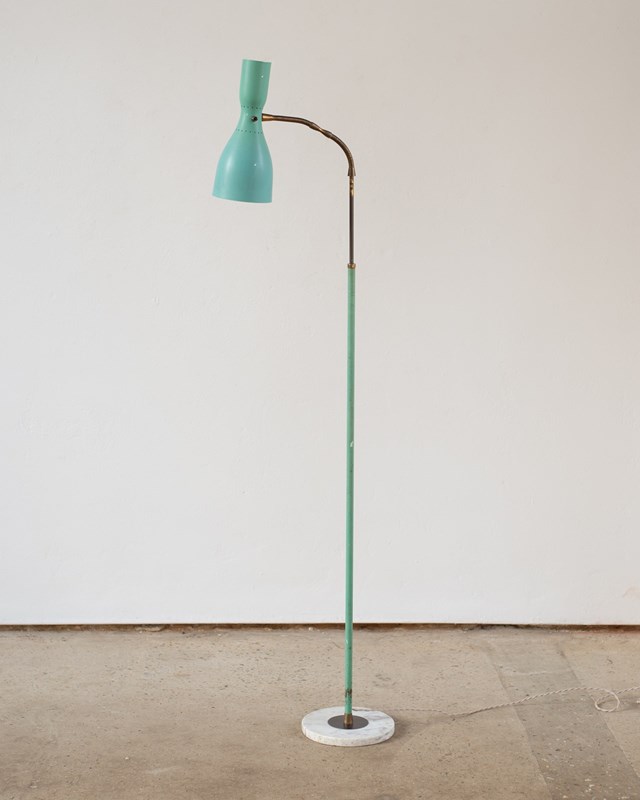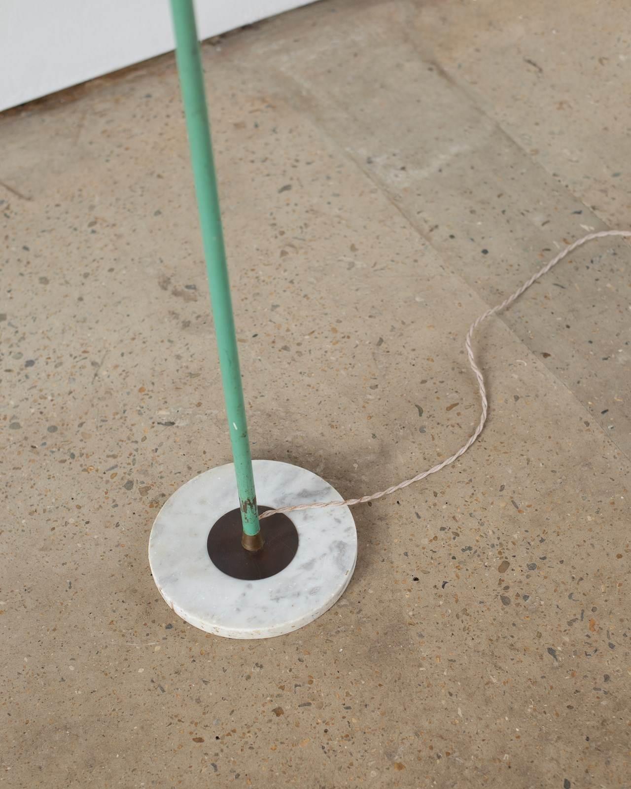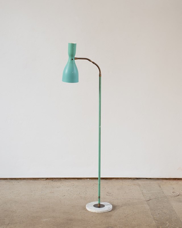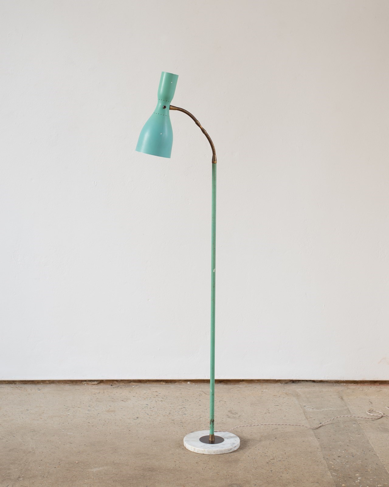 A brass and marble floor lamp, with original blue-green aluminium double-lamp shade, from Italy, C1950. The double lamp gives both an up and down light, which can be switched on and off separately. Adjustable along the brass pole, with a beautifully crafted goose-neck.