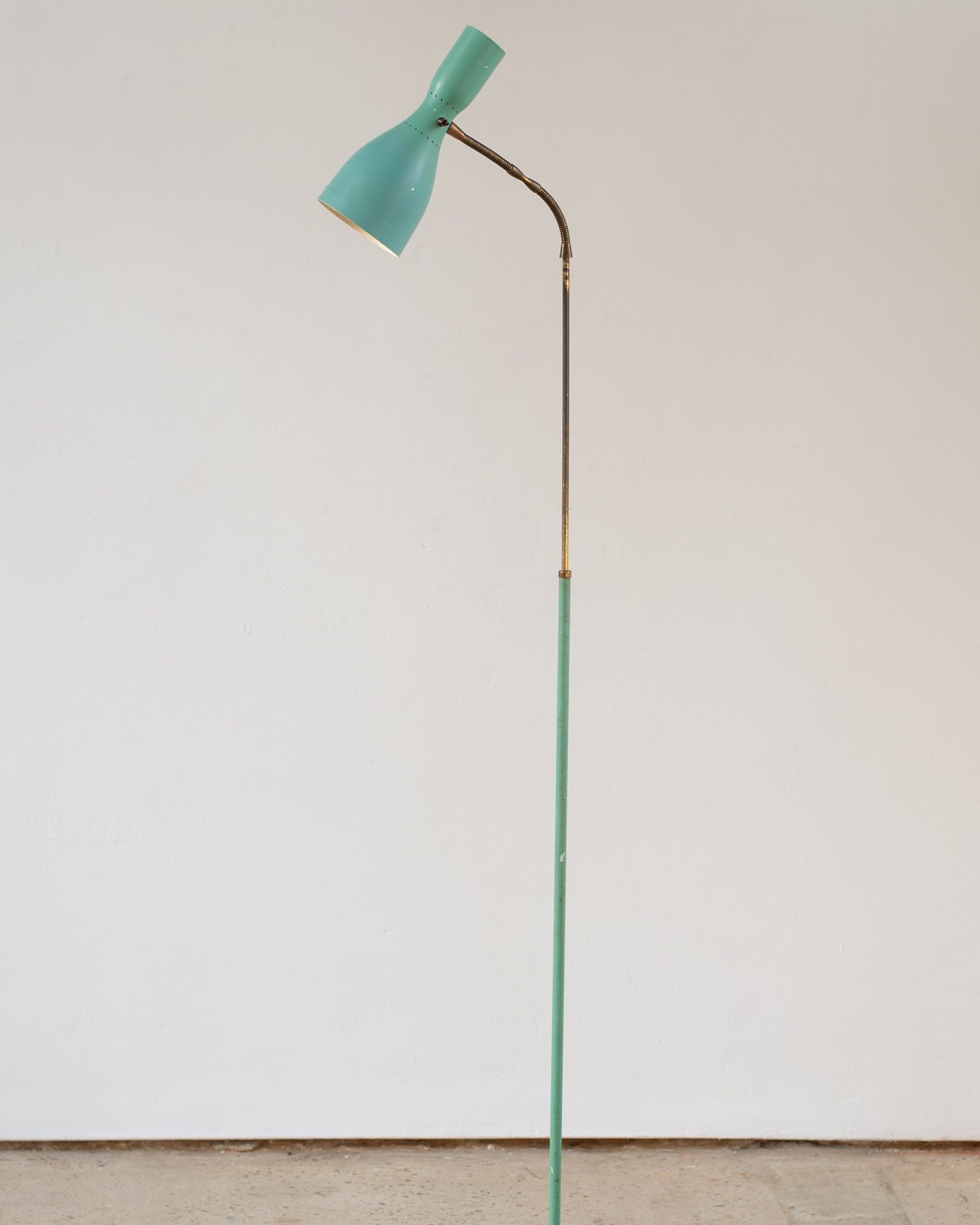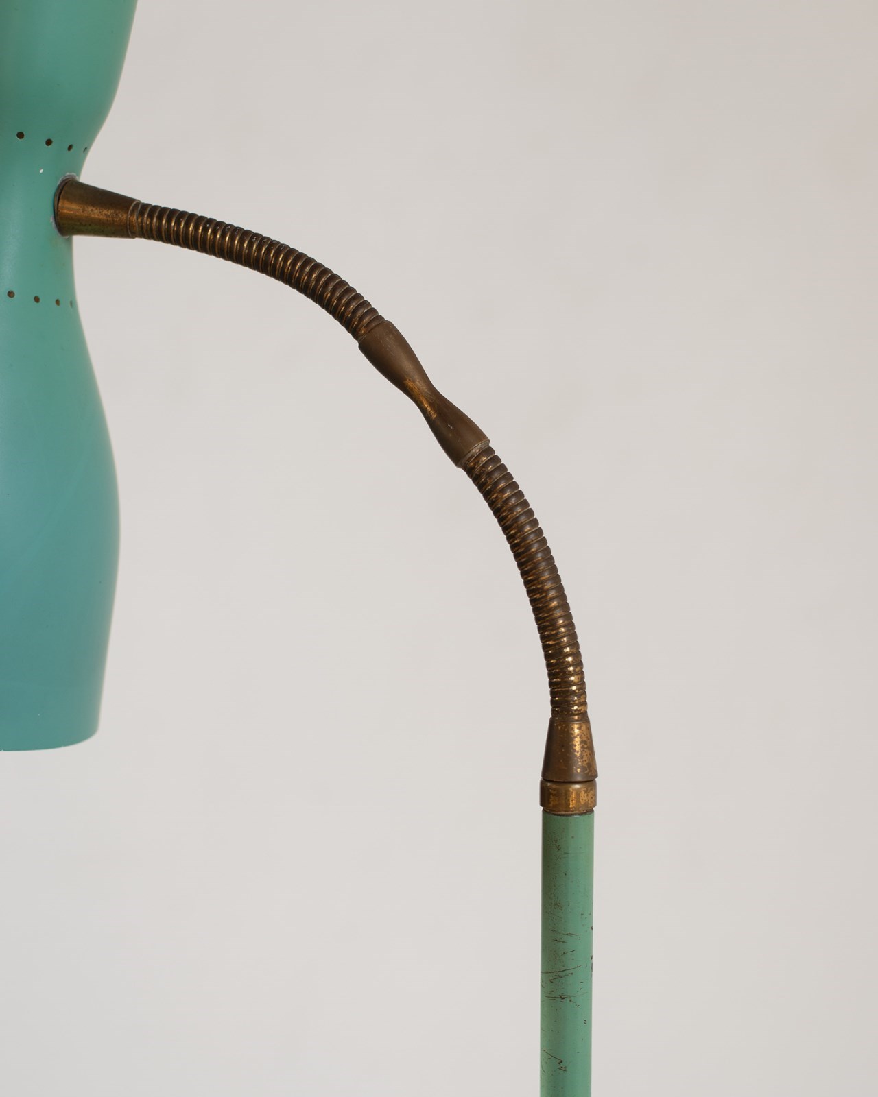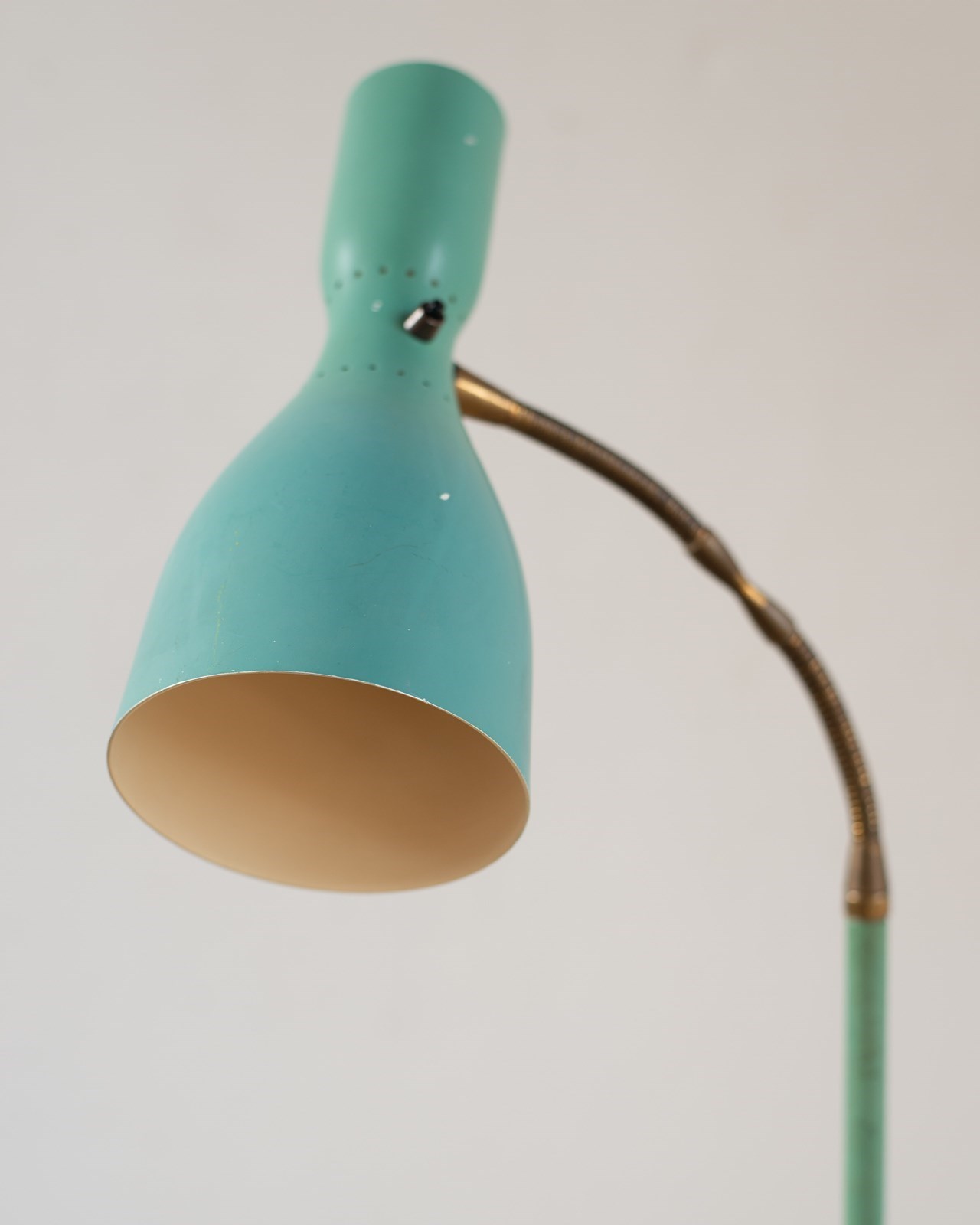 A brass and marble floor lamp, with original blue-green aluminium double-lamp shade, from Italy, C1950. The double lamp gives both an up and down light, which can be switched on and off separately. Adjustable along the brass pole, with a beautifully crafted goose-neck.