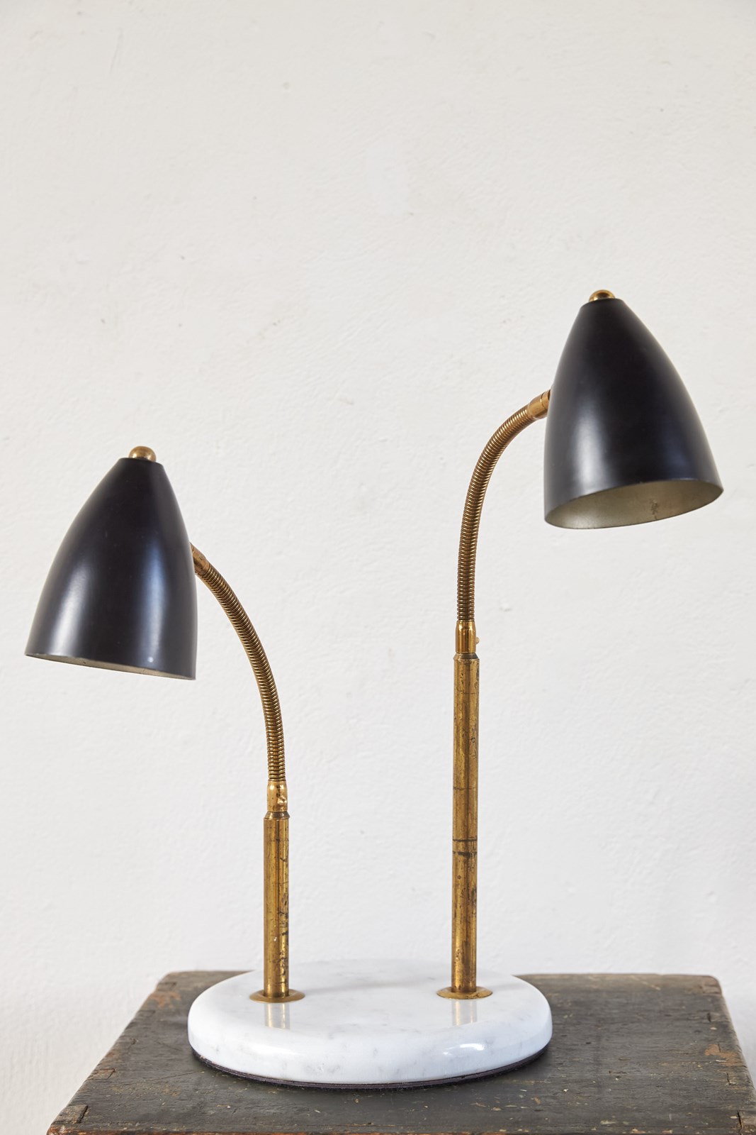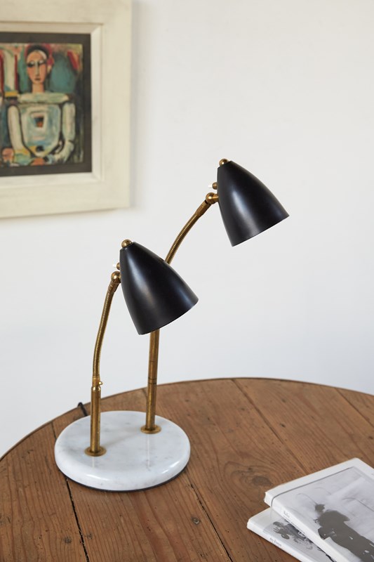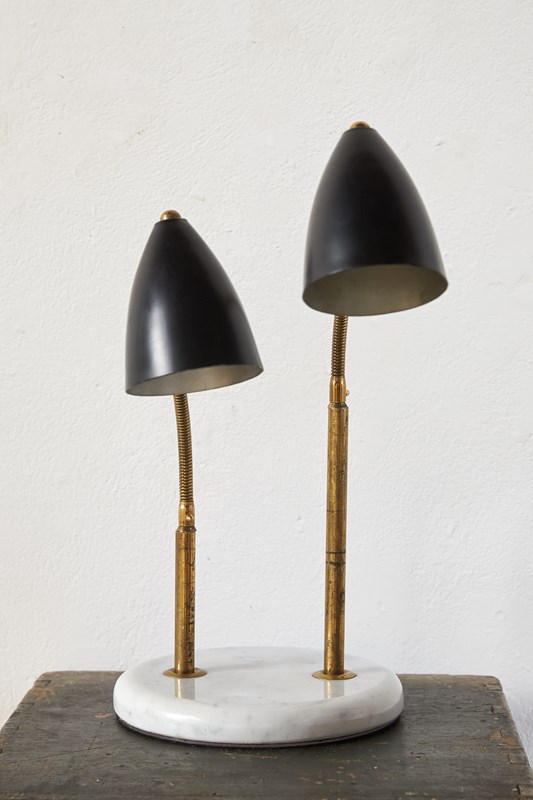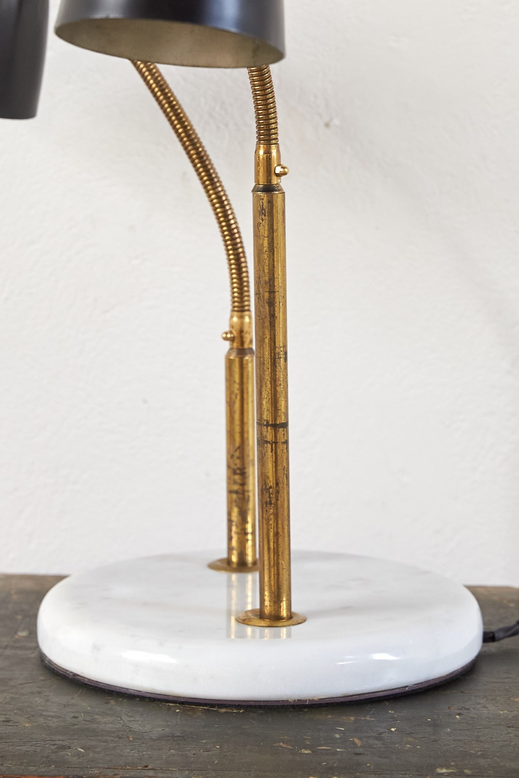 A sculptural double-headed table or desk lamp from Italy, C1950.  Beautifully designed using brass, marble and  black-painted spun aluminium, this is a rare-to-find piece.  Each lamp articulates on its brass pole and at its head, with an on-off switch situated at the base of each shade.