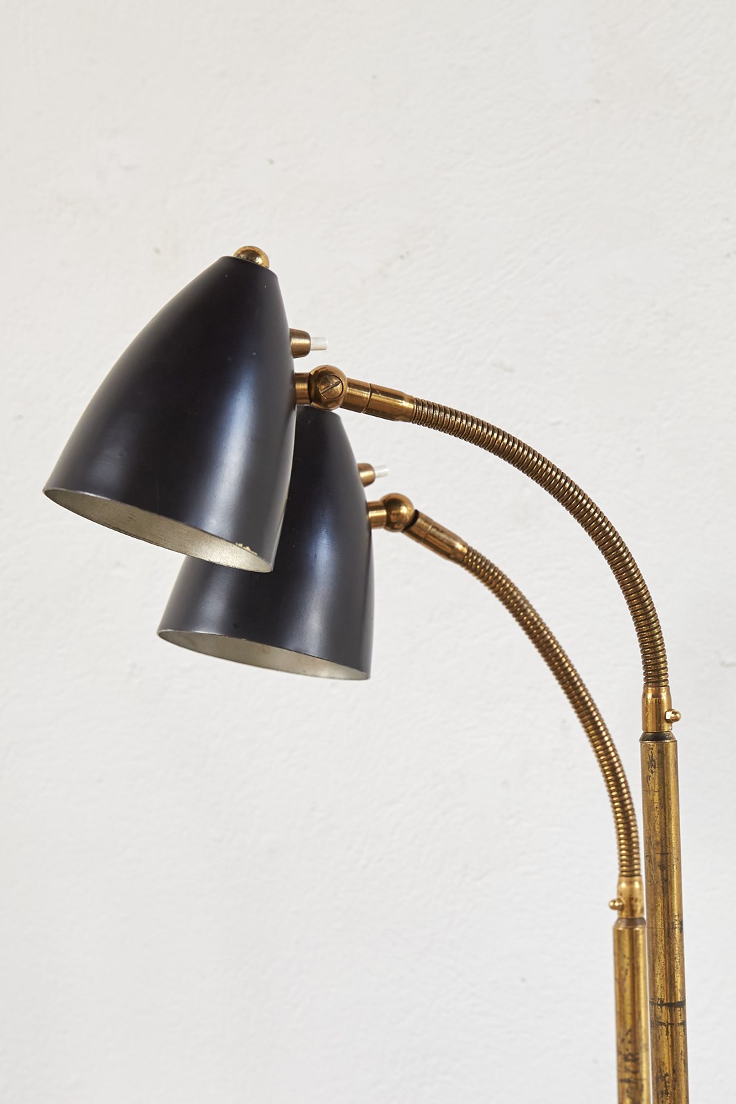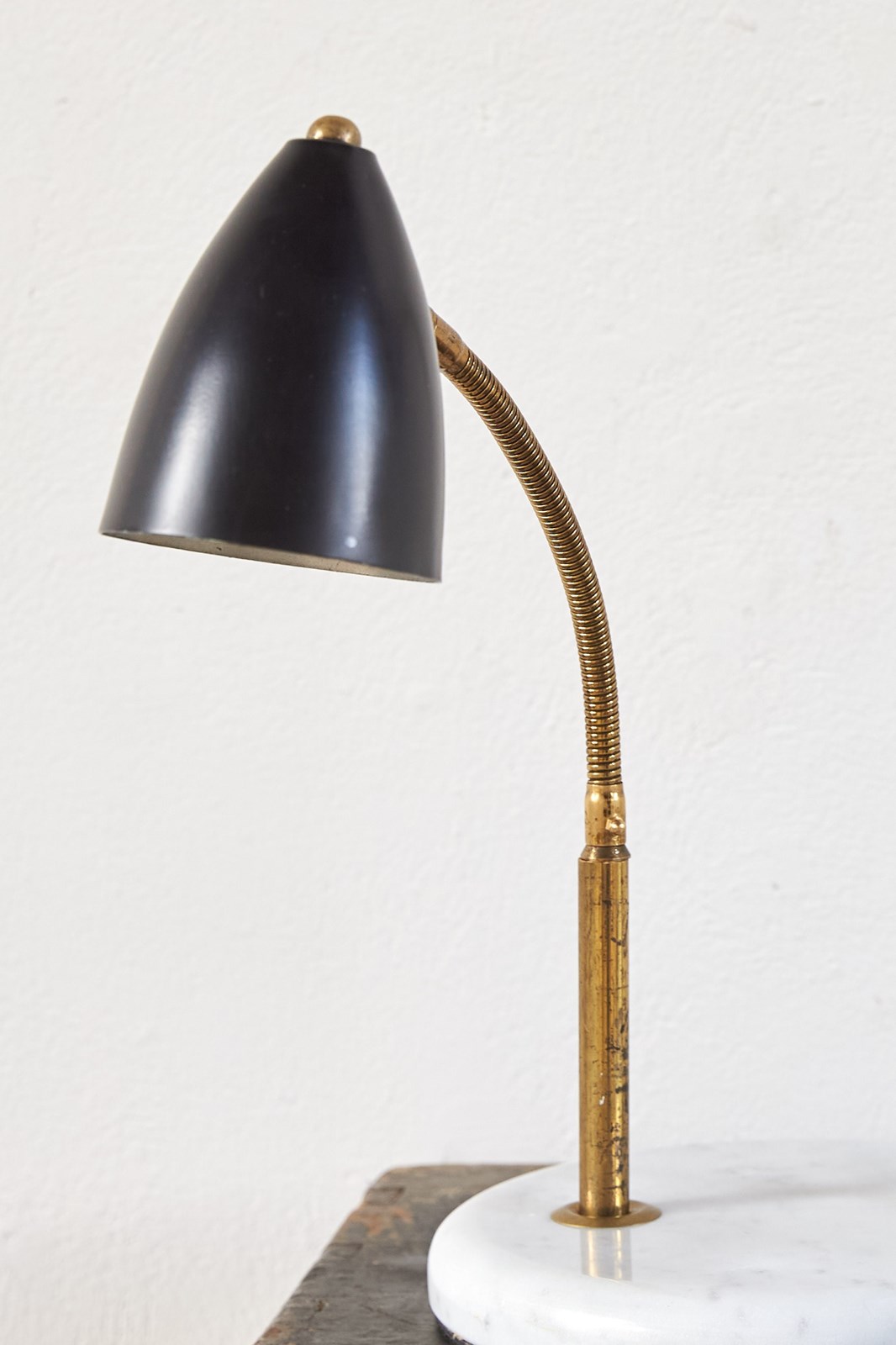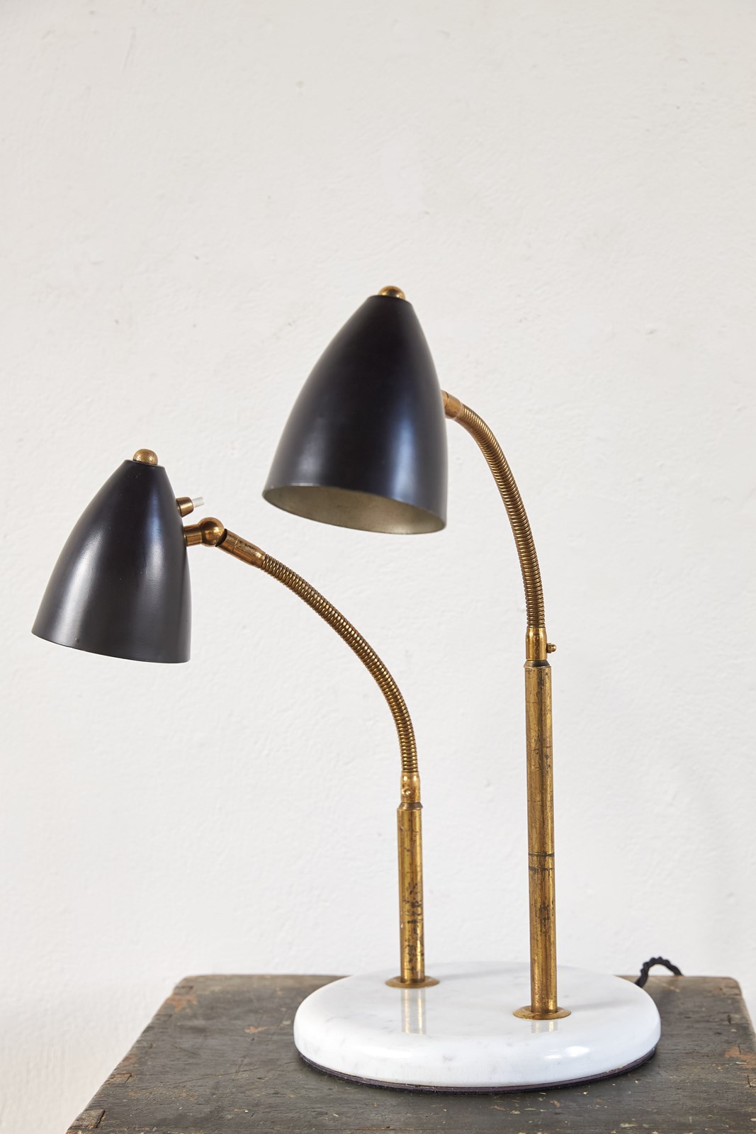 A sculptural double-headed table or desk lamp from Italy, C1950.  Beautifully designed using brass, marble and  black-painted spun aluminium, this is a rare-to-find piece.  Each lamp articulates on its brass pole and at its head, with an on-off switch situated at the base of each shade.