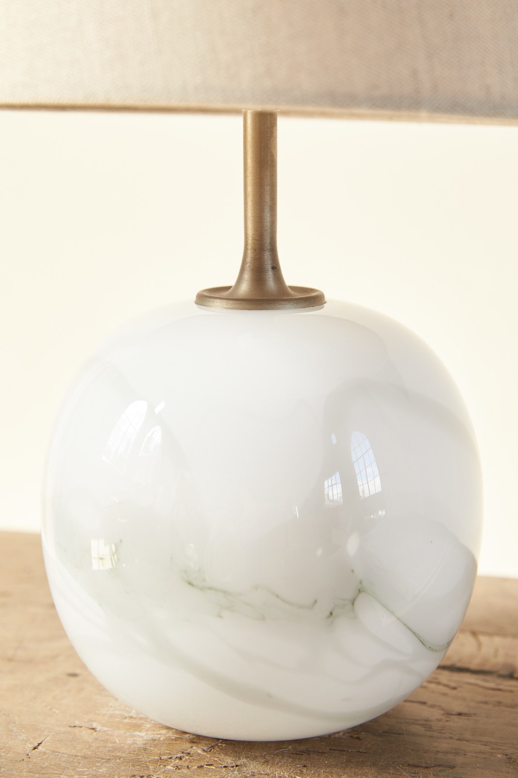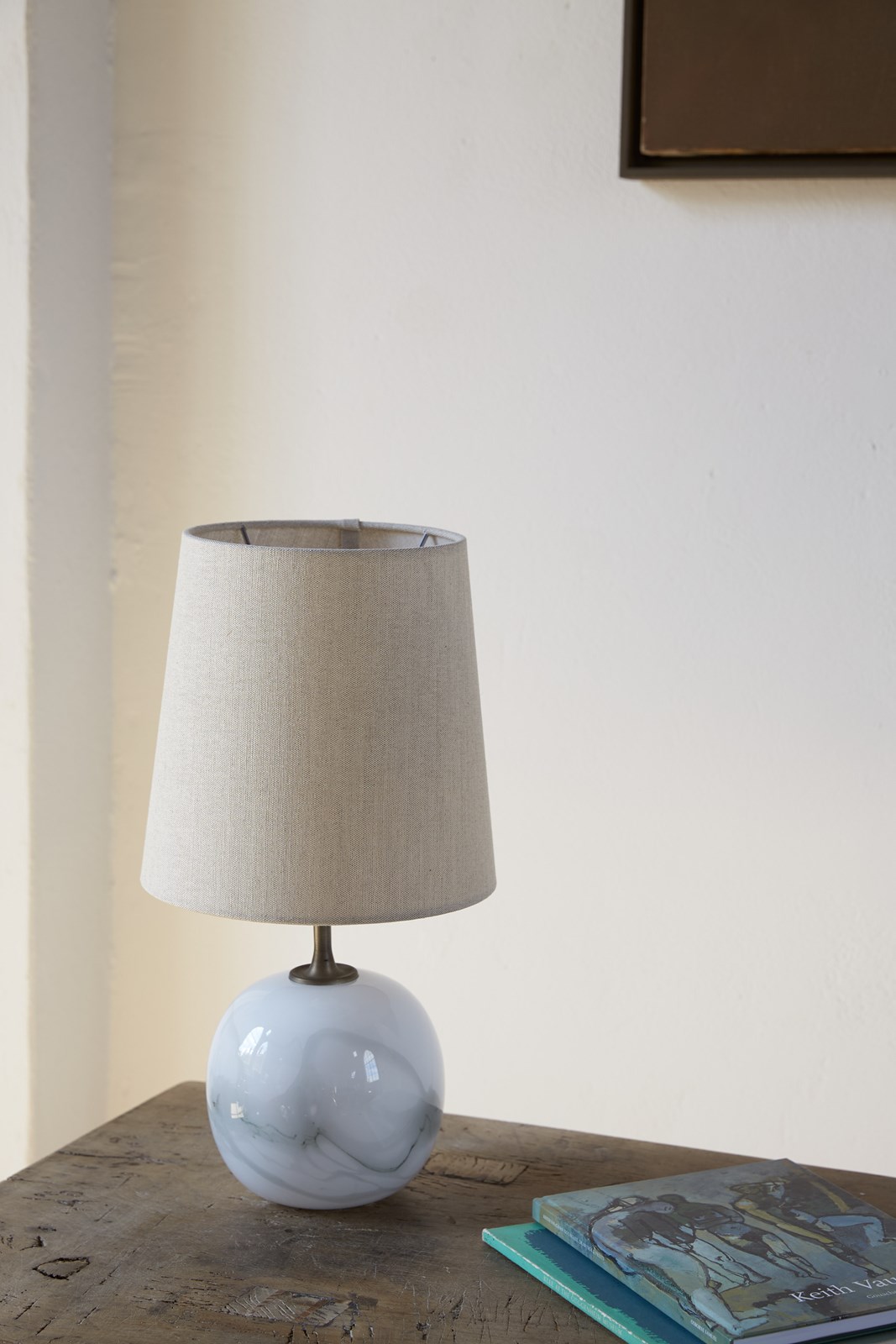 A spherical glass table lamp by Michael Bang for Holmegaard, Denmark's oldest and most renowned glassworks. Created in opal white glass with grey-toned marbled decoration, and a brushed nickel rod, C1980.  Finished with a bespoke natural linen shade, which is set on the original fitting, allowing the shade to be heightened and lowered.