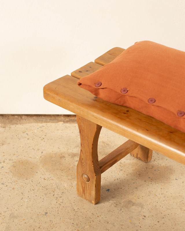 A handsome mid century slatted pine bench from France, C1960. Generously sized and in very good condition, this would work as a hallway or end of bed bench or long slim table to hold books and throws.