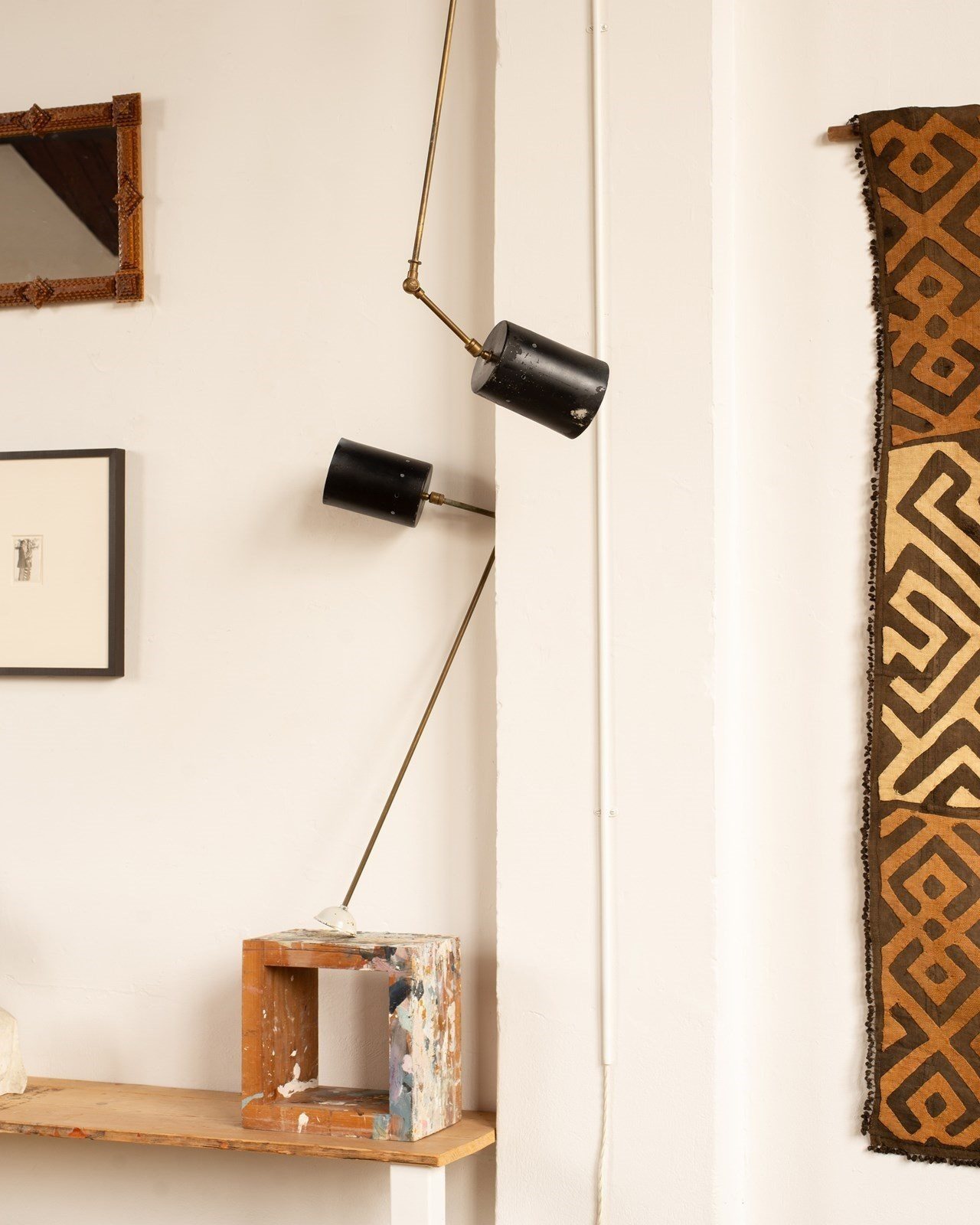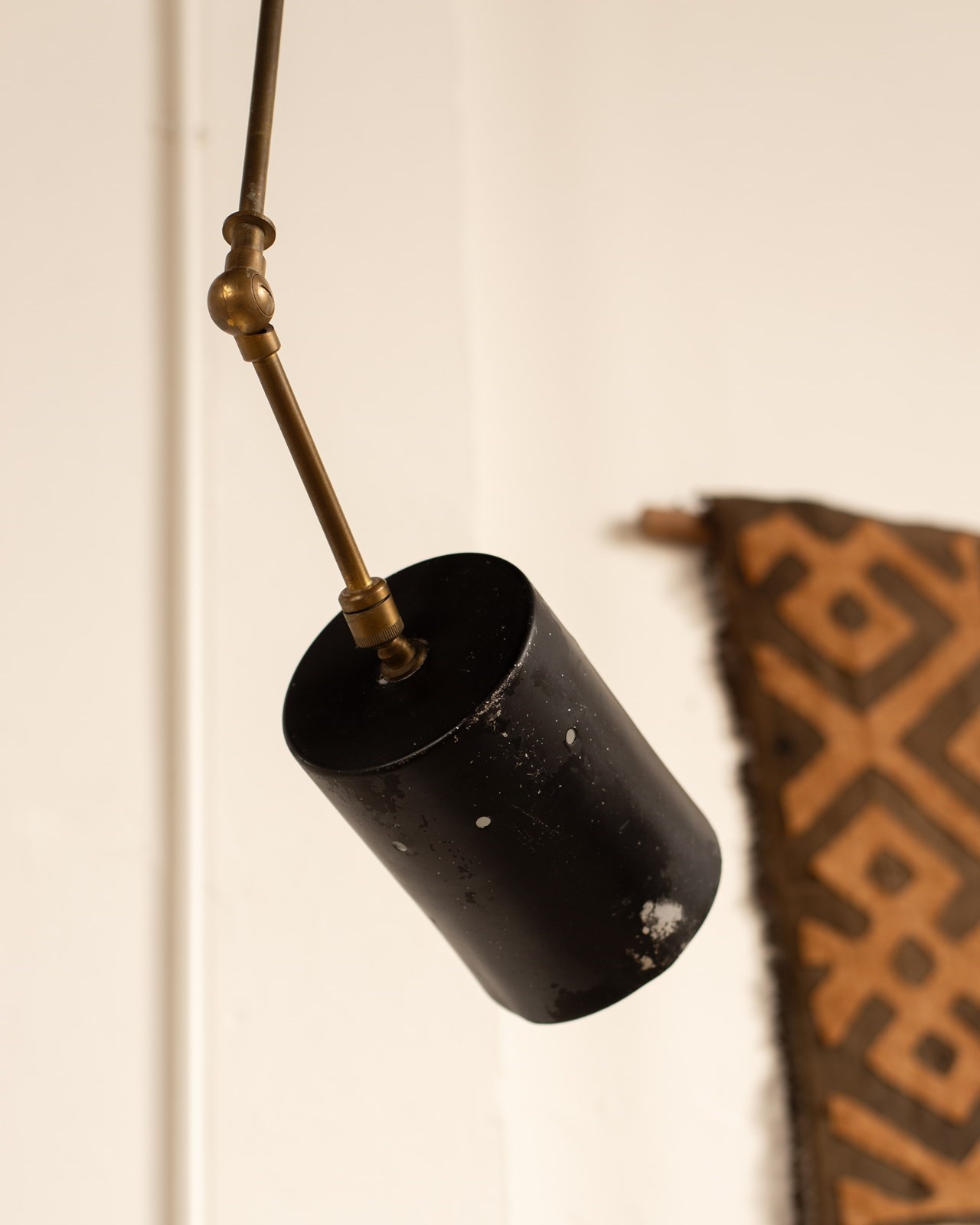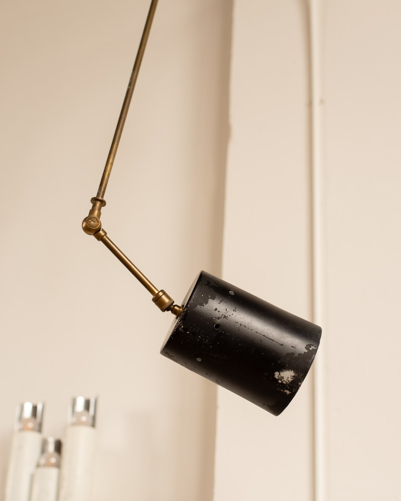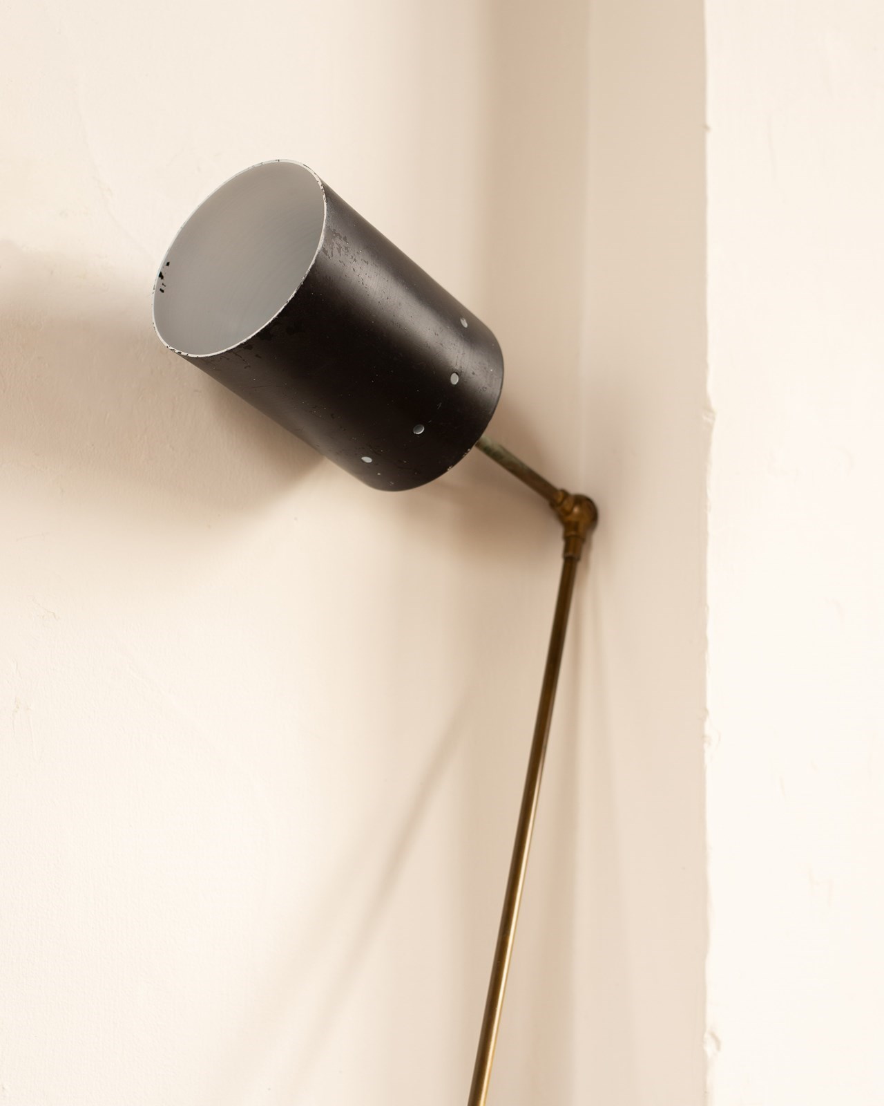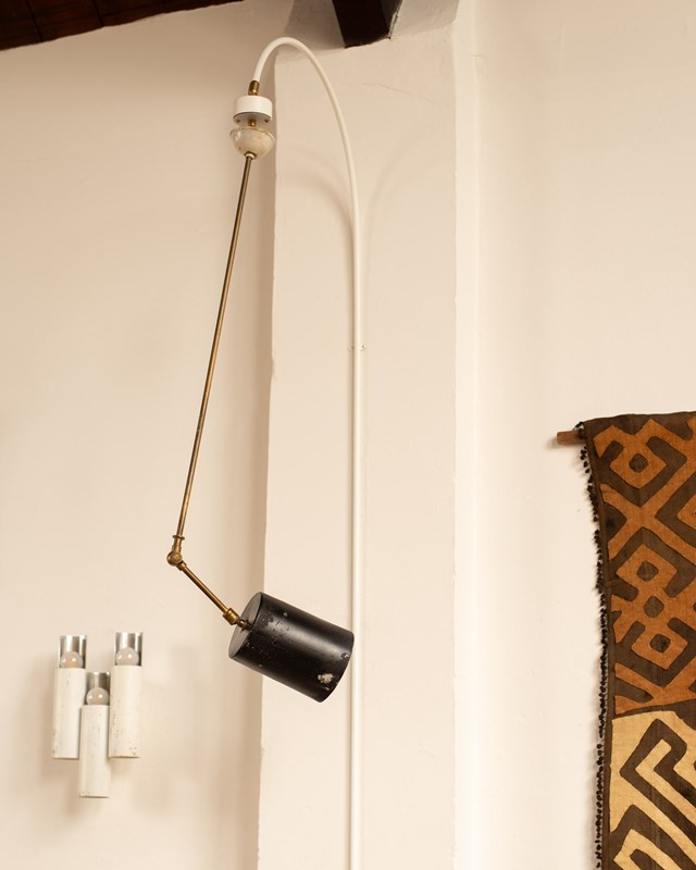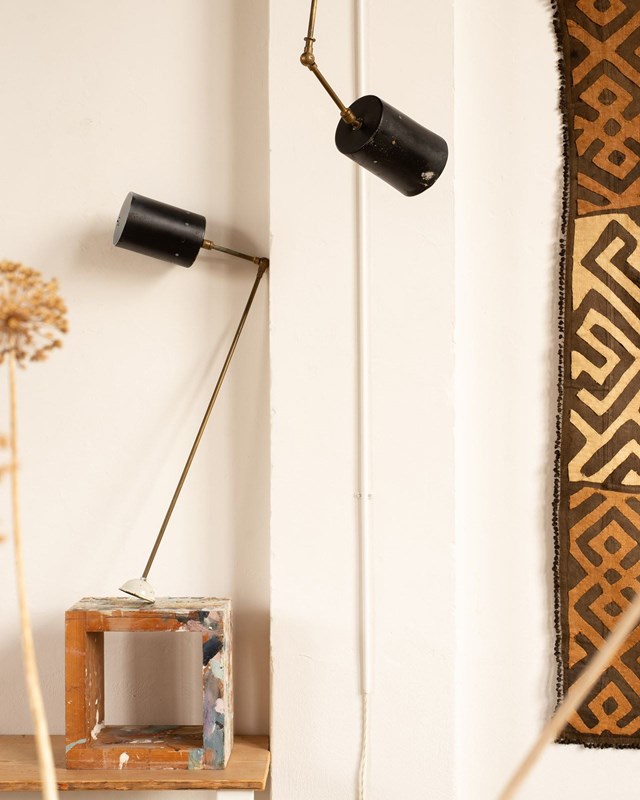 he cylindrical shade is attached via an articulated arm, and also has a gimble at its base, allowing one to direct the light. All completely original, with some wear to the paint on the shade and oxidisation to the brass. They would be beautiful as reading lights, perhaps on either side of a bed.