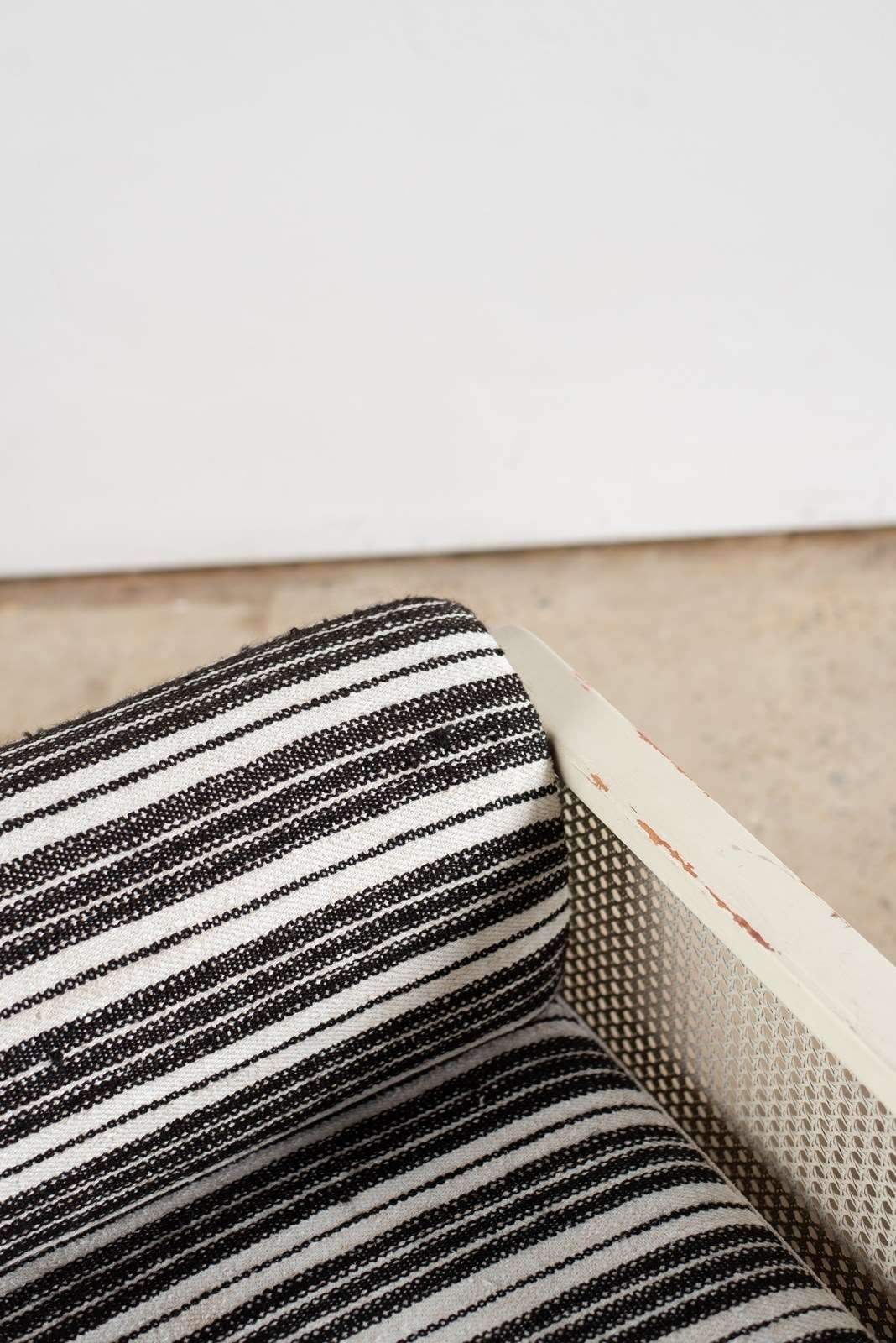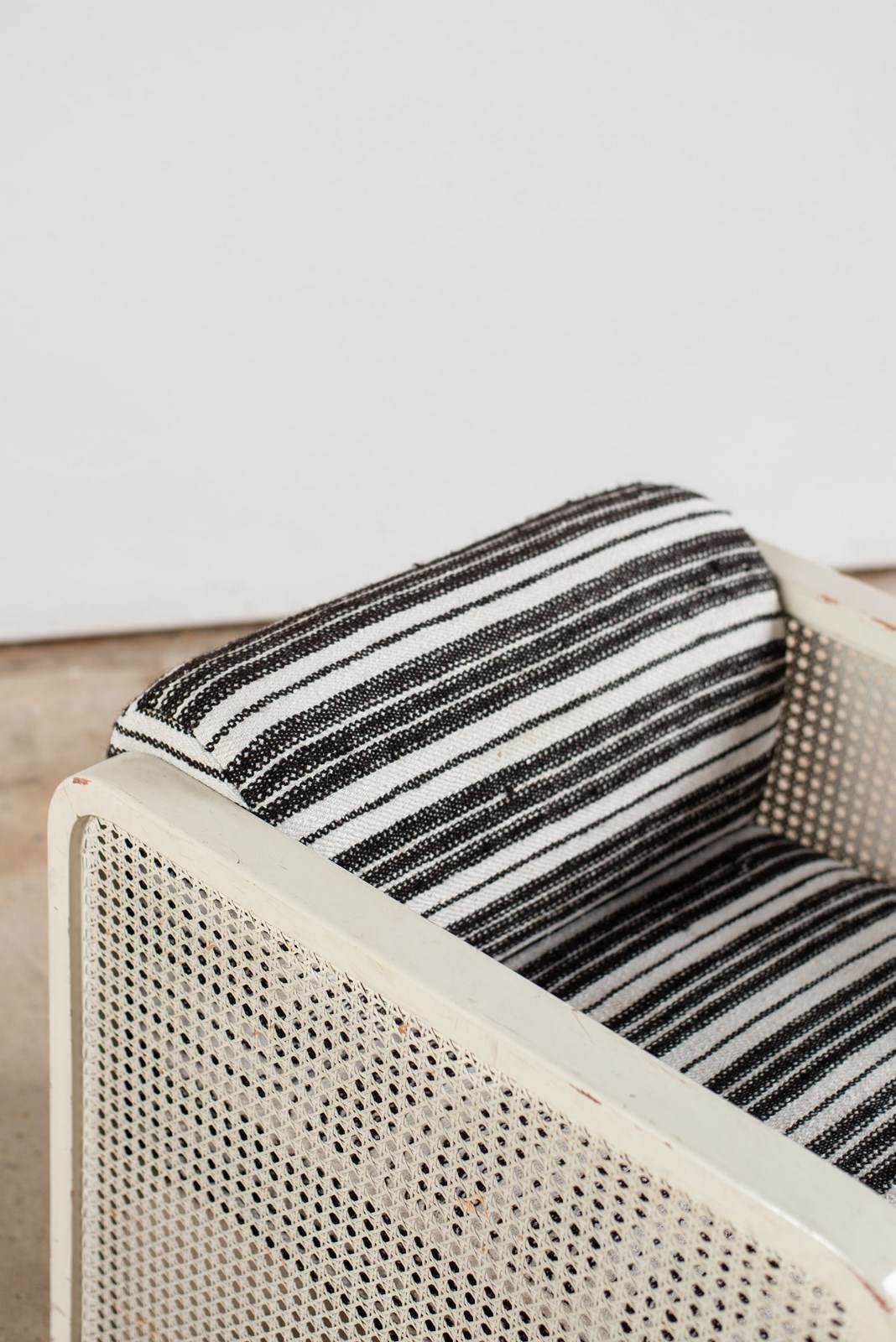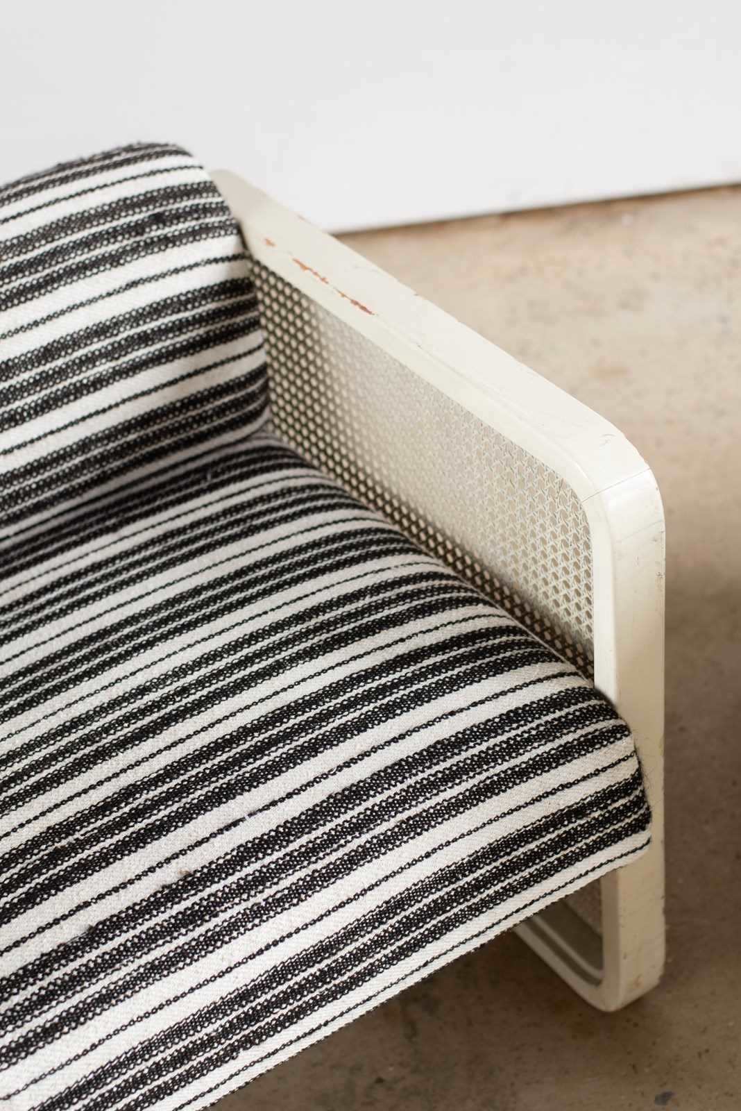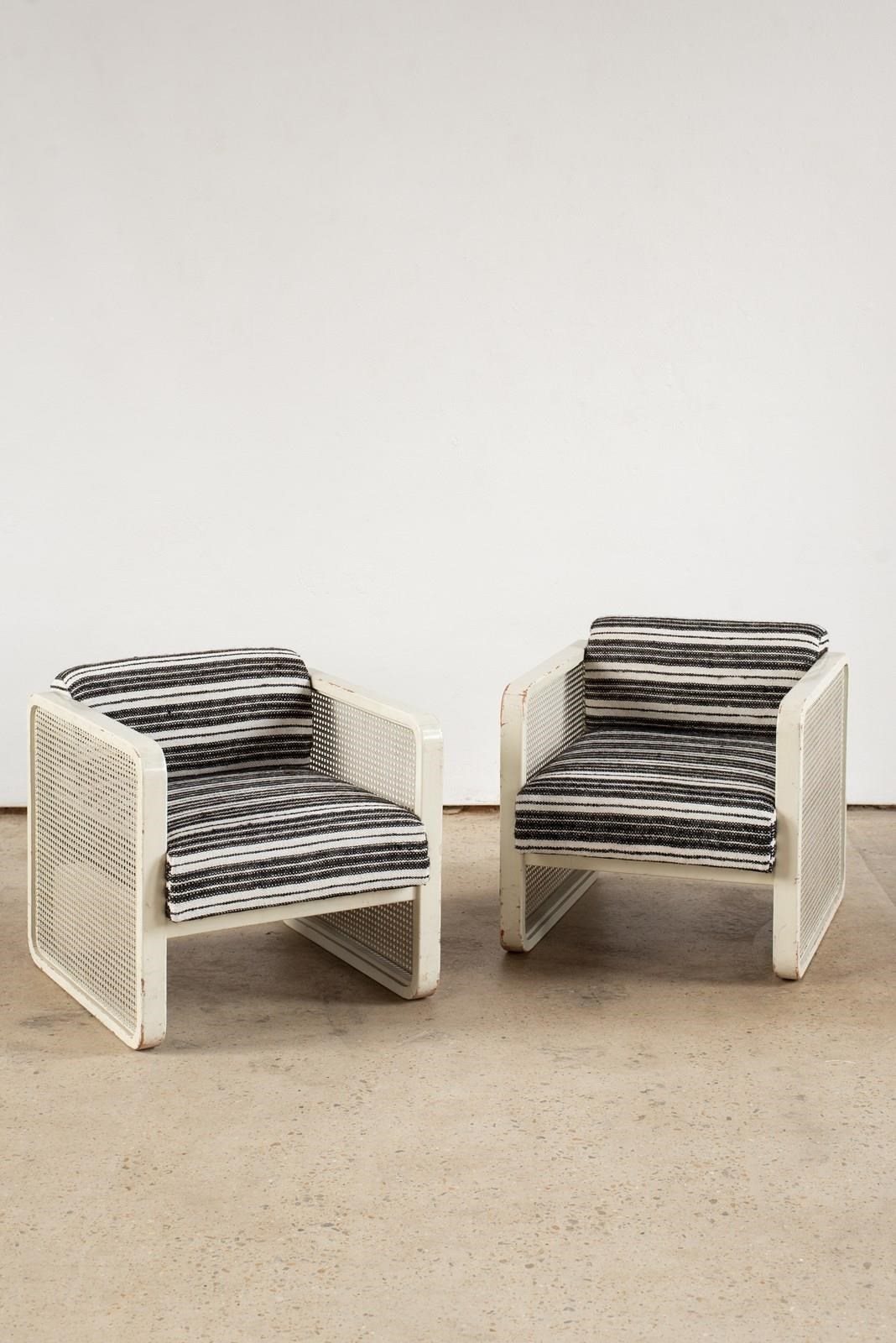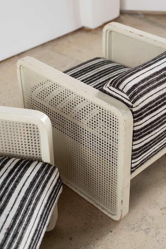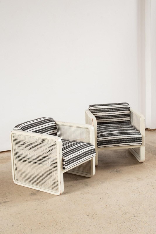 A pair of 1970s cube chairs with rattan sides and a historic stone painted finish, which shows some age. The chairs have been fully reupholstered, using a handspun and handwoven antique hemp in stripes of black/brown on an undyed base.