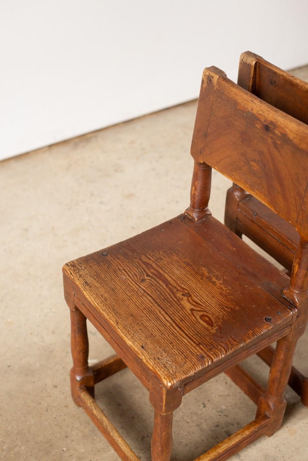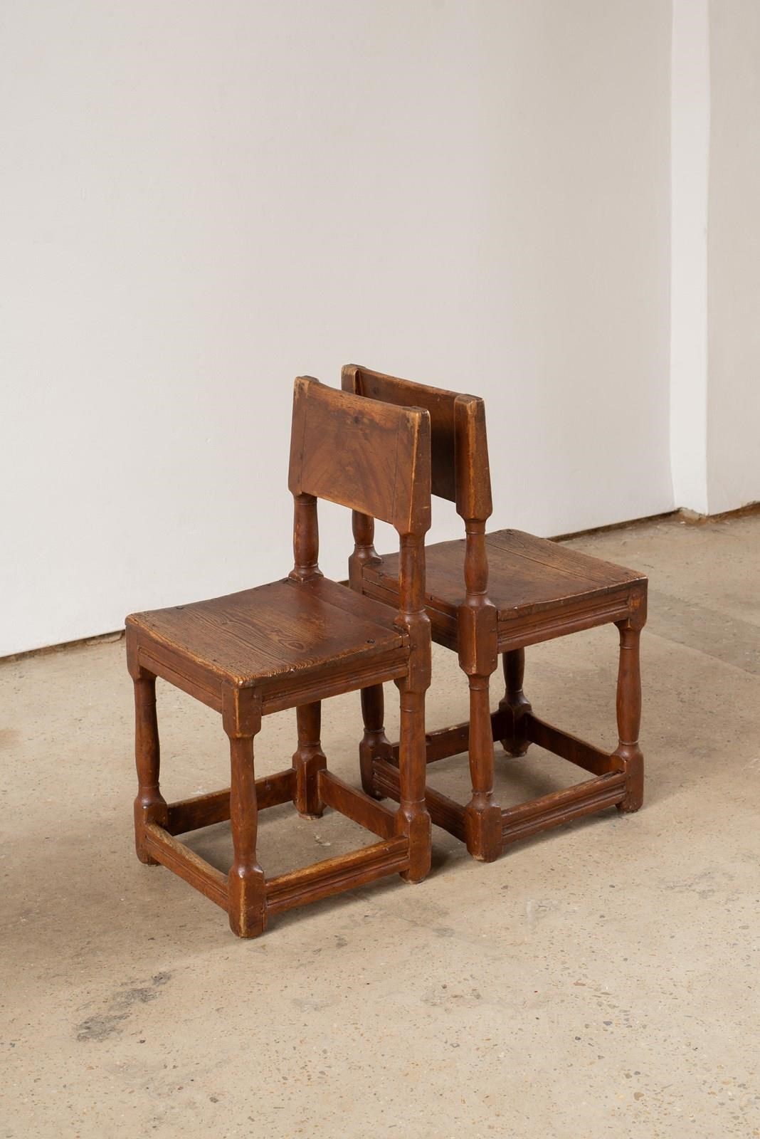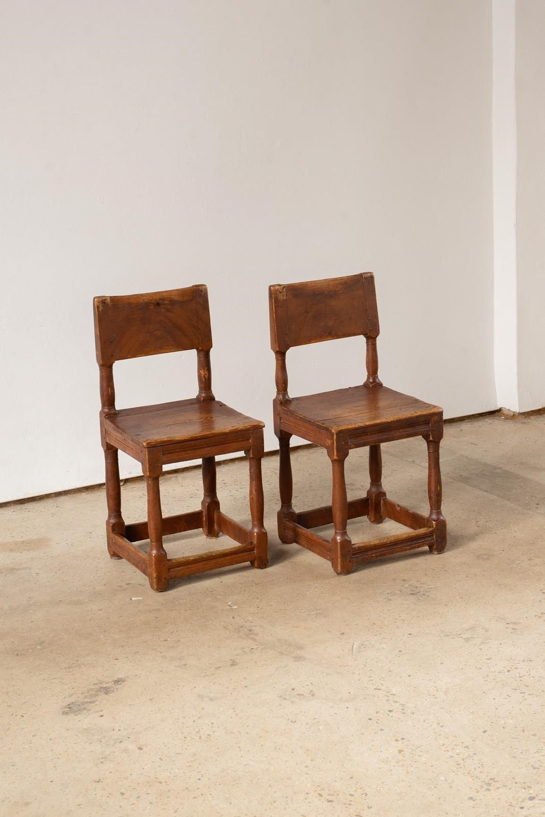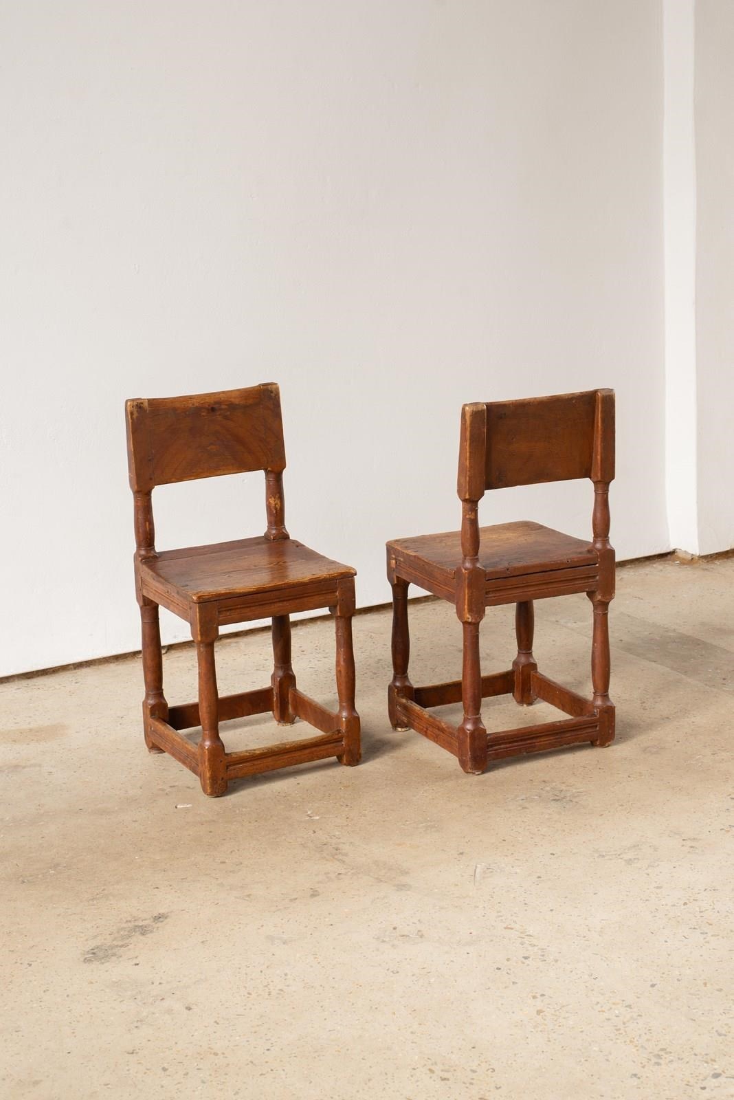 A pair of 19th-century Swedish oak hall chairs, with remnants of their original reddish-brown painted surface evident. Both are structurally sound and could be used as occasional seating. Wonderful on either side of a console.