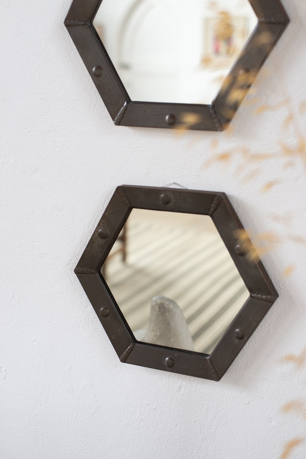 A pair of pewter mirrors, C1920. They are hexagonal in shape, and have their original circular glass intact, which shows some very light spots of age. Strung with a simple wire cord.
