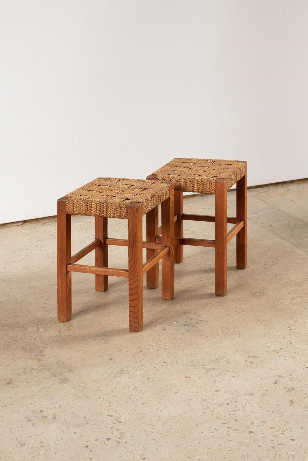 A pair of square pine stools with their original woven sisal cord seats intact, C1960. They are in very good condition and have an elegance to their rather strict silhouette.