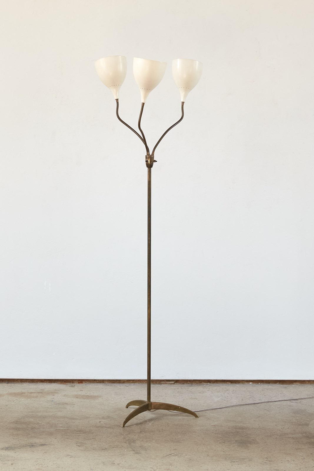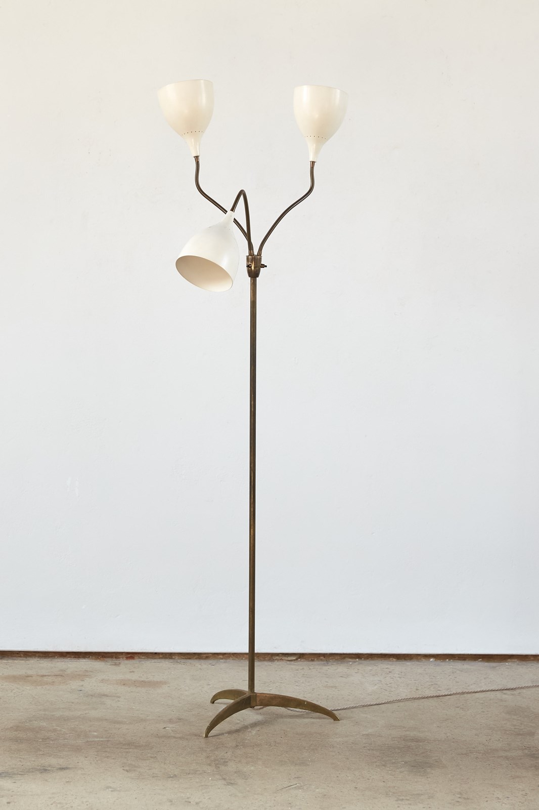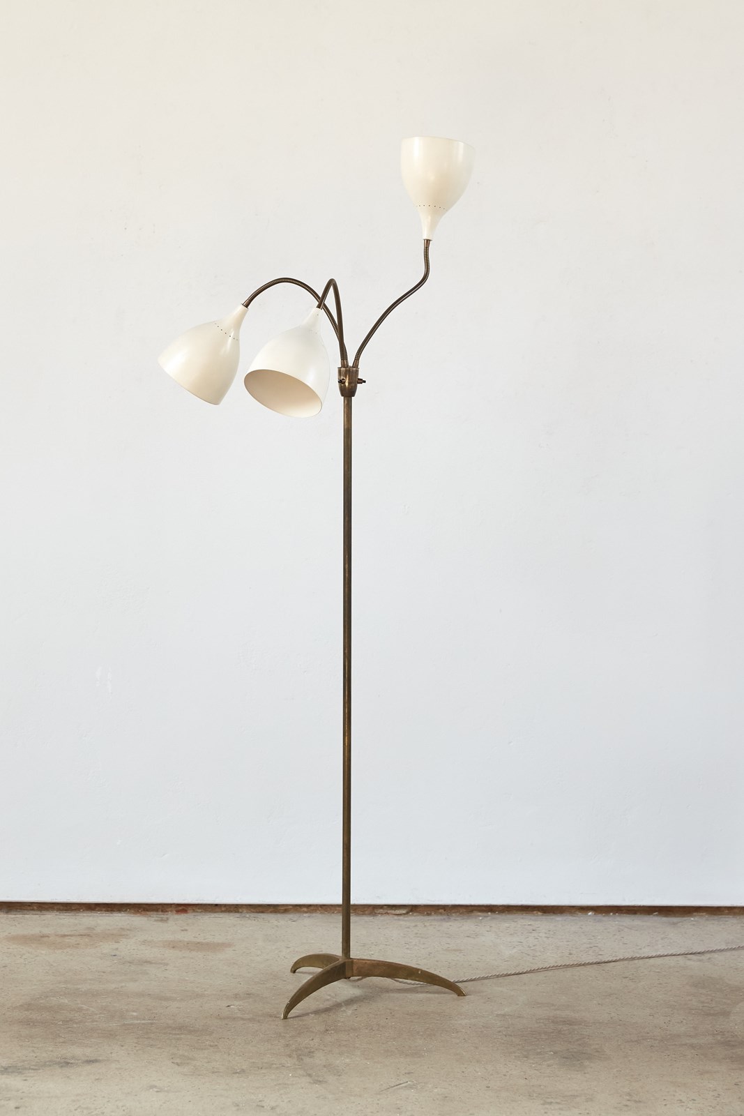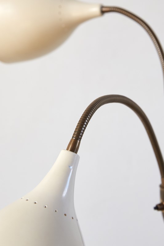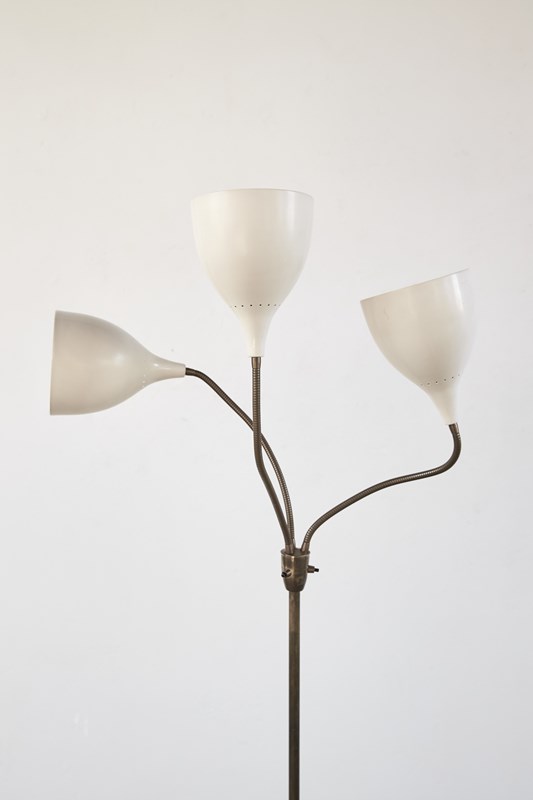A striking 1950s floor lamp by the renowned Italian maker Stilnovo (marked). Beautifully designed, it features three creamy off-white shades, each poised on its own adjustable gooseneck, rising from a brass tri-foot base.  This piece is in very good vintage condition and has been professionally rewired and PAT tested.