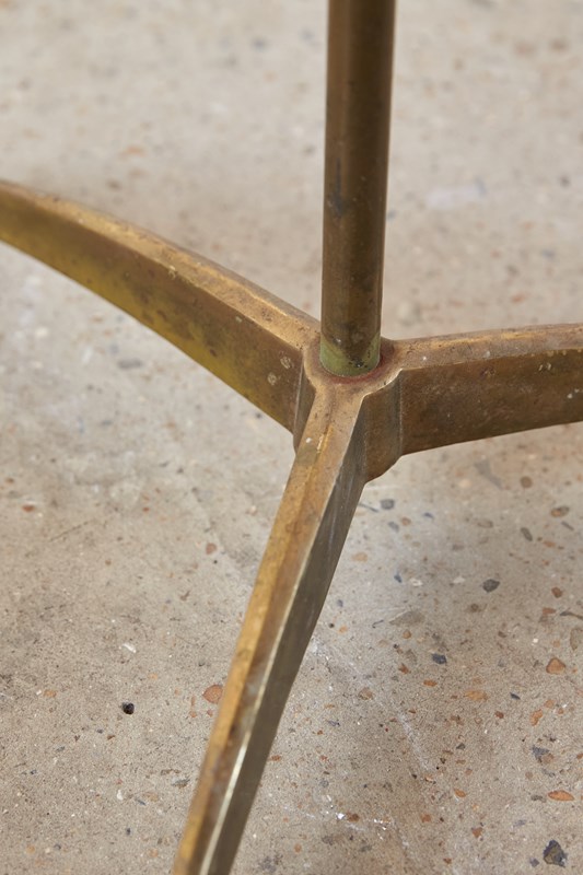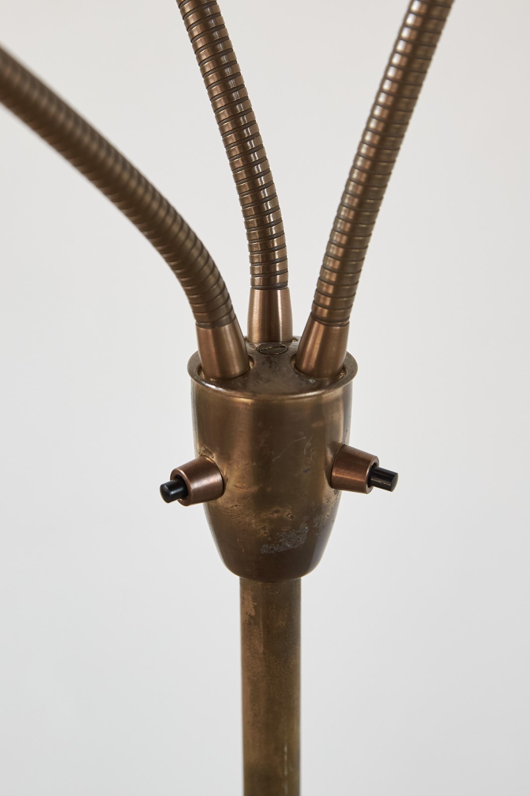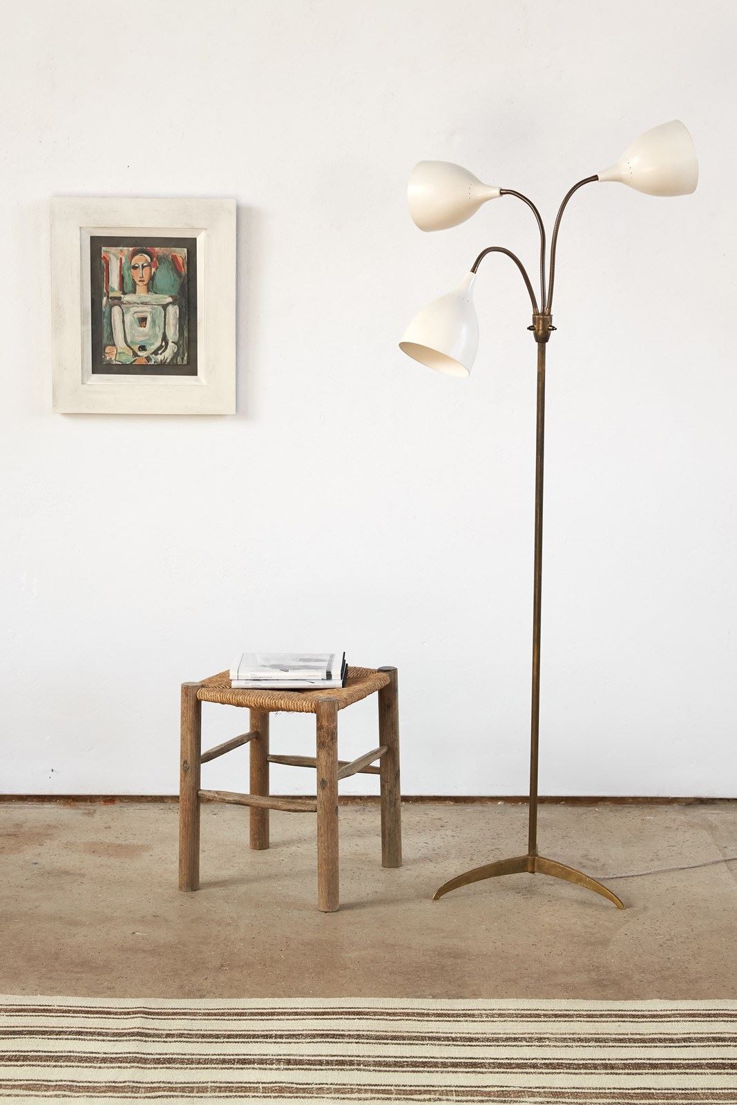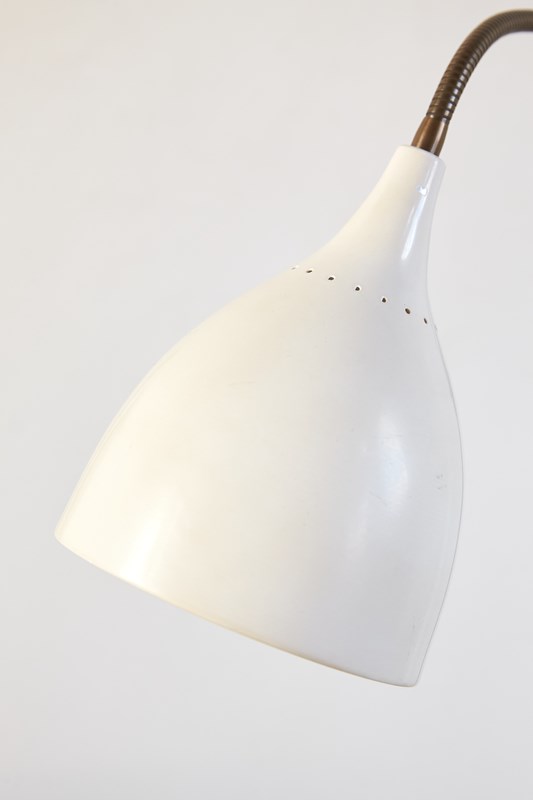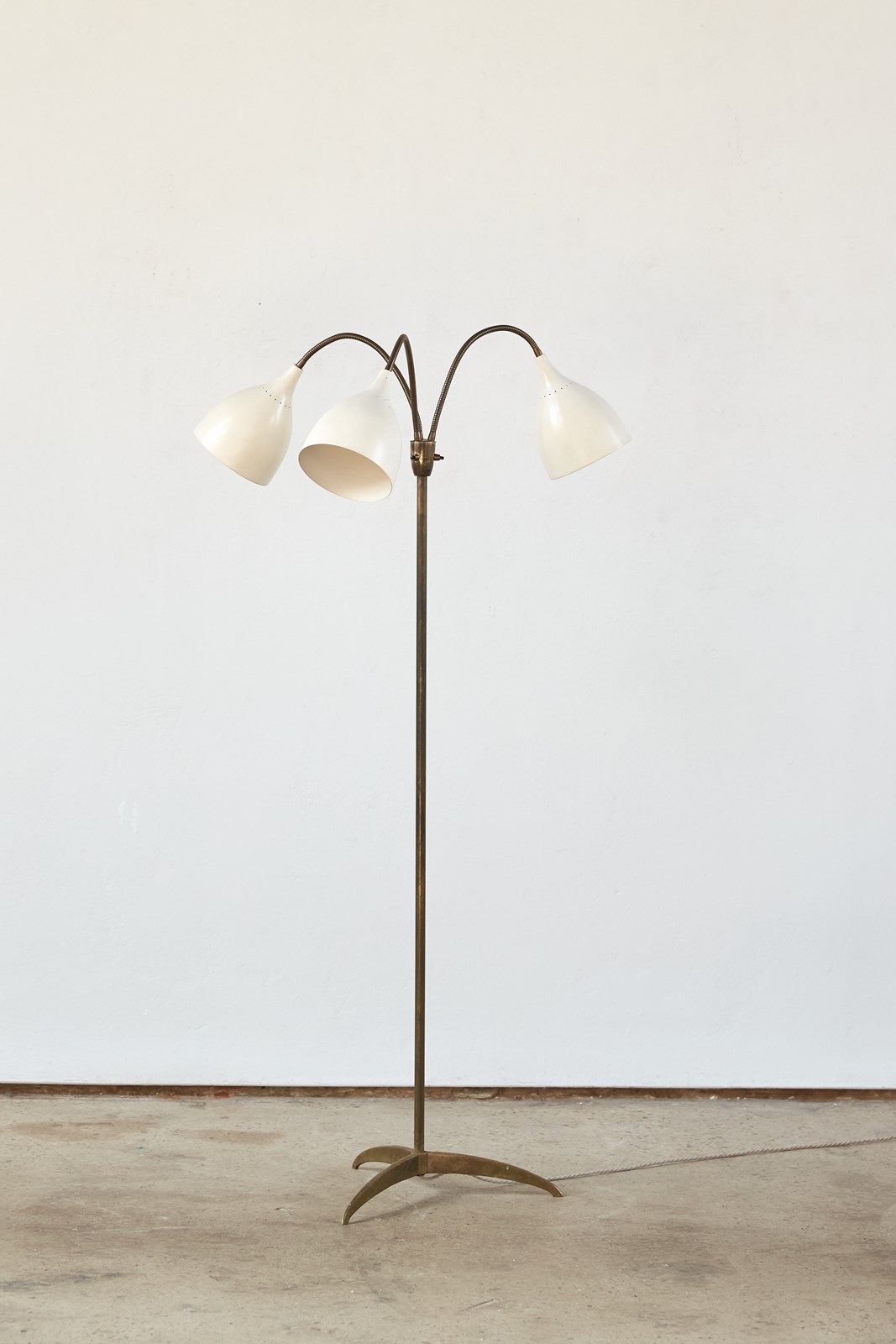 A striking 1950s floor lamp by the renowned Italian maker Stilnovo (marked). Beautifully designed, it features three creamy off-white shades, each poised on its own adjustable gooseneck, rising from a brass tri-foot base.  This piece is in very good vintage condition and has been professionally rewired and PAT tested.