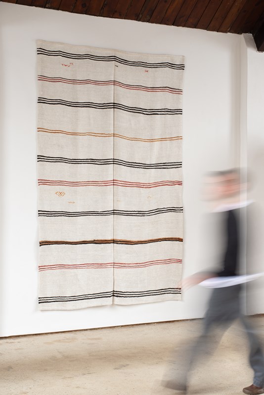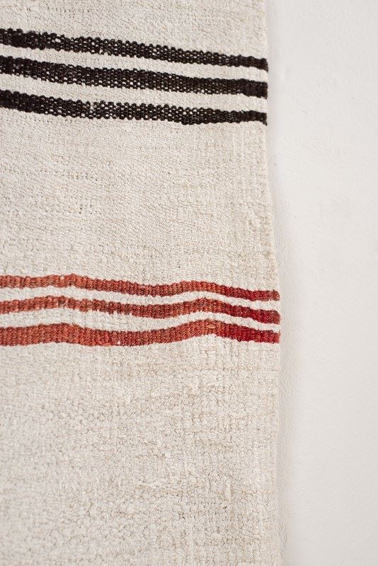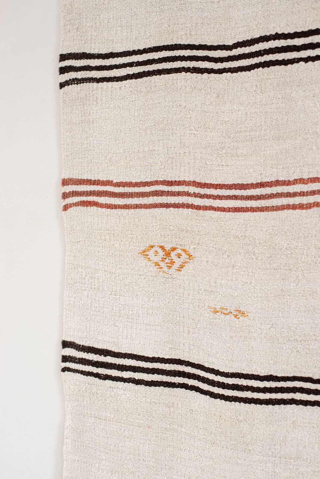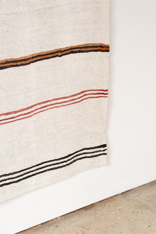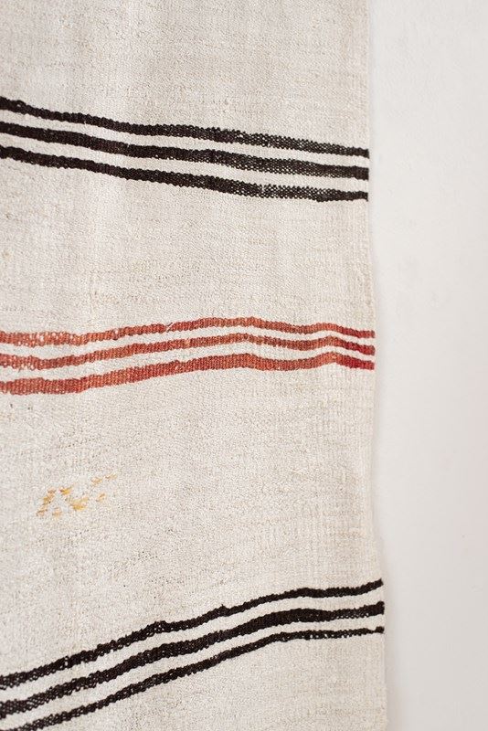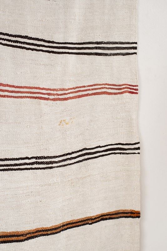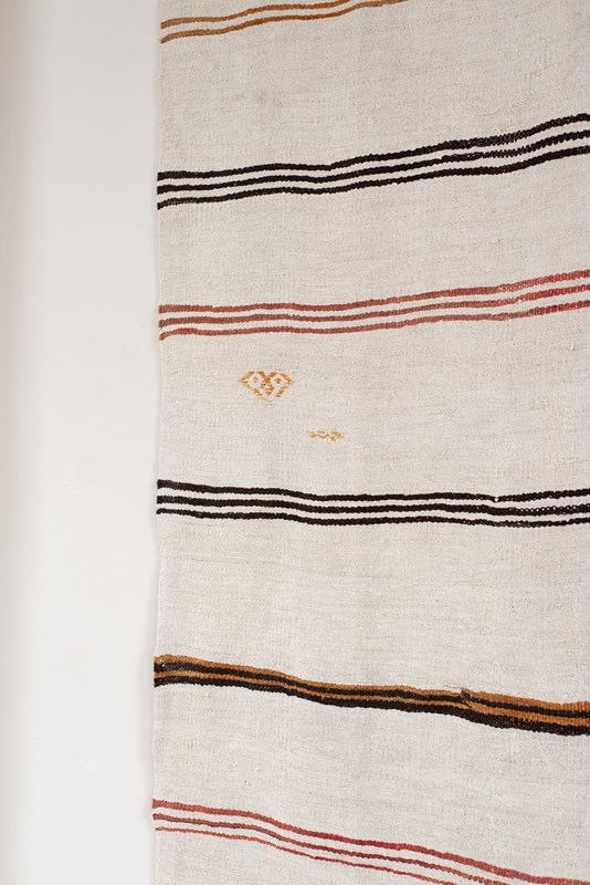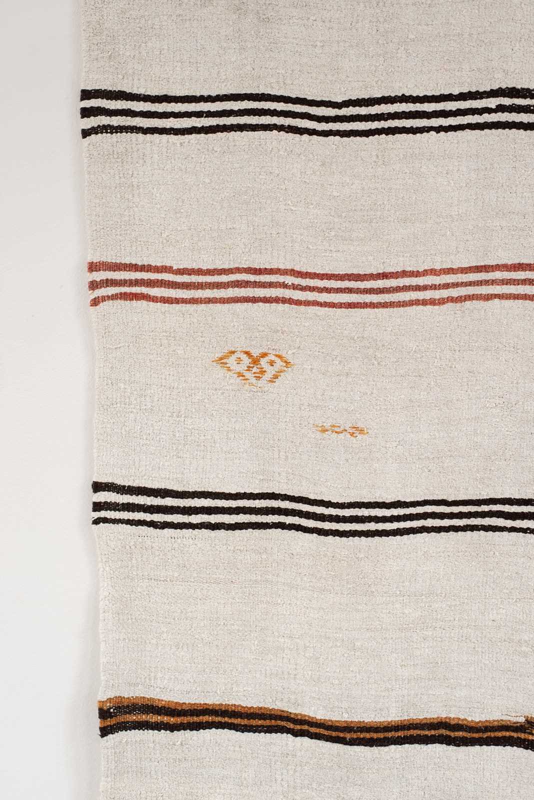 A vintage flat weave Kilim from Turkey, C1960.  Woven using a mix of soft undyed and dyed hemp in ivory, rich brown, russet and caramel stripes. The piece has been finished with hand-embroidered graphic symbols. All of our rugs are professionally cleaned and restored, meaning they are in good vintage condition.