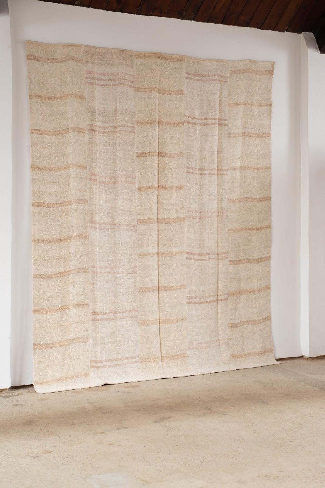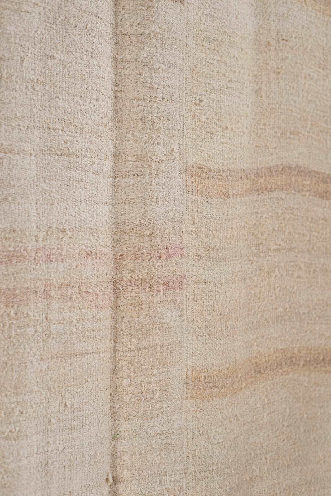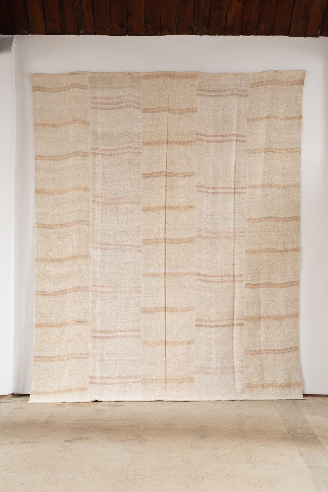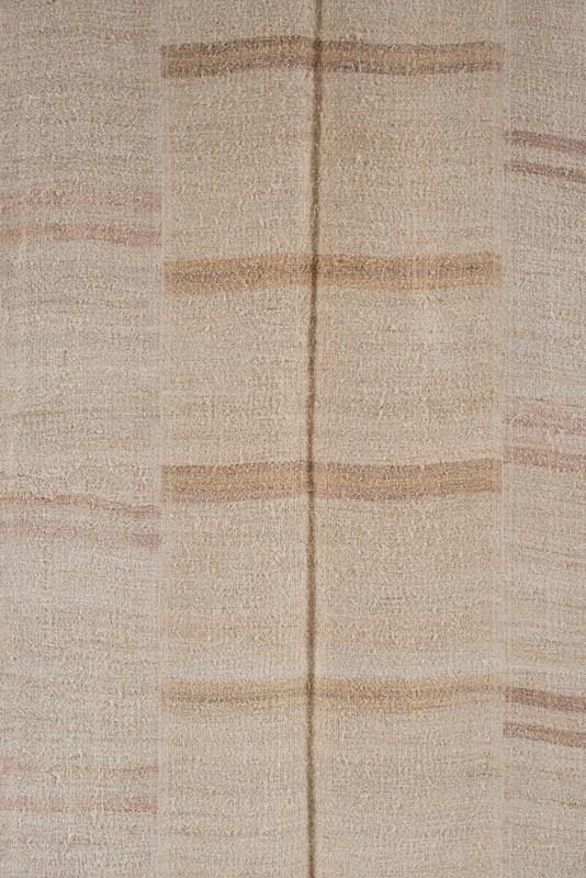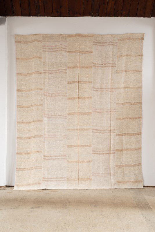 A vintage flat weave Kilim from Turkey, C1960.  Woven into panels using soft hemp in ivory and sand-toned stripes, which are pieced together to create this large-scale rug.  All of our Kilims are professionally cleaned and restored, meaning they are in good vintage condition.