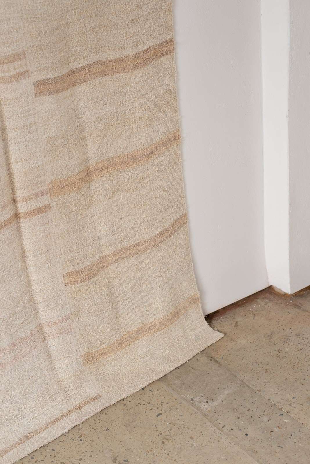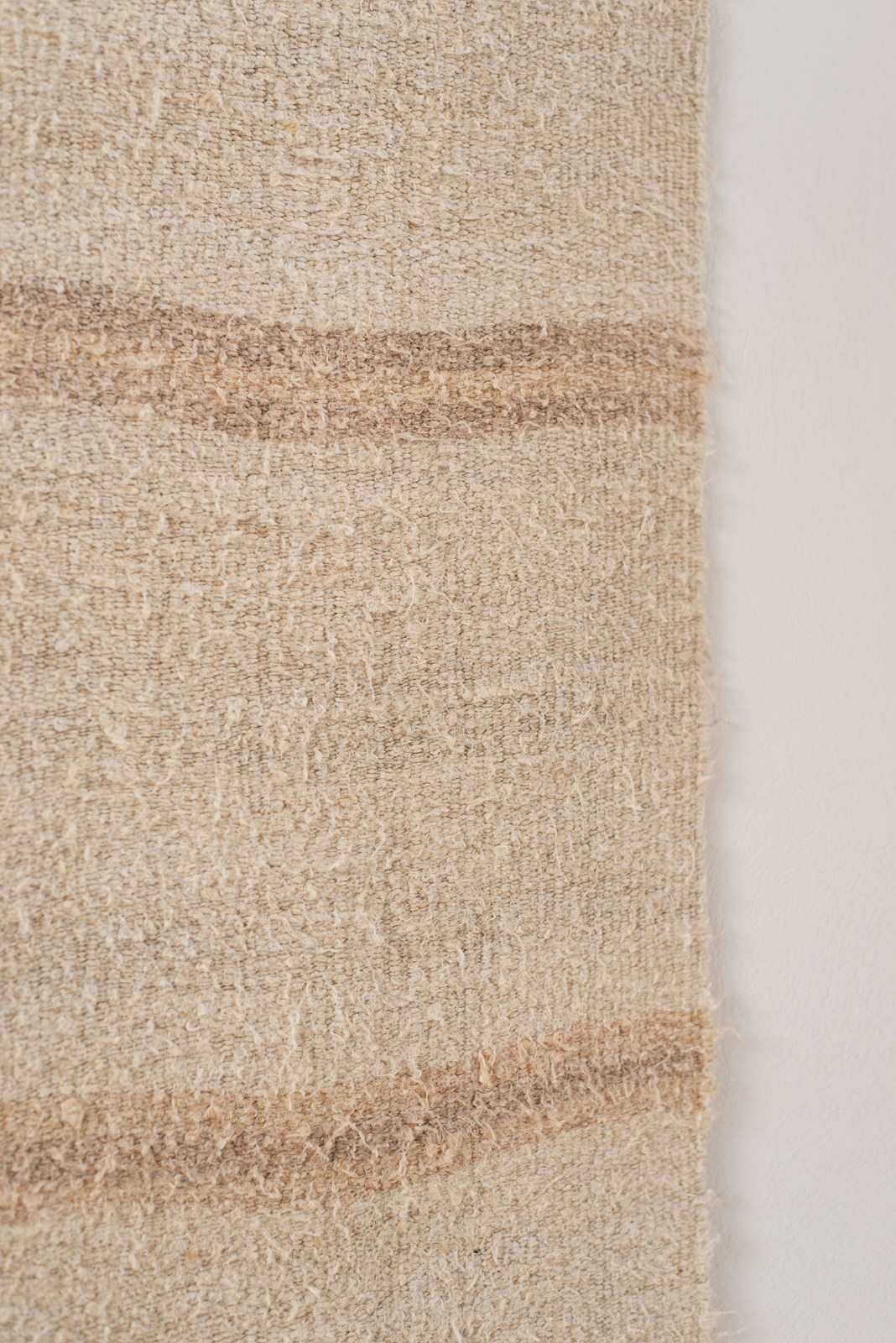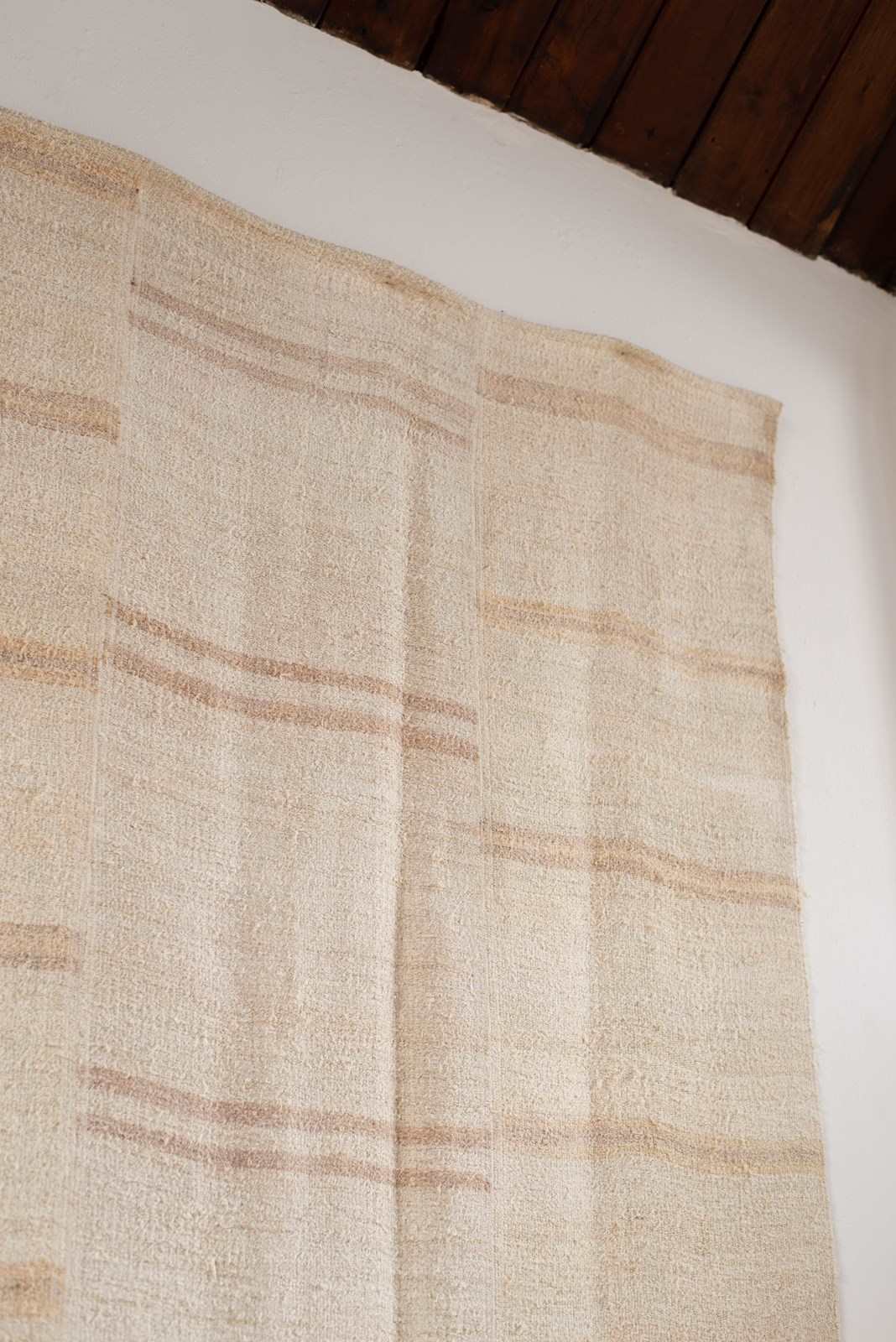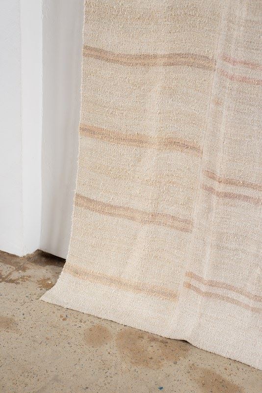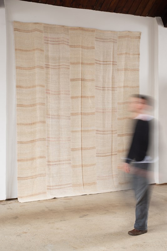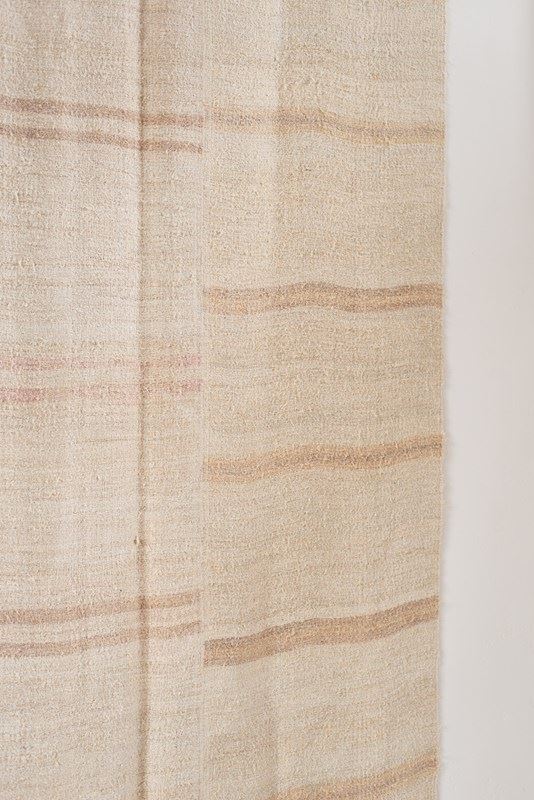 A vintage flat weave Kilim from Turkey, C1960.  Woven into panels using soft hemp in ivory and sand-toned stripes, which are pieced together to create this large-scale rug.  All of our Kilims are professionally cleaned and restored, meaning they are in good vintage condition.