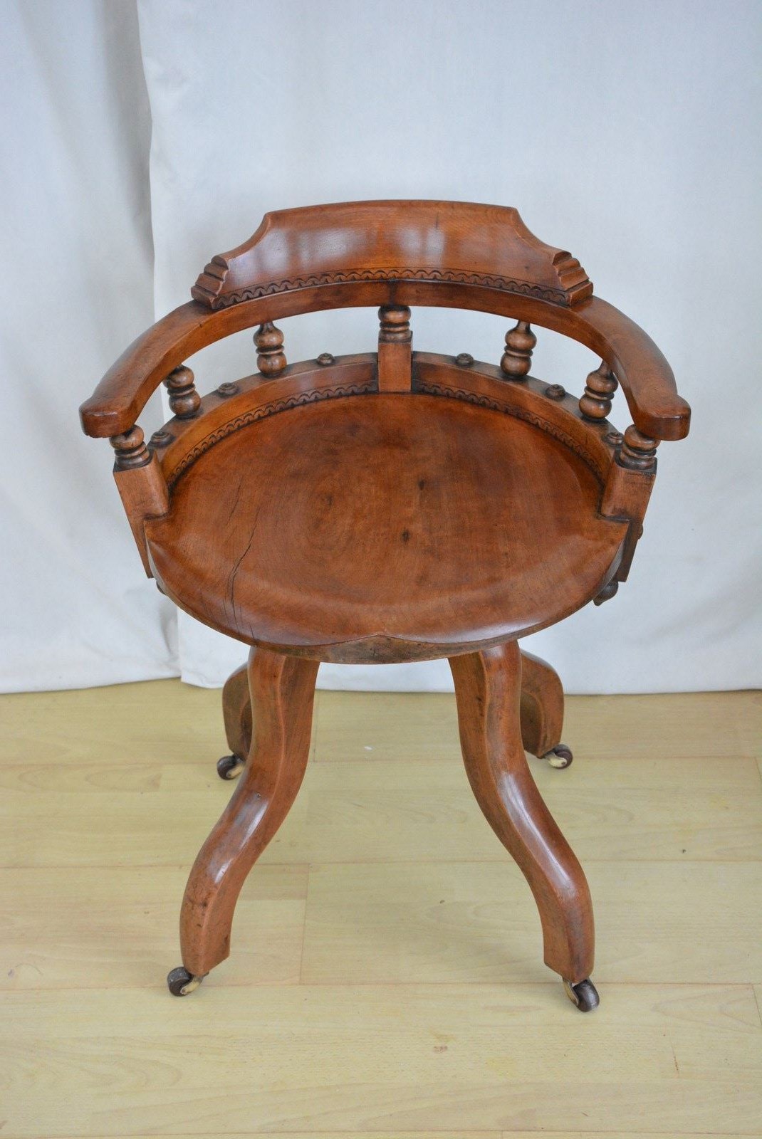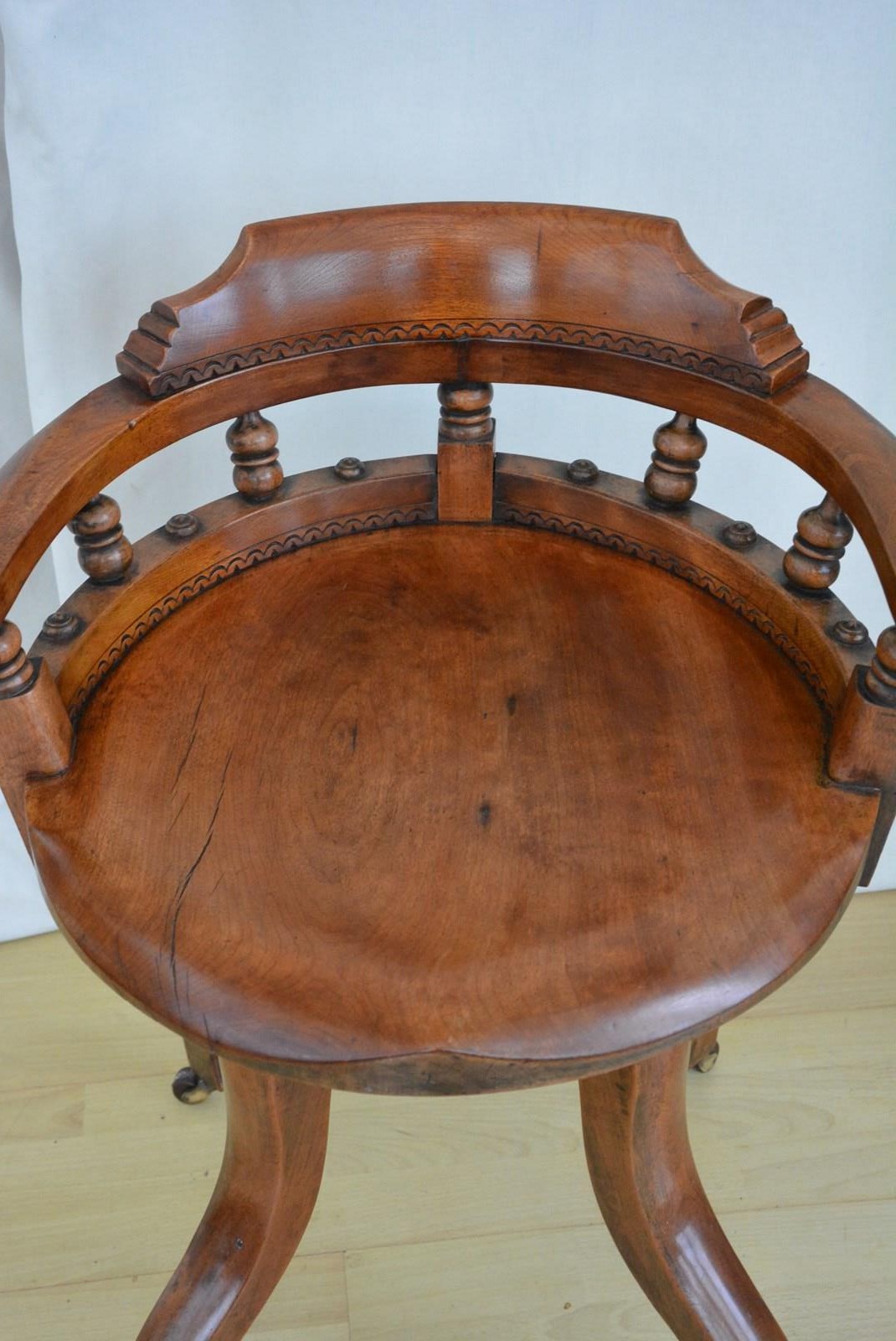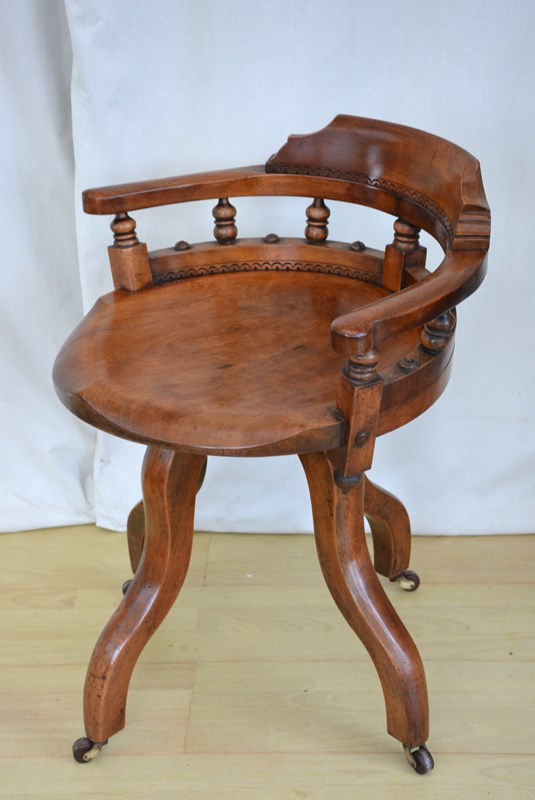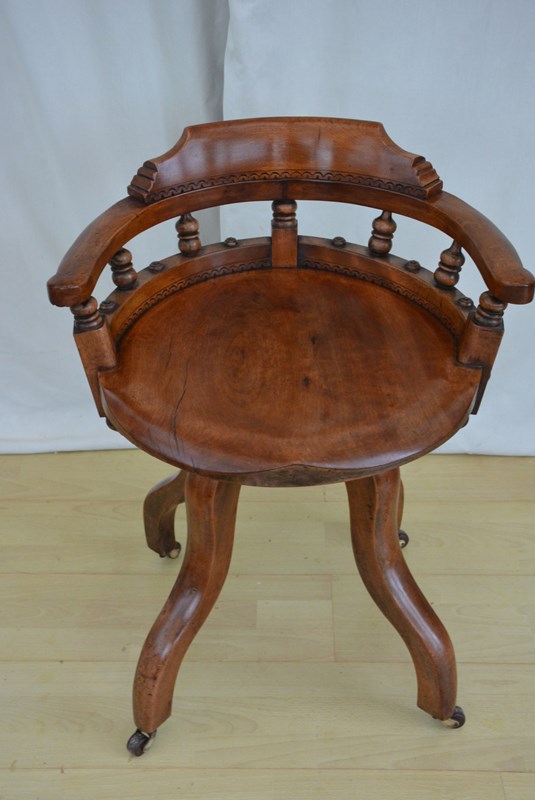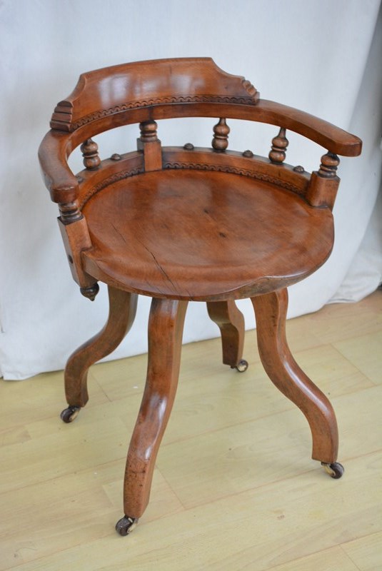 K0639 Very stylish and comfortable Aesthetic Movement revolving desk chair in walnut, having shaped and carved top rail with a detailed fan carving and figured walnut outswept arms, all supported and carved spindles and terminating in a single plank figured walnut saddle seat. The chair is raised on four solid walnut cabriole legs fitted with original revolving mechanism in good order, all terminating in original brass castors. This antique chair is in home ready condition. Solid, sturdy, woodworm free.