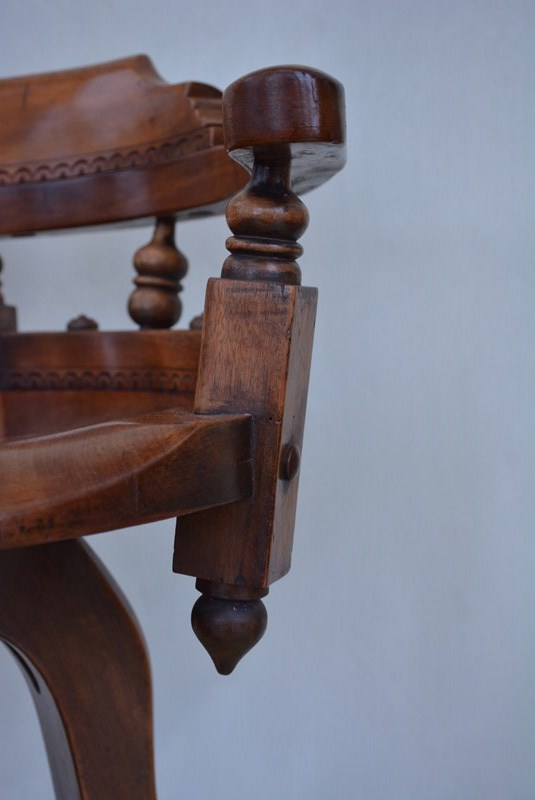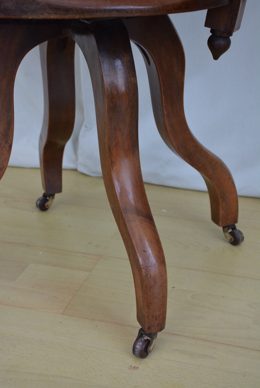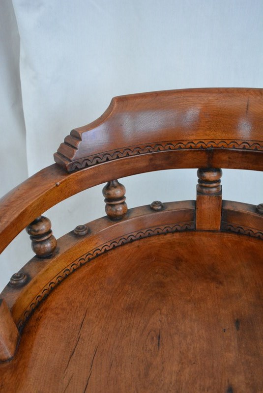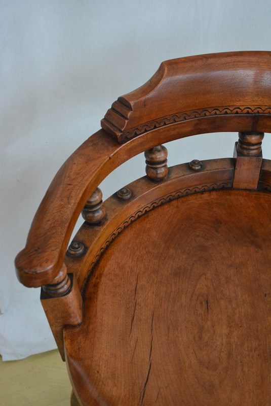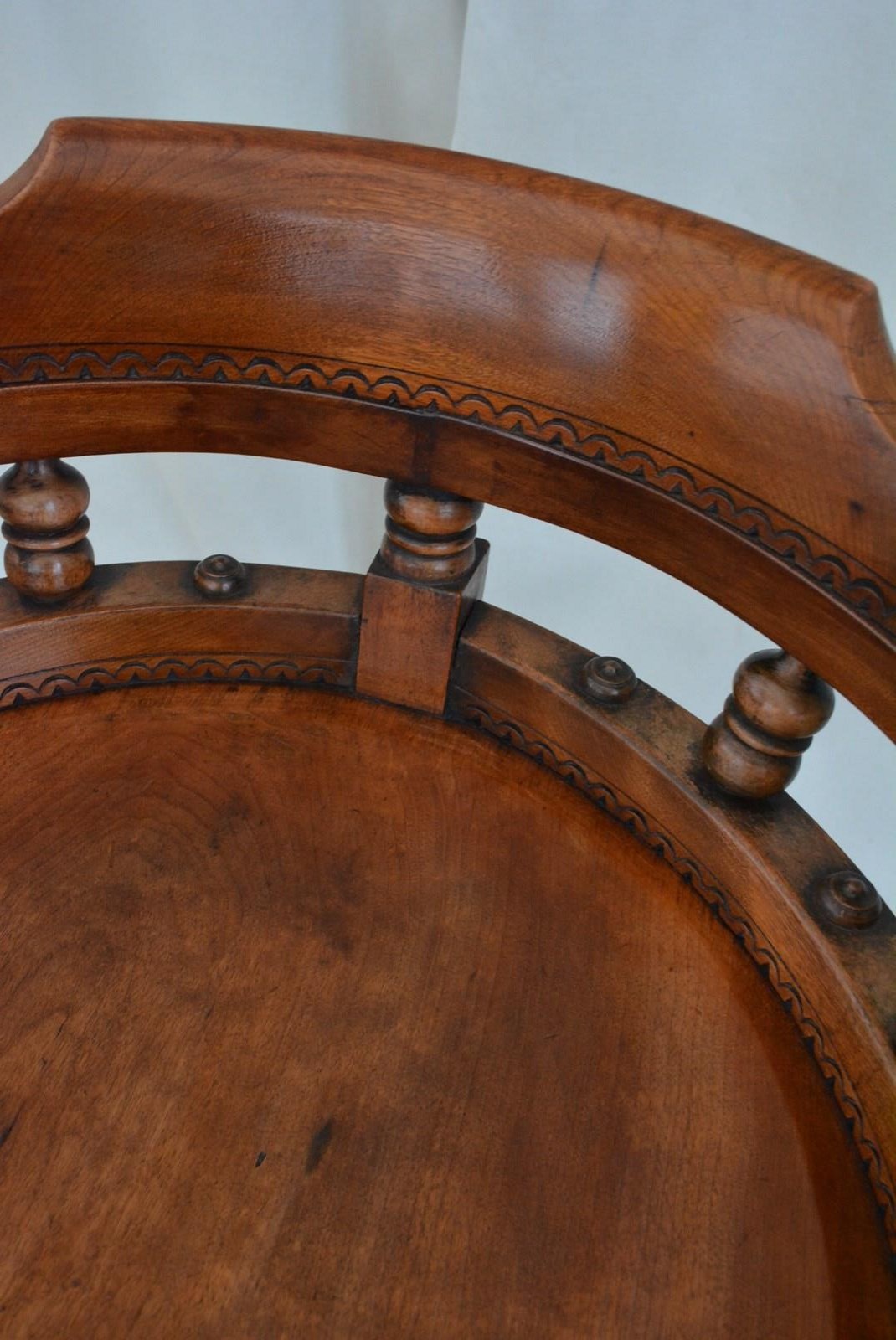K0639 Very stylish and comfortable Aesthetic Movement revolving desk chair in walnut, having shaped and carved top rail with a detailed fan carving and figured walnut outswept arms, all supported and carved spindles and terminating in a single plank figured walnut saddle seat. The chair is raised on four solid walnut cabriole legs fitted with original revolving mechanism in good order, all terminating in original brass castors. This antique chair is in home ready condition. Solid, sturdy, woodworm free.