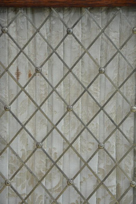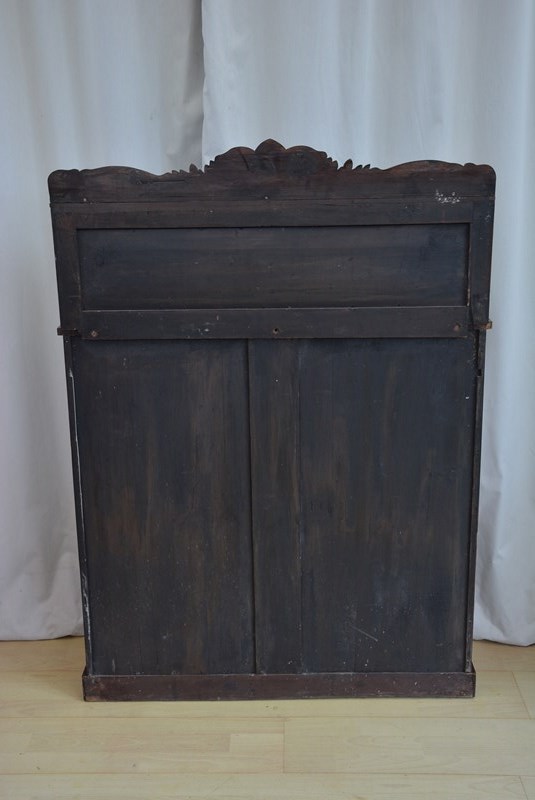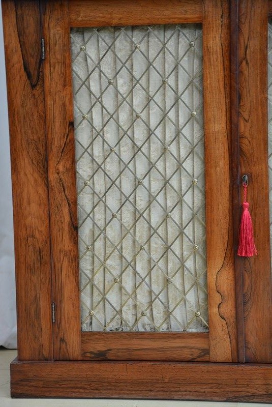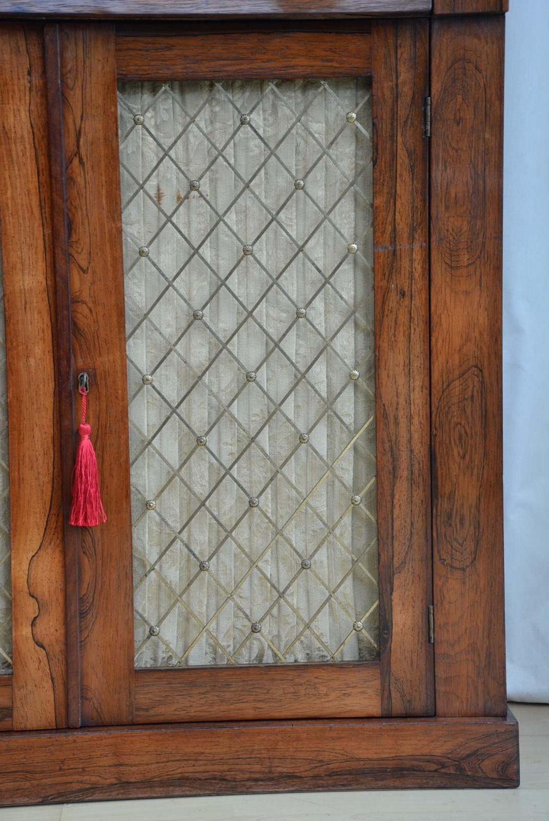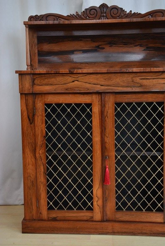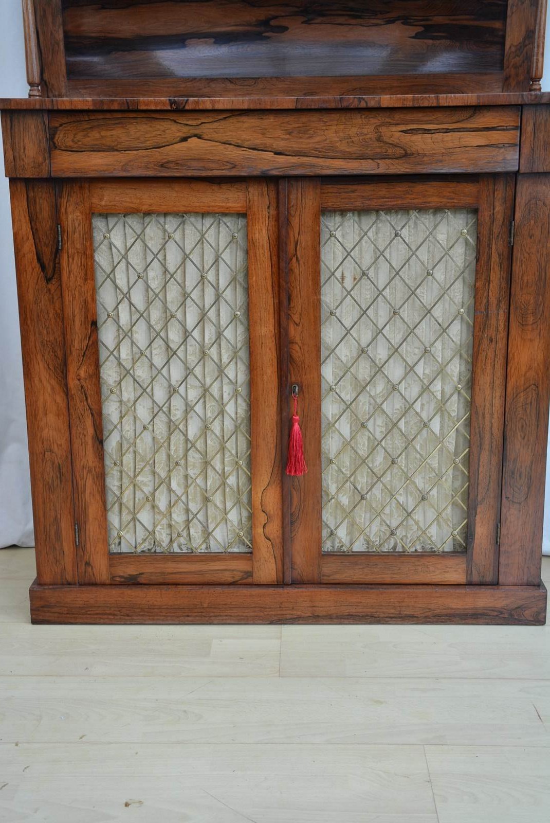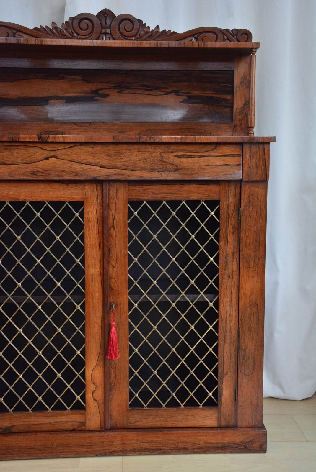 K0289 Very attractive William IV / early Victorian two door rosewood sideboard of unusually narrow proportions, having carved upstand to the shelf which is supported on turned columns above and oversailing top with stunning rosewood grain above an oak lined frieze drawer and a pair of cupboard doors with brass grill, enclosing removable shelf, all standing on plinth base. Although the lock is not working the door is fitted with a small brass catch and stays shut. We also have two pleated door panels. The cabinet came to us from a private collector, it is in good condition, it has been well looked after over the years. All in good home ready condition c1840