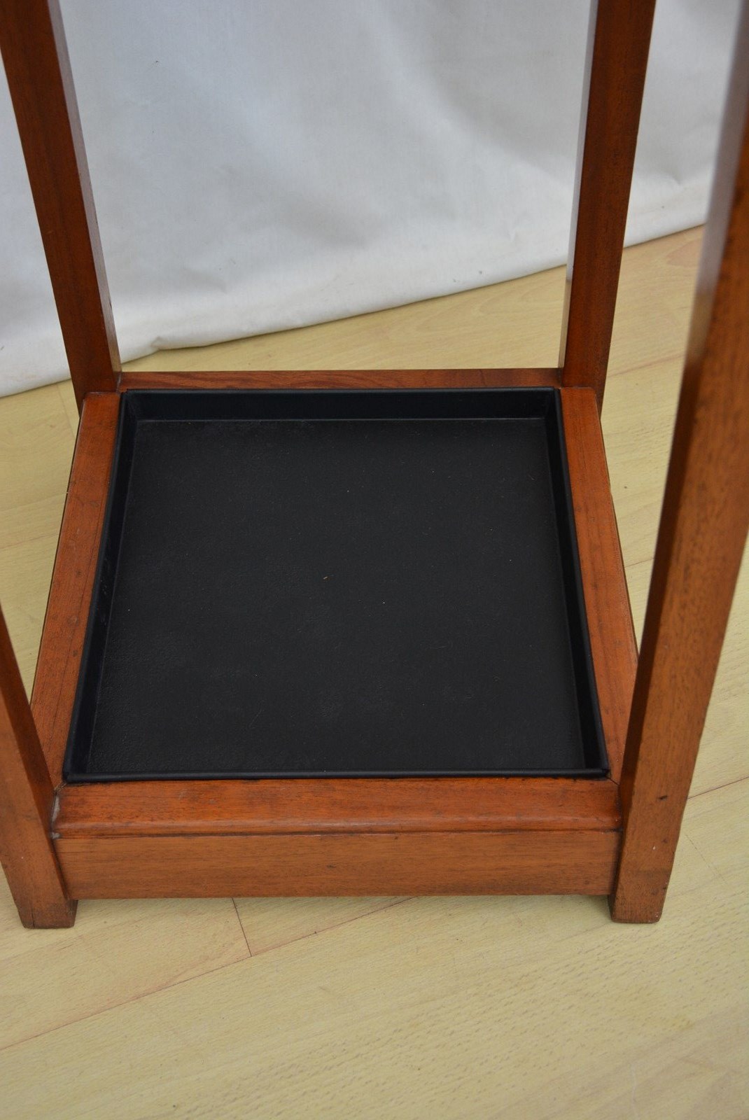 K0647 Very elegant Art Deco style coat rack in solid mahogany, having four original hat and coat hooks and four umbrella compartments, all raised on four solid mahogany uprights terminating in a square base which encloses original removable drip tray. No breaks, no woodworm, solid and sturdy. All joints have been checked and tighten where necessary. This antique hall stand came to us from a private home, it has been very well looked after over the years. The coat stand retains its original finish which has been cleaned and waxed in our workshop, mellow colour and soft patina, all in home ready condition. Stamped by the maker G. W. Evans LTD, March 1952