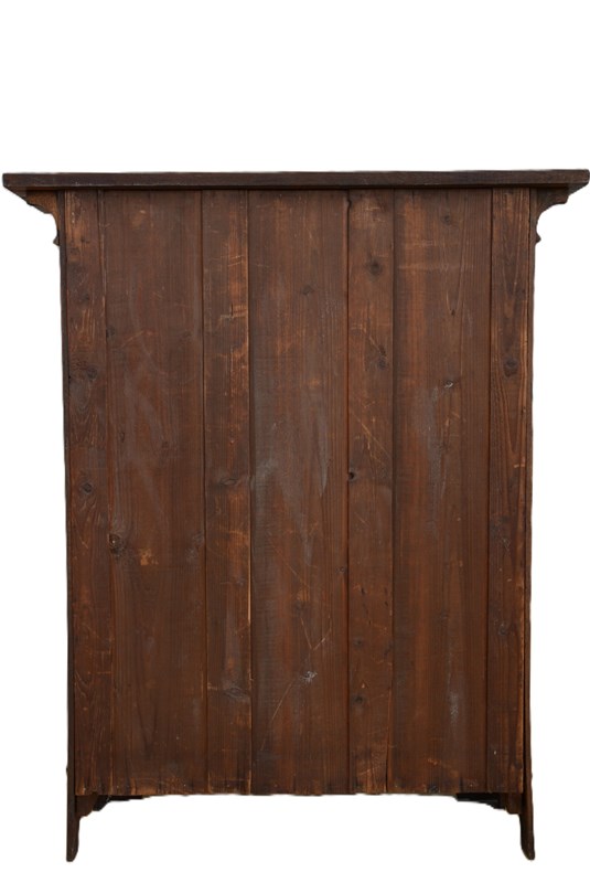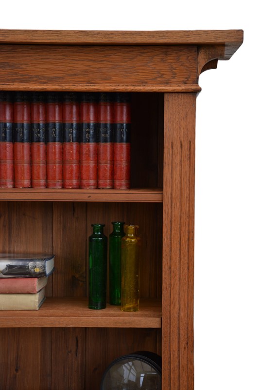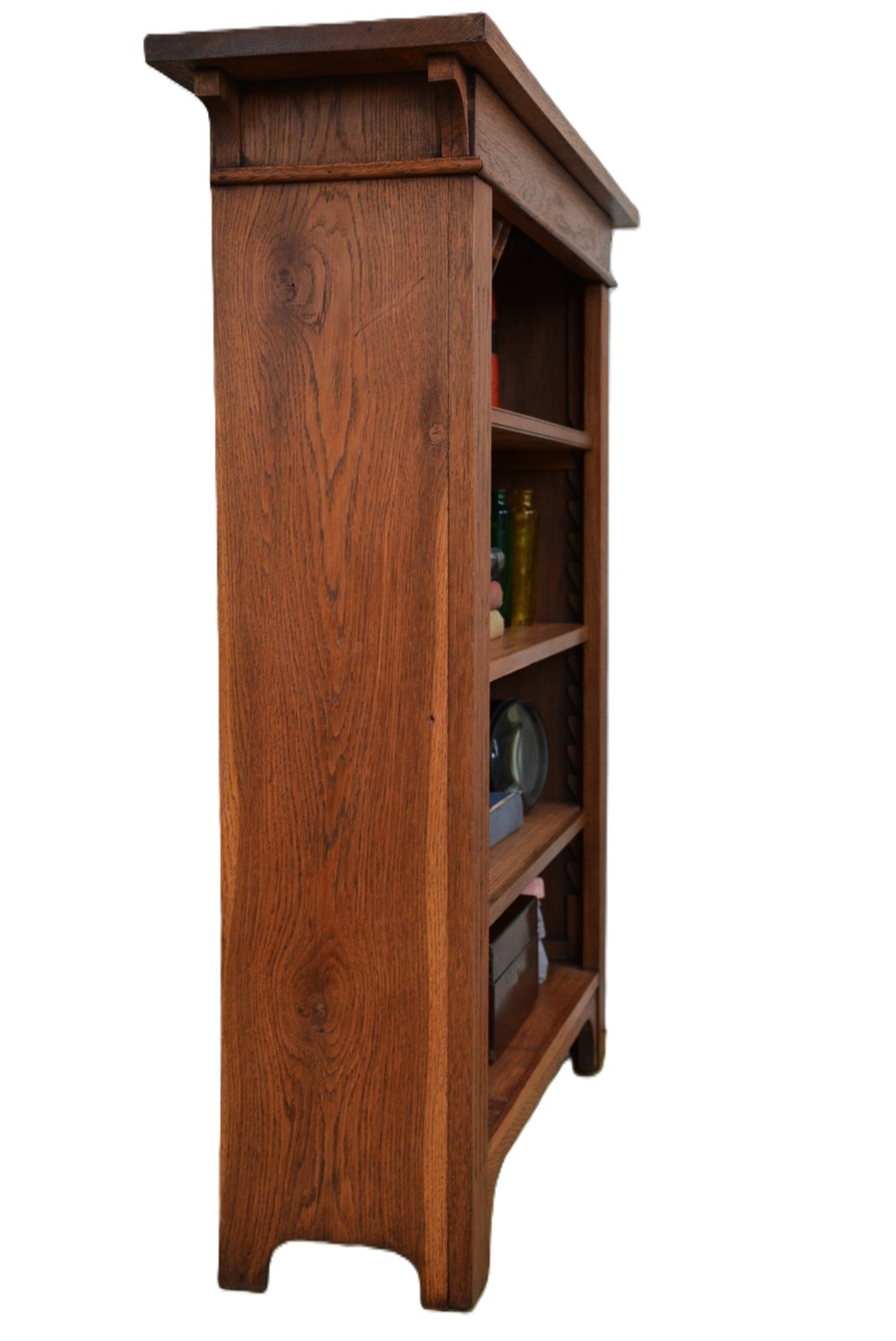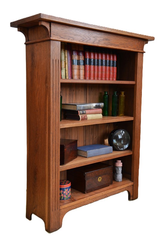 P0327 English antique Arts and Crafts solid oak bookcase of narrow proportions, having single piece of timber, oversailing top above a shallow frieze with stylish Arts and Crafts decorative brackets and three height adjustable shelves, one additional, unoriginal and with a slightly different front edge which doesn't affect its functionality, all flanked by fluted pilasters. The bookcase having single plank sides also in solid oak, terminating in shaped feet united by an apron. This antique bookcase has been cleaned and it retains its wax finish. No cracks, no splits, no woodworm. The bookcase has been very well looked after over the years and is in home ready condition. c1900