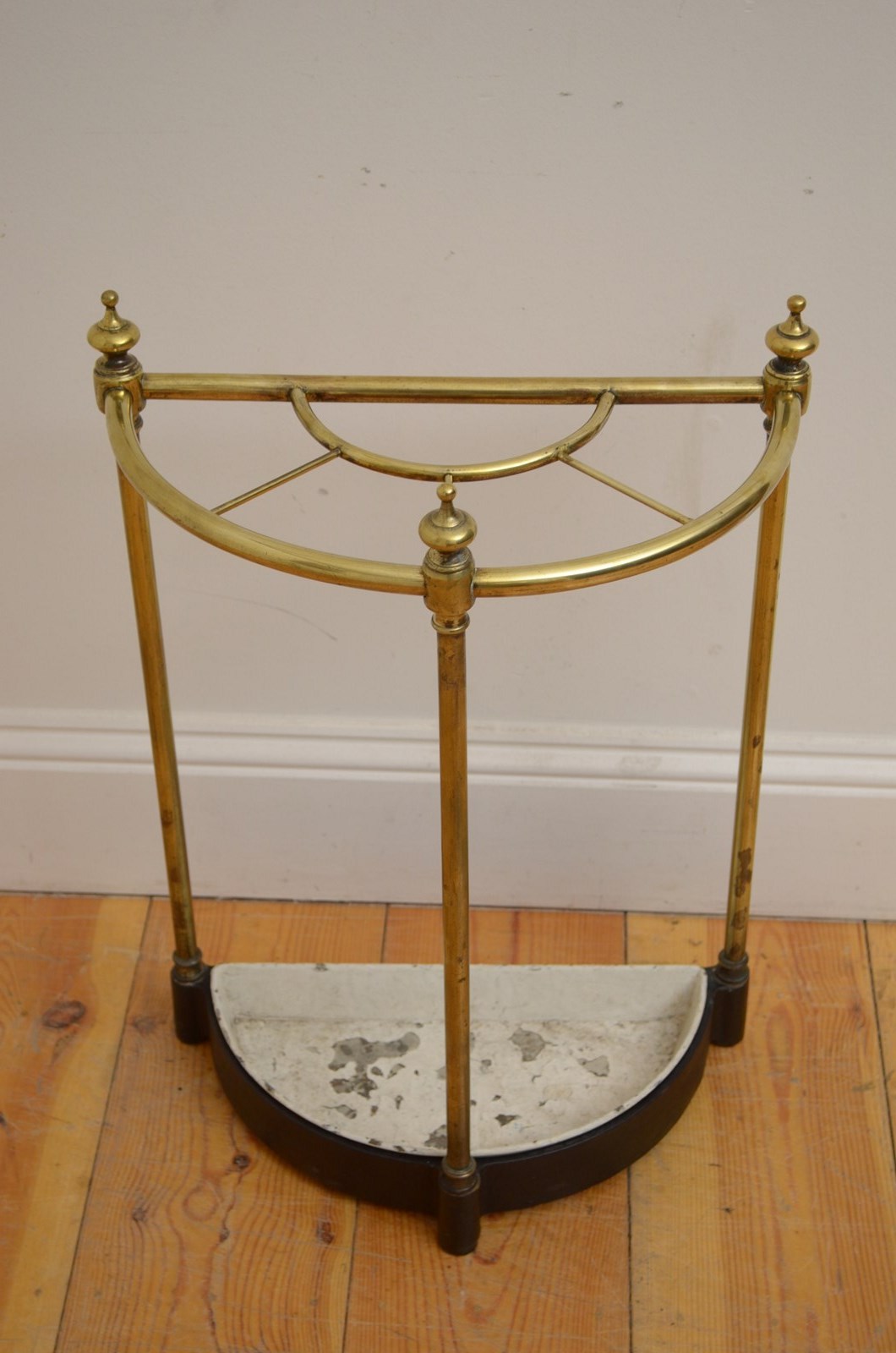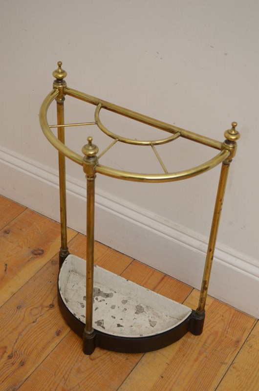 P0168 Victorian brass umbrella stand of half moon design with three finials, original removable drip tray and cast iron base. This antique walking sticks stand / umbrella stand has been cleaned and polished and it is in home ready condition. No breaks or repairs. c1880