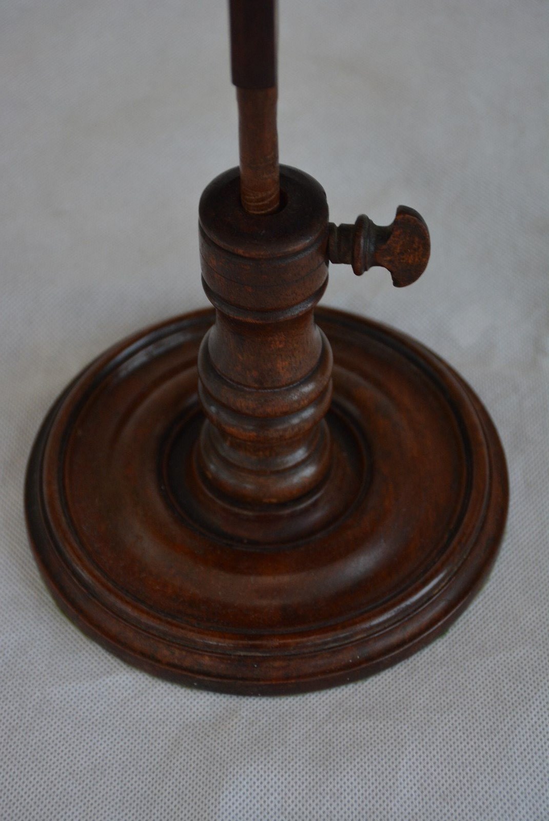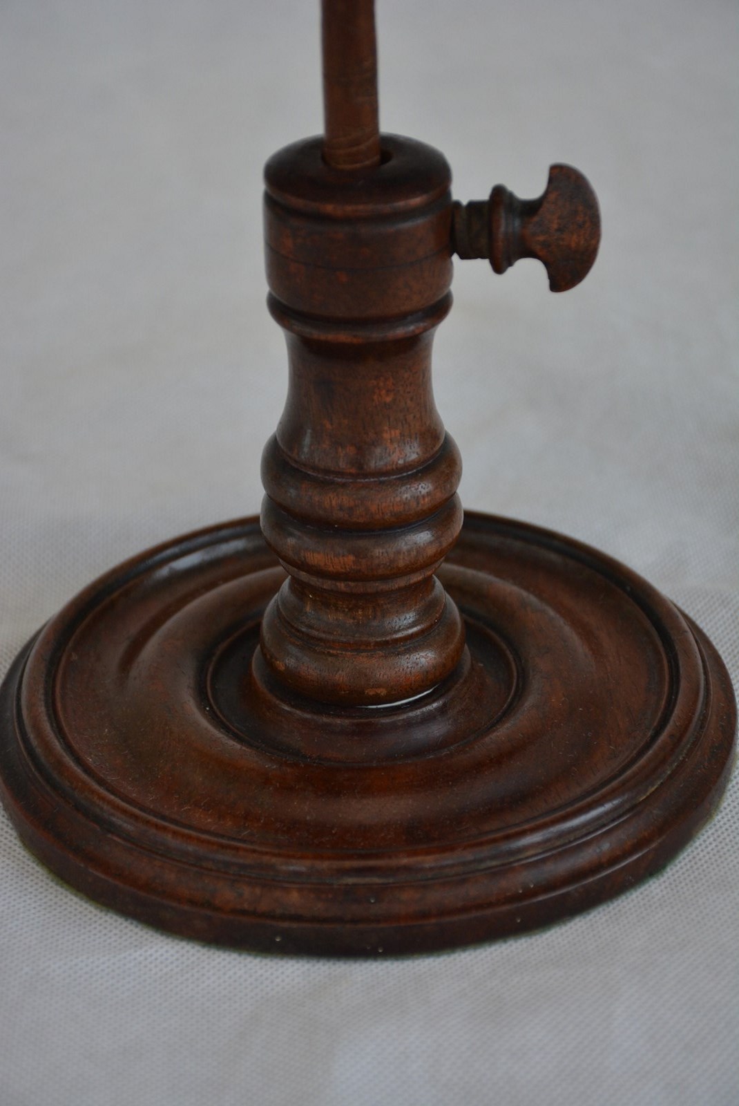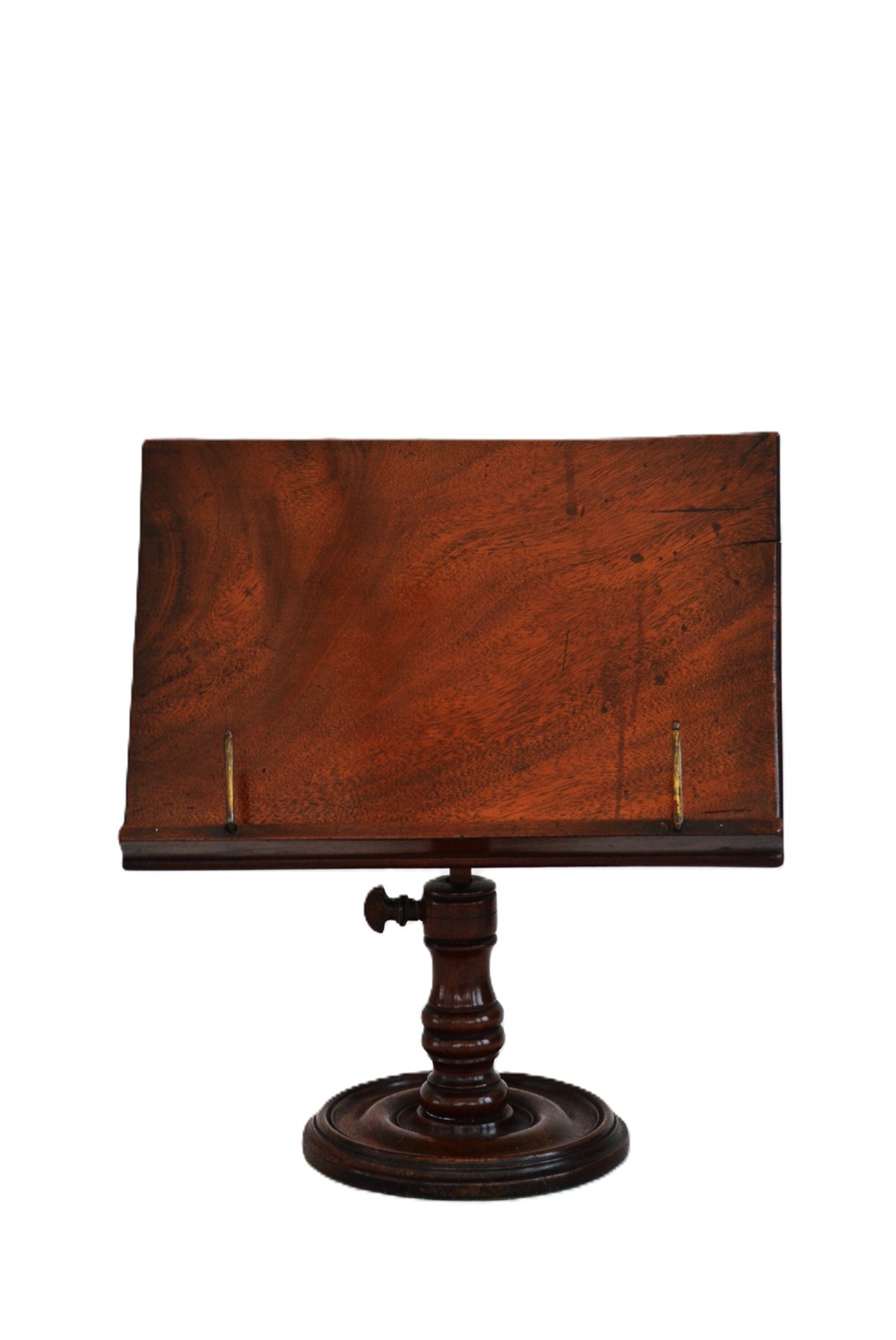 Rare and very elegant early 19th century English mahogany table top book stand or reading stand, having a flamed mahogany, single plank tilting book rest with two brass holders raised on a height adjustable turned column, all terminating in turned fluted base. This antique book rest would make a good photograph holder. The bookrest is in good condition, retaining its original colour, patina and antique character. c1830