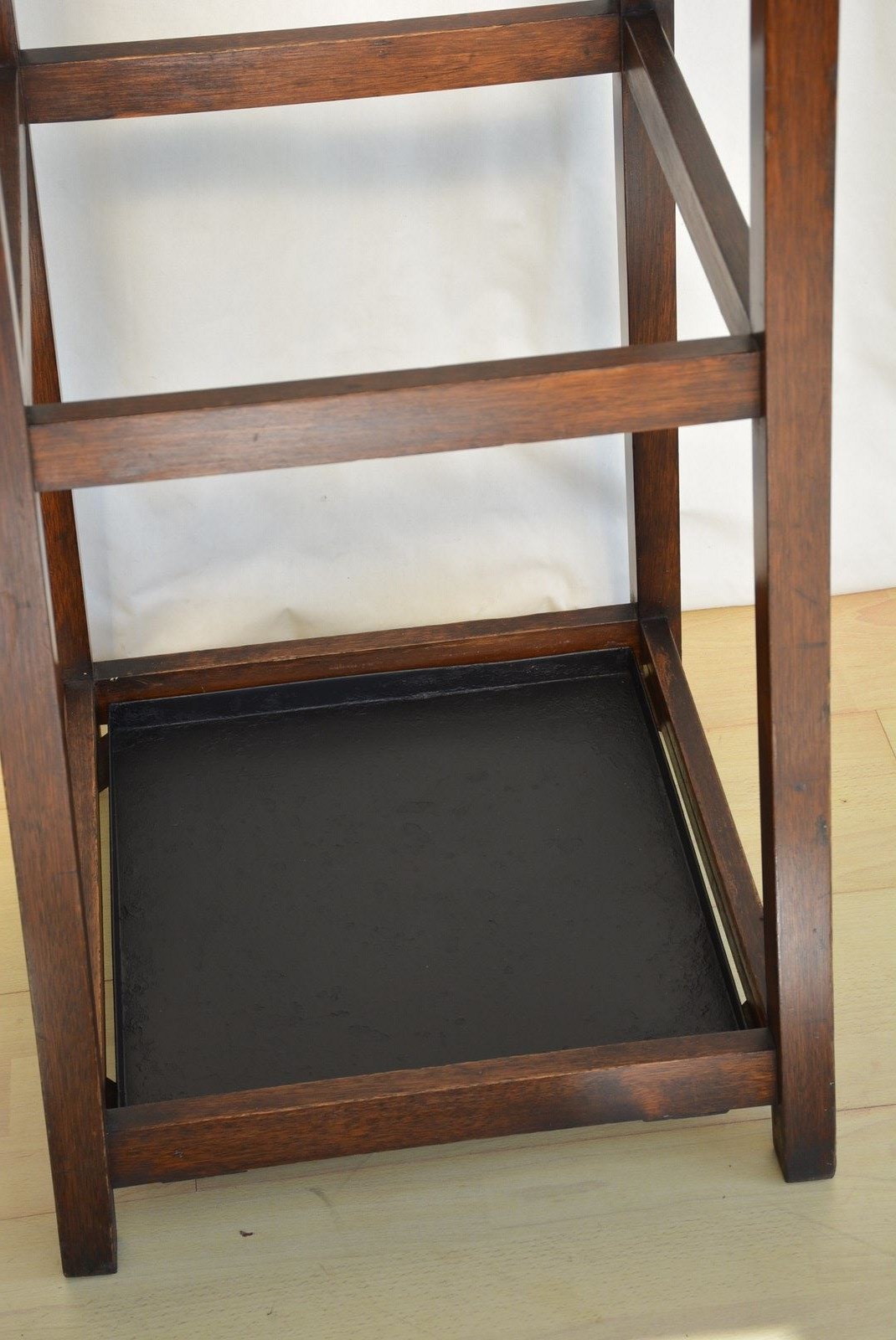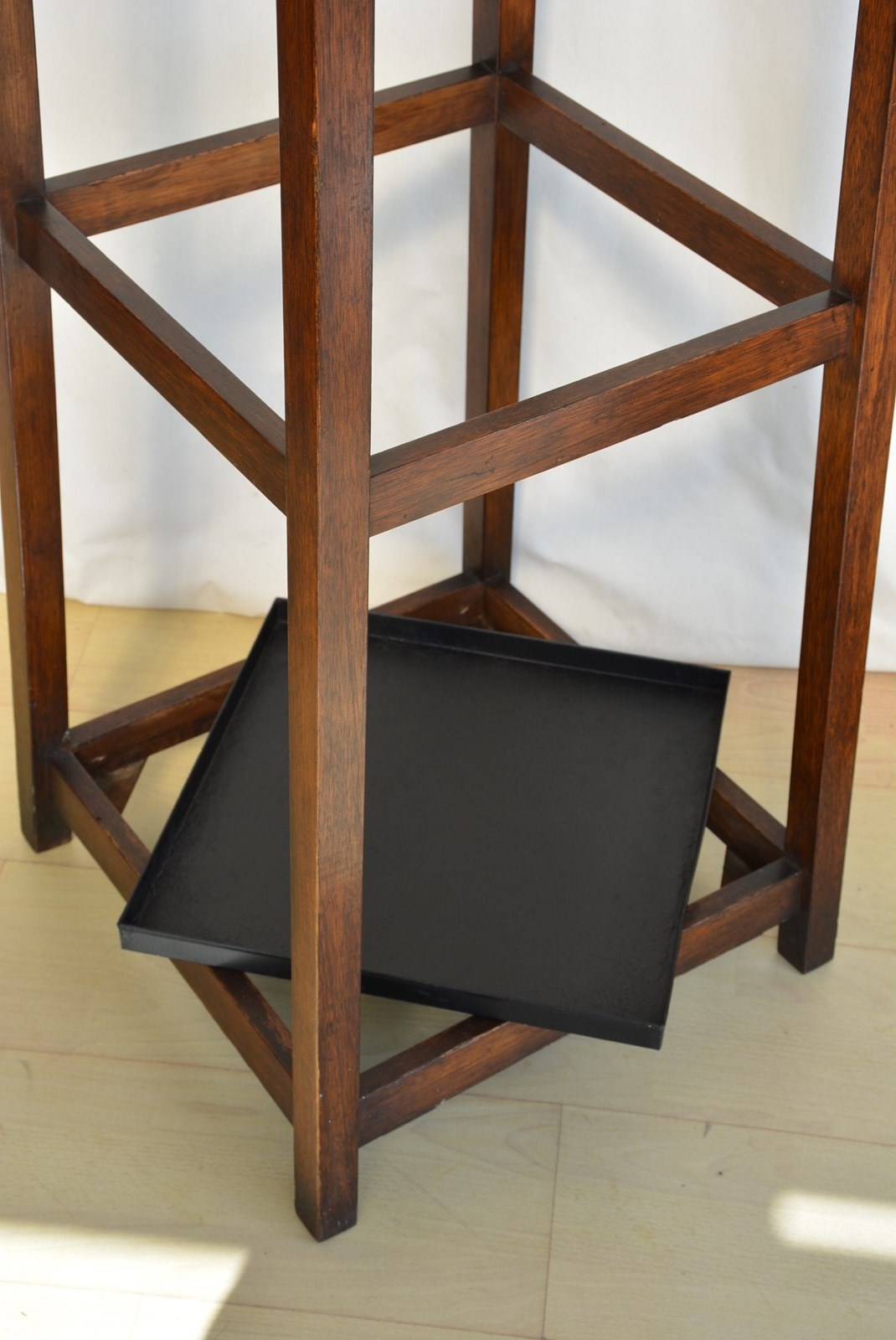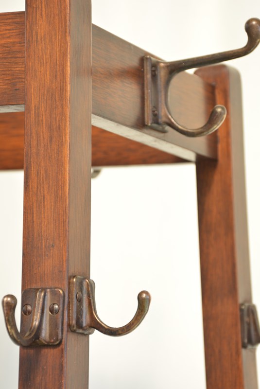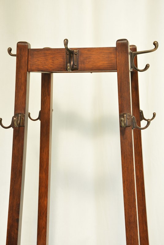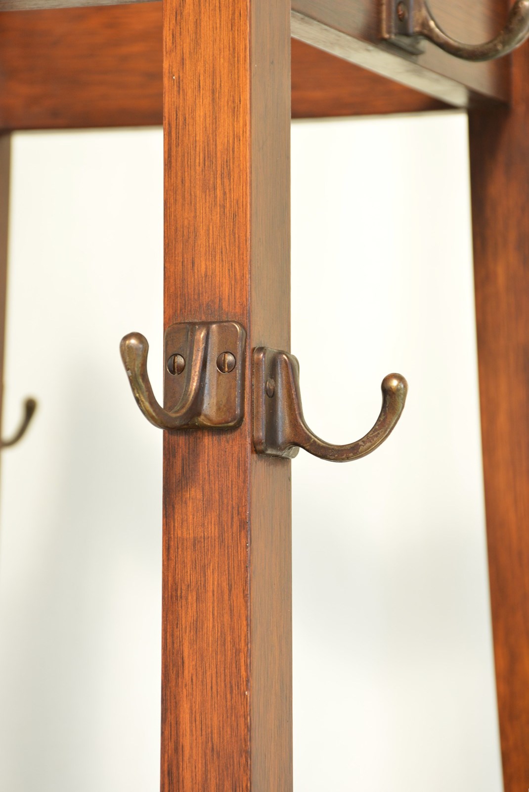 K0645 English antique Arts and Crafts coat stand, having four double coat and hat hook above eight single hooks on four square uprights with stylised top ends united by umbrella holders and terminating in a square base enclosing original removable drip tray. This antique hall stand retains its original finish which has been cleaned and waxed, original mellow colour and soft patina showing minor age related signs. No cracks, no breaks, no repairs. Solid, sturdy, woodworm free, all in home ready condition. Good size. c1900