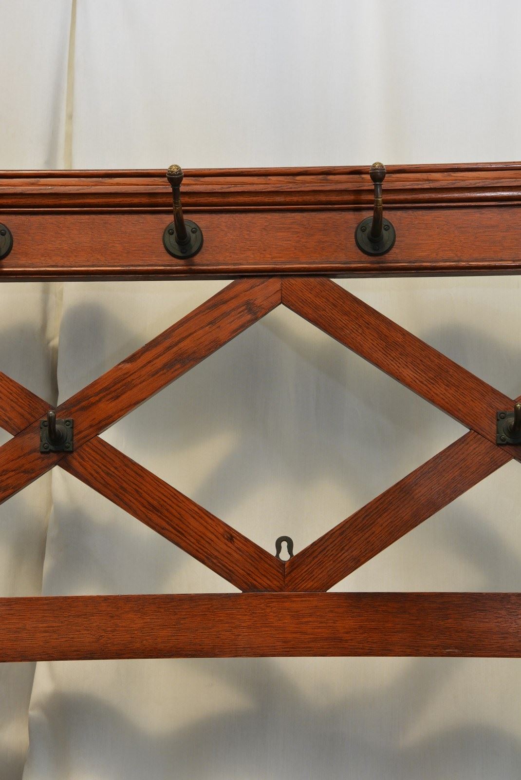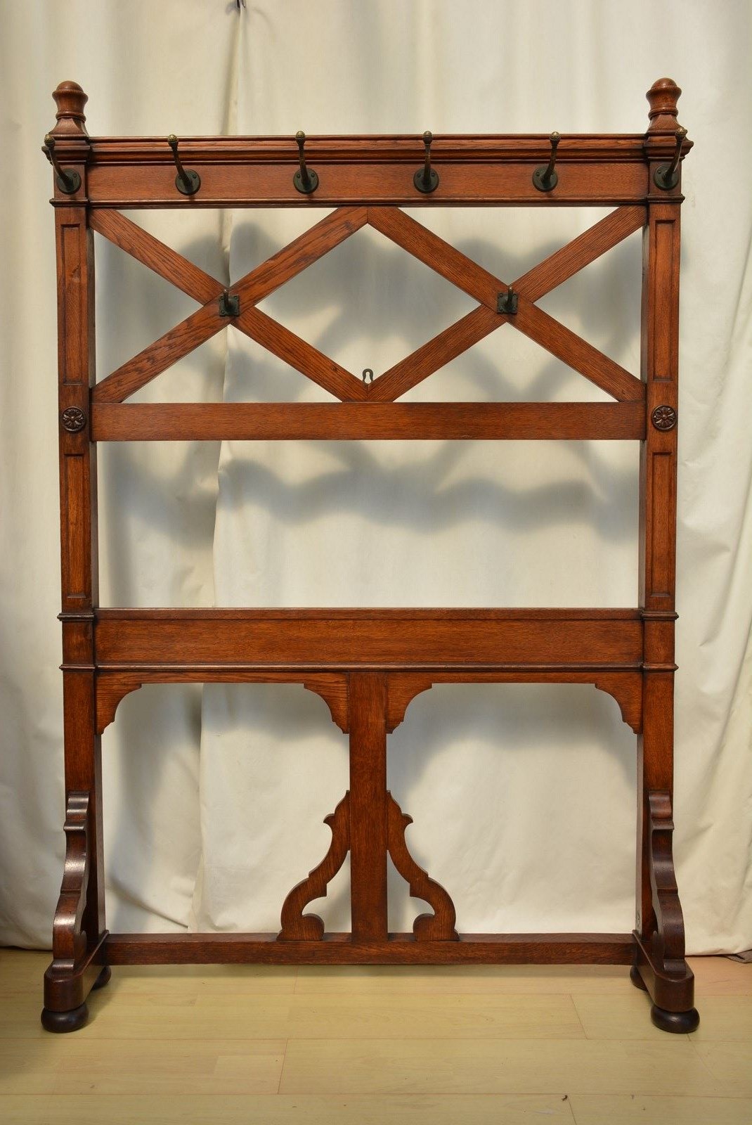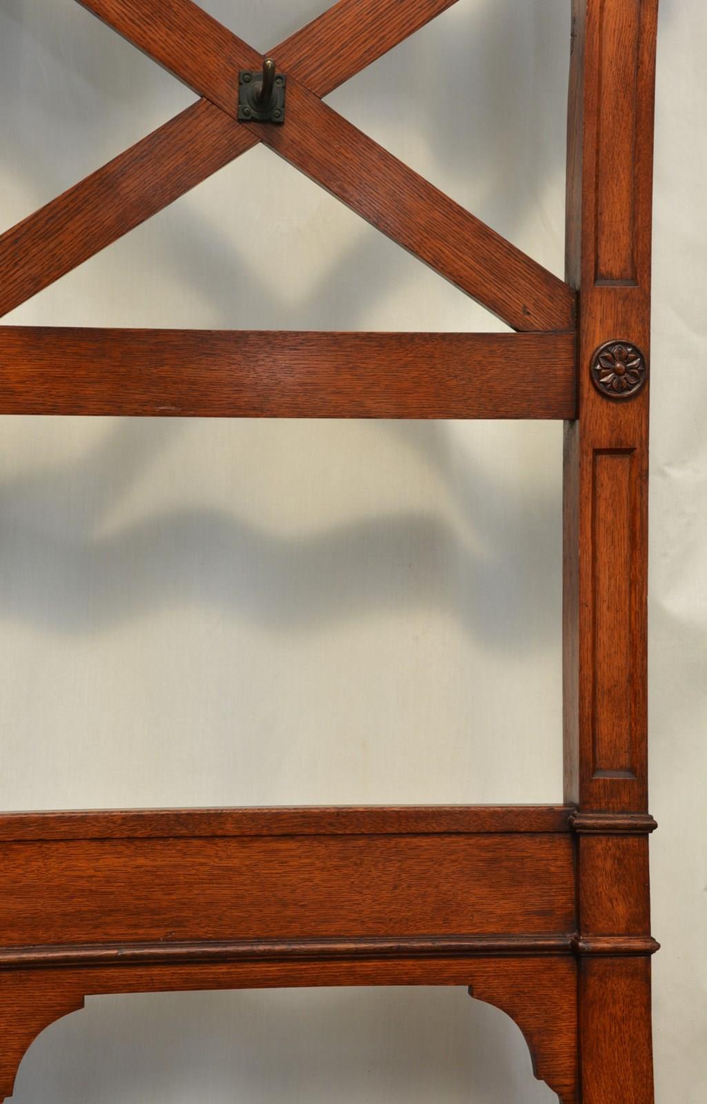 K0641a Stylish, elegant and very unusual, fine quality solid oak Victorian Gothic hall stand / coat stand, having six original very decorative coat hooks with petal motif on moulded back, flanked by turned finials and two short hat / coat hooks below, raised on fielded uprights with Gothic rosettes. The uprights follow to form a base with scroll carved legs and shaped and carved centre support all standing on original bun feet. This antique hall stand / coat stand has been sympathetically cleaned and waxed. It retains its original mellow colour, original French polish finish and soft patina. No woodworm, solid and in home ready condition. This stylish Gothic Revival coat stand would grace any interior. c1860