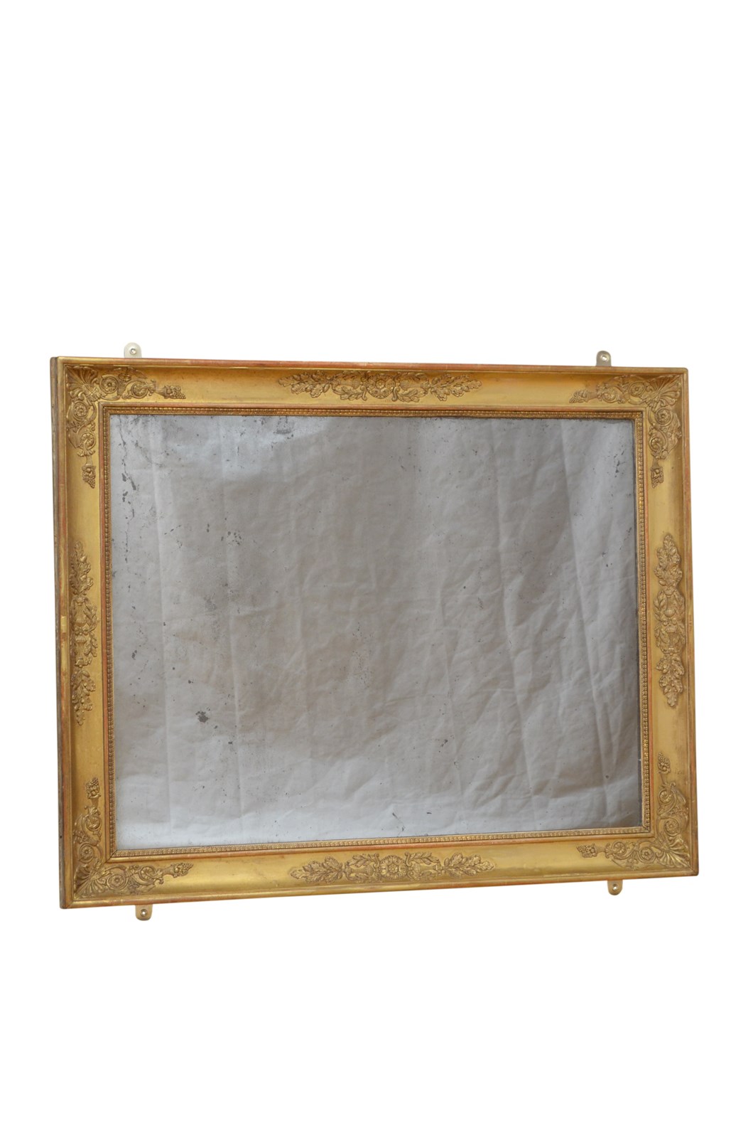 P0150 Fine XIXth century gilded wall mirror which can be positioned horizontally or vertically, having foxed glass in carved gilt frame decorated with intricate floral designs including oak leaf with acorns, horn of plenty and caduceus which is the staff carried by Hermes in Greek mythology. This antique mirror retains its original gilt and original glass, all in excellent home ready condition fitted with a hanging brackets. No missing element, no loose decoration, woodworm free. All in good honest condtion.c1850