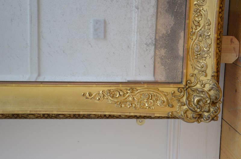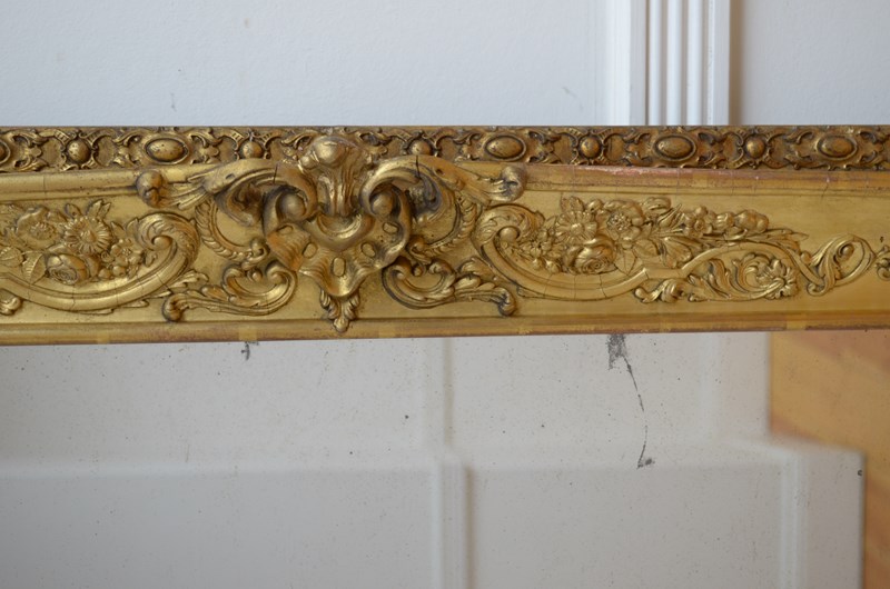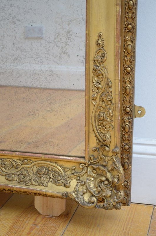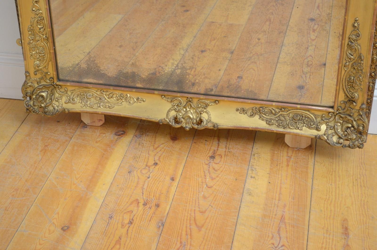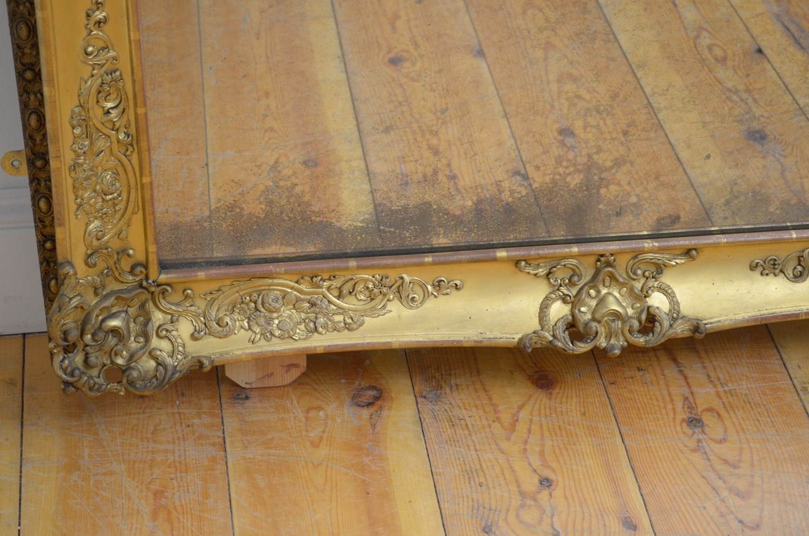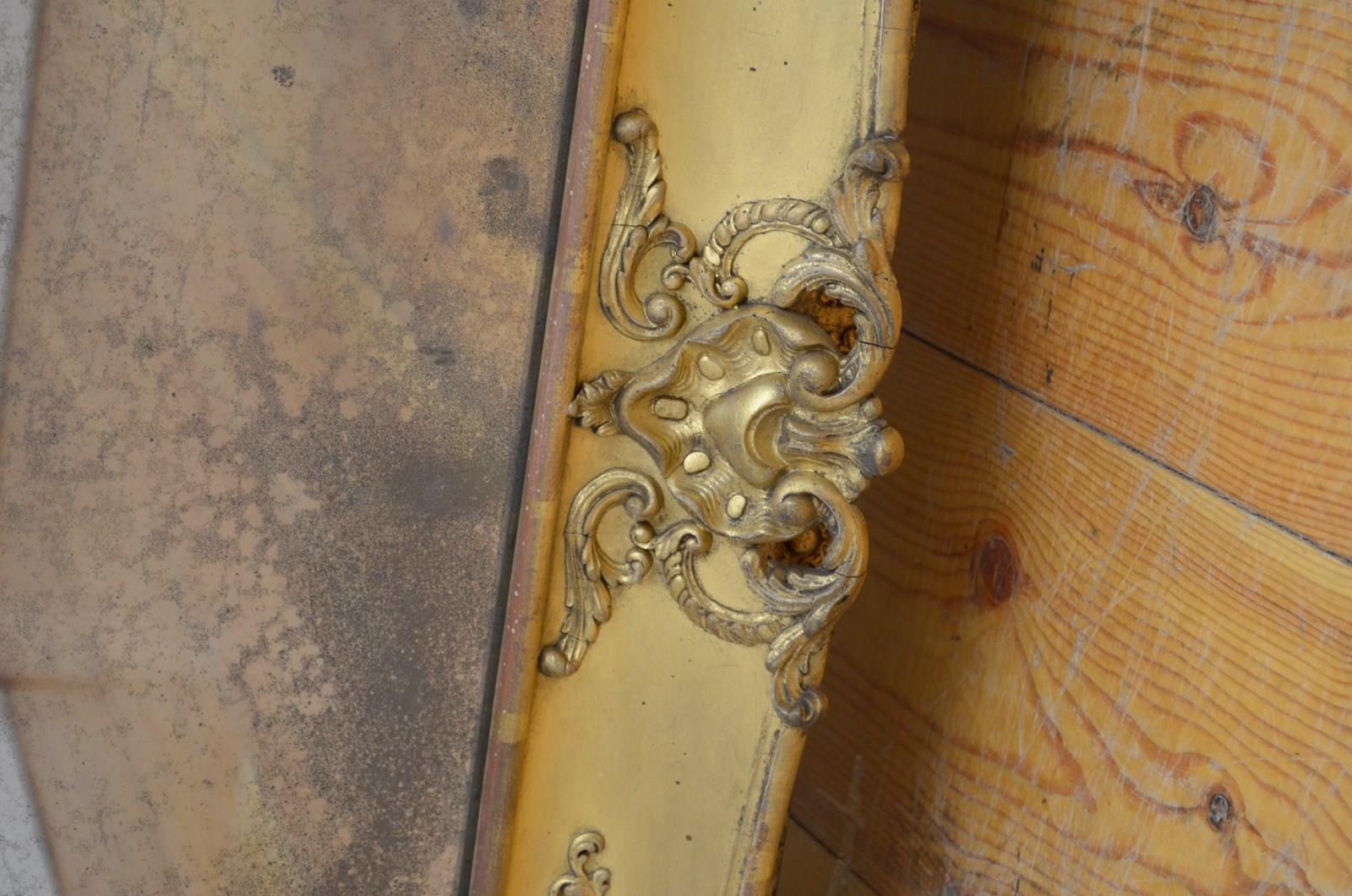 P0220 Superb XIXth century French giltwood mirror of versatile form, can be position horizontally or vertically, having original glass with characterful foxing in giltwood frame. The frame is decorated with scrolls and floral motifs to each corners and centre of the frame. This antique mirror retains its original glass with that desirable foxing, original gilt with red oxidation showing through and original patina. New backboards fitted with four wall fixing brackets. Sturdy, woodworm free, no loose decoration, no missing elements, all in home ready condition. Feet fitted for protection, easily removed. c1840