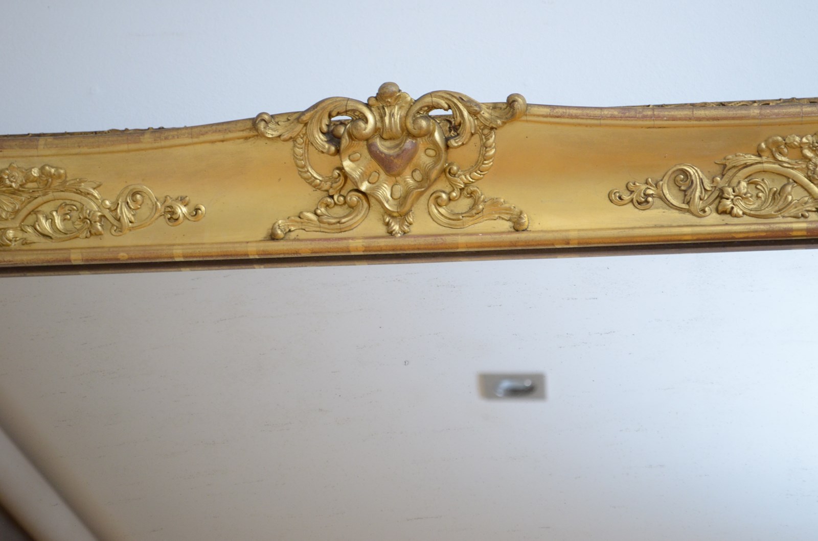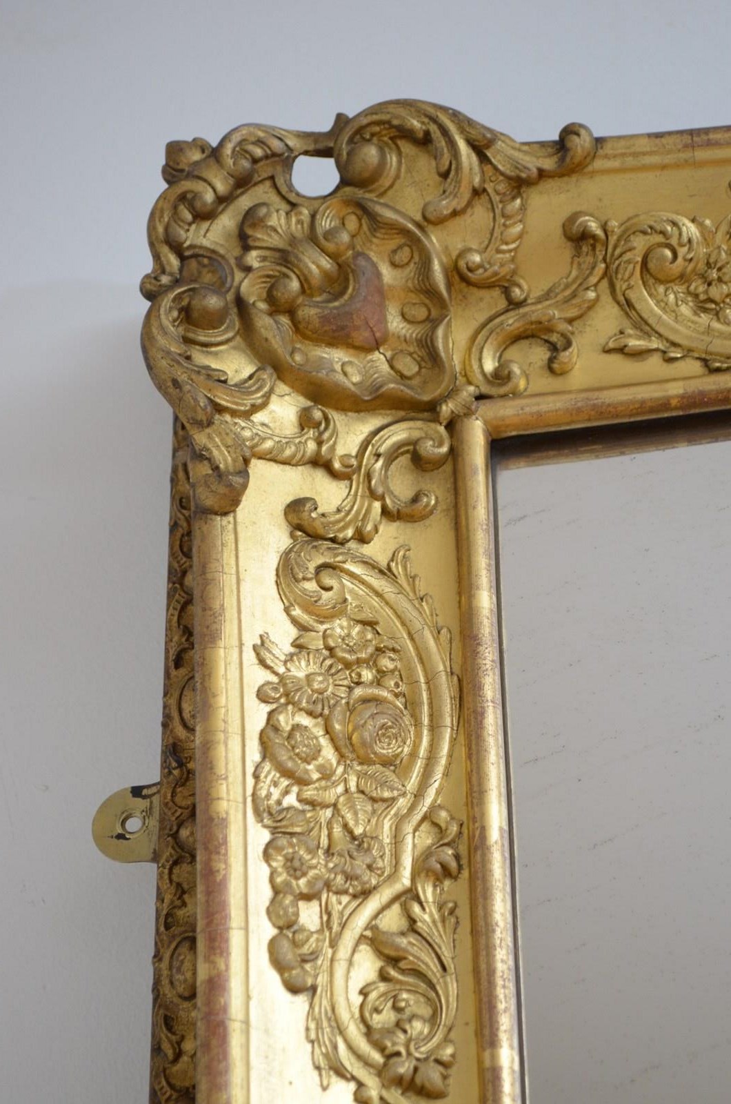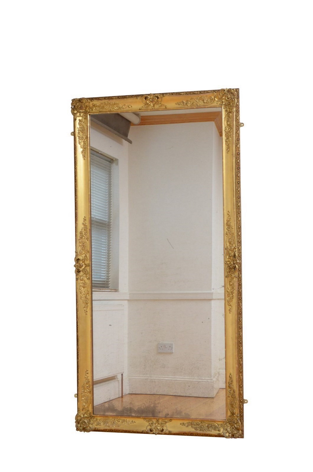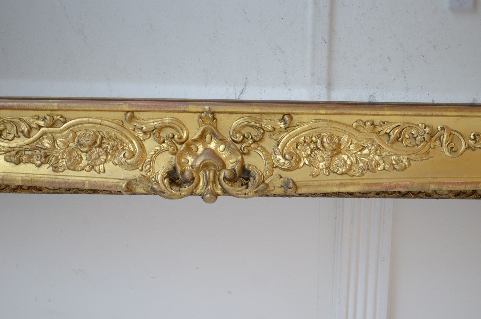 P0220 Superb XIXth century French giltwood mirror of versatile form, can be position horizontally or vertically, having original glass with characterful foxing in giltwood frame. The frame is decorated with scrolls and floral motifs to each corners and centre of the frame. This antique mirror retains its original glass with that desirable foxing, original gilt with red oxidation showing through and original patina. New backboards fitted with four wall fixing brackets. Sturdy, woodworm free, no loose decoration, no missing elements, all in home ready condition. Feet fitted for protection, easily removed. c1840