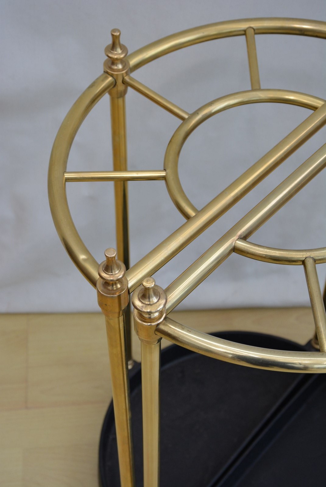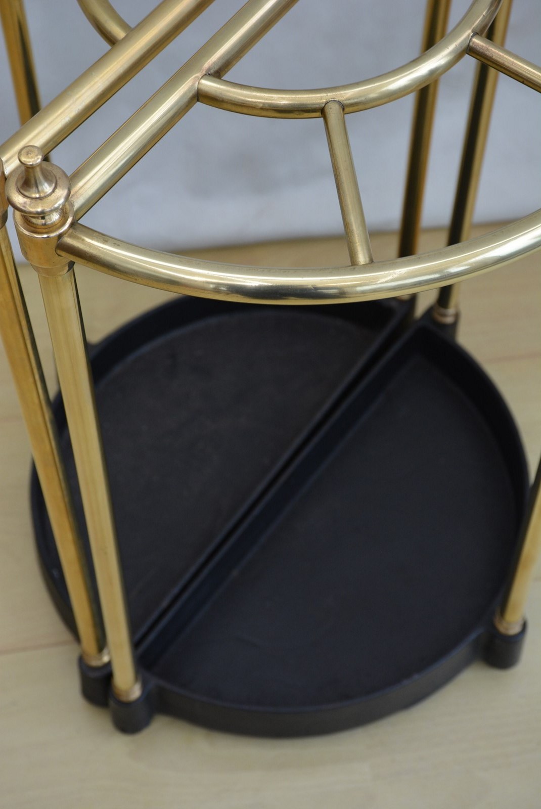 Matched pair of early XXth century / vintage umbrella stands of demi lune design, each having five walking sticks or umbrella divisions with decorative finials to the top raised on three uprights terminating in black half moon drip tray, all standing on three original ball feet. Cleaned and polished and in home ready condition, with no cracks or historic repairs. c1920/40