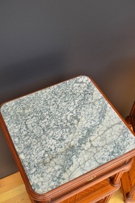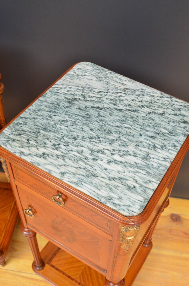 Antique pair of satinwood bedside cupboards, each having original white and green vein inset marble top above an oak lined and crossbanded drawer.