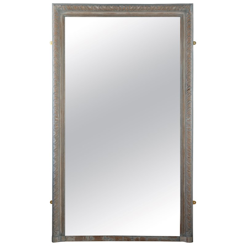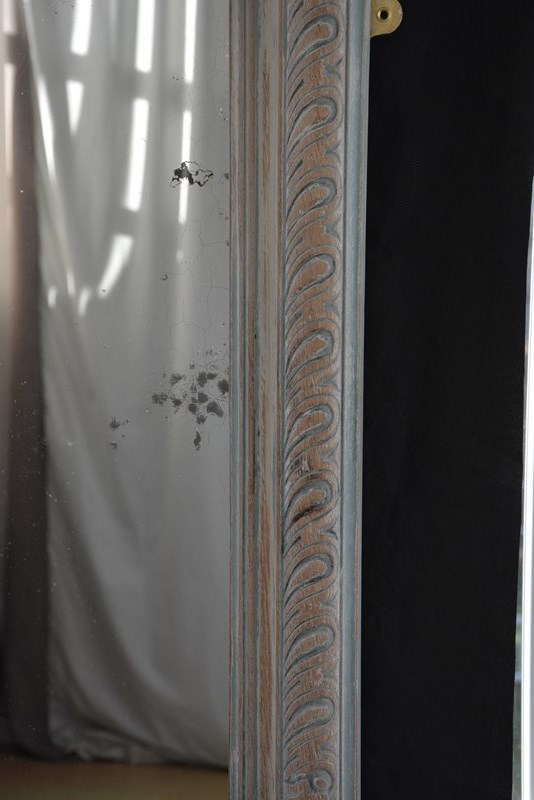 P0189 Large antique French country oak leaner mirror / wall mirror, having original glass with some silvering and imperfections in moulded and finely carved frame, depicting deeply lobed acanthus leaves. This motif originates in ancient Greece and Rome and is in widely used in antique frames.