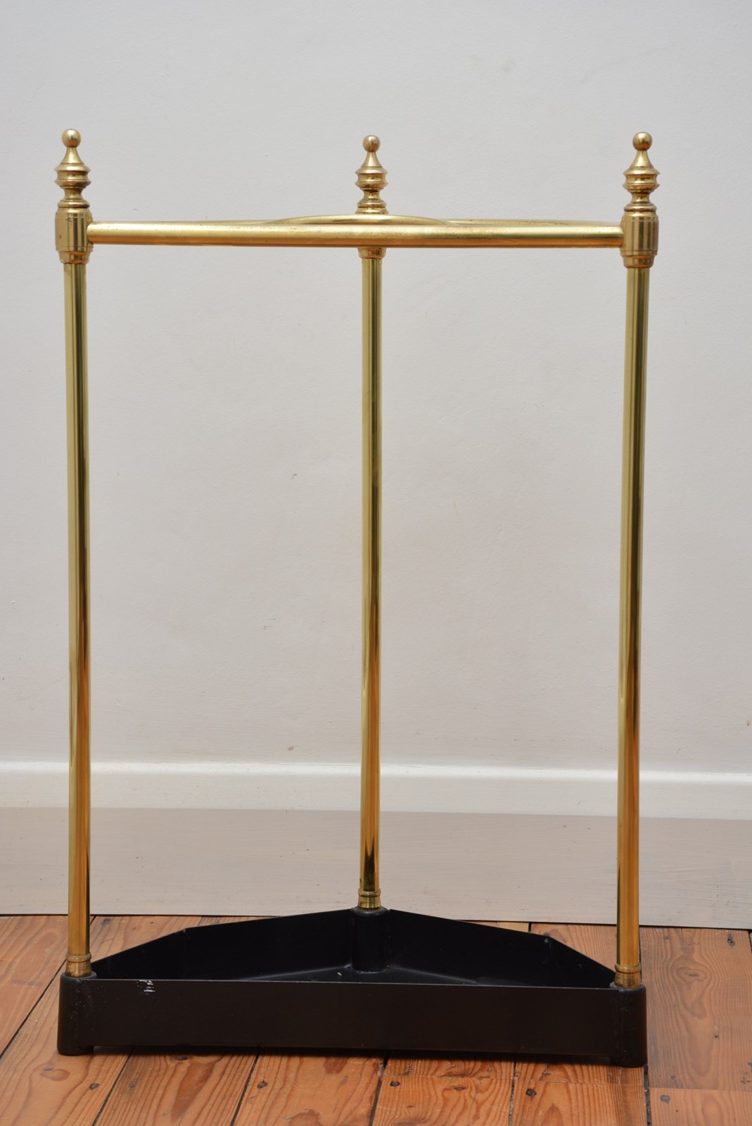 P0329 Stylish and elegant Vintage umbrella stand of demi lune design, having five umbrella and walking sticks compartments with three decorative finials to the top and three uprights terminating in unusual canted drip tray. This attractive umbrella stand has been cleaned and polished and is in home ready condition. c1930