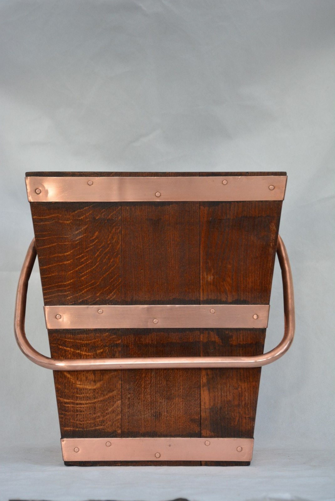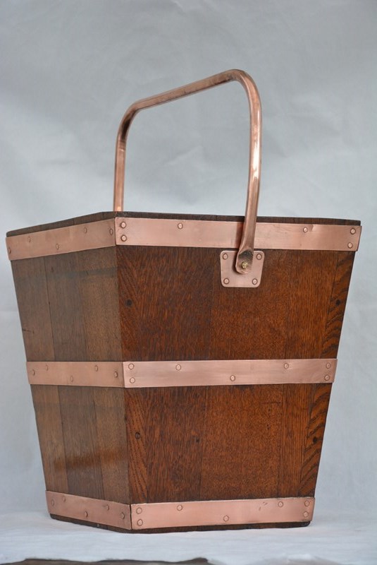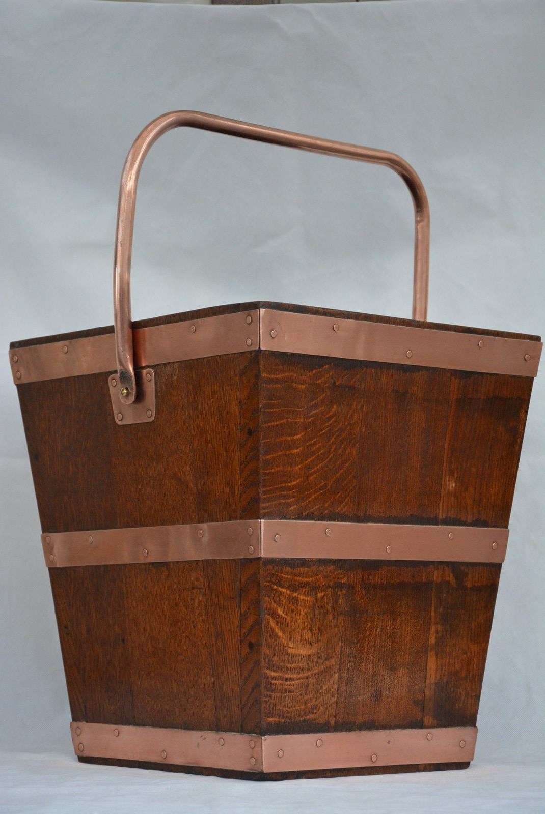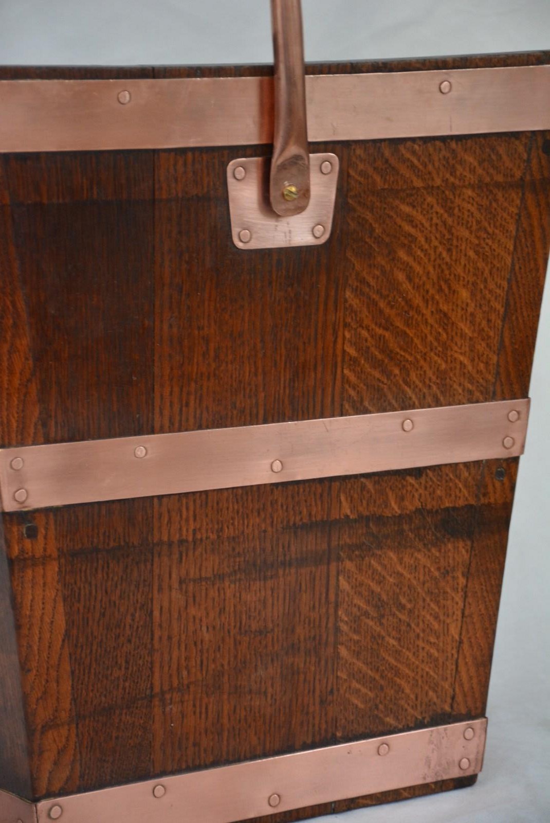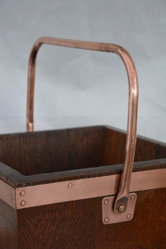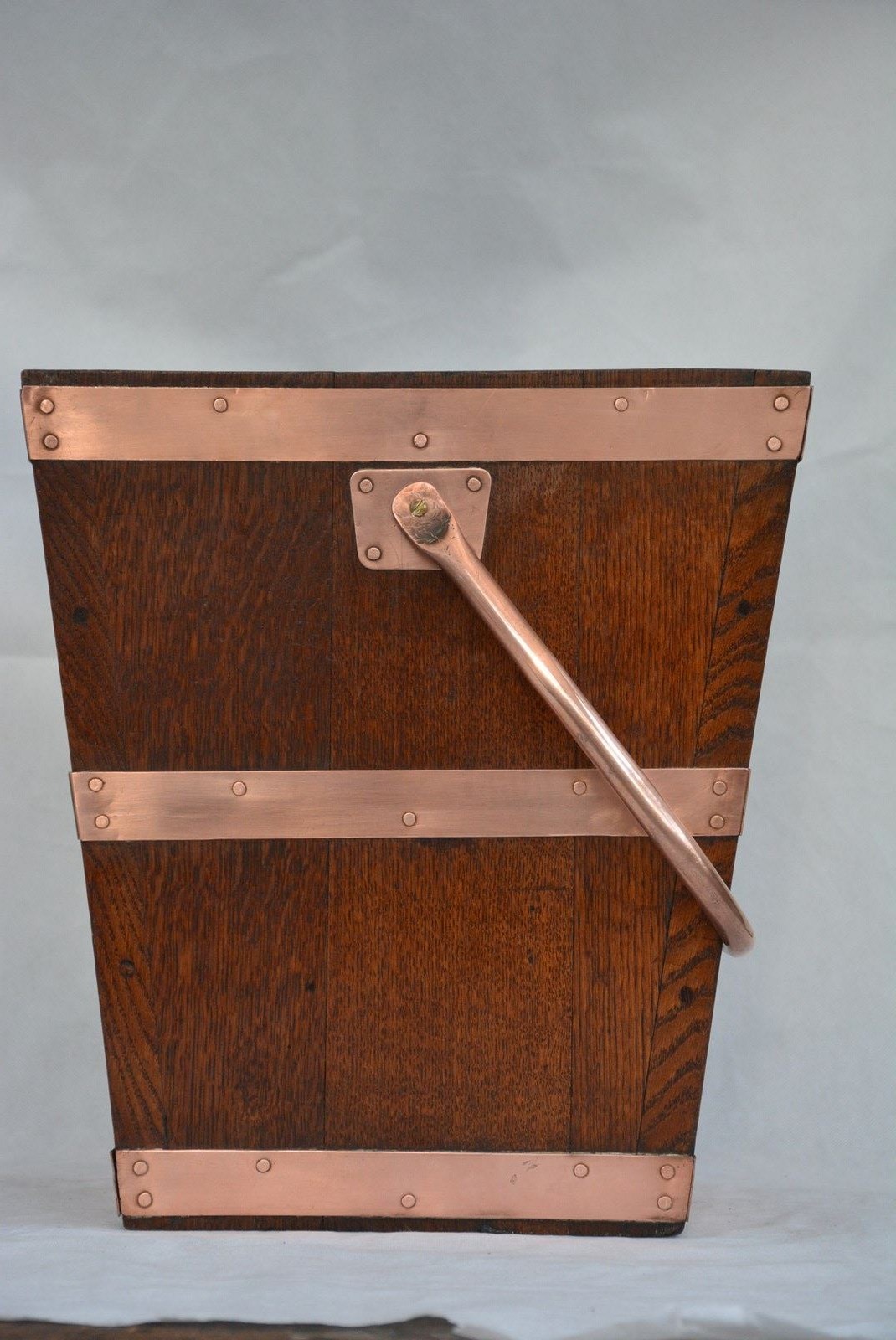 P0319 Simple, elegant and stylish Victorian solid oak peat or coal bucket, having copper bounds and copper handle, all showing original oak pegs throughout. This antique bucket would make a good kindling or log bucket aswell as a planter. The timber is woodworm free, solid and sturdy, metal bounds and the handle has been polished. All cleaned, waxed and in home ready condition. c1880