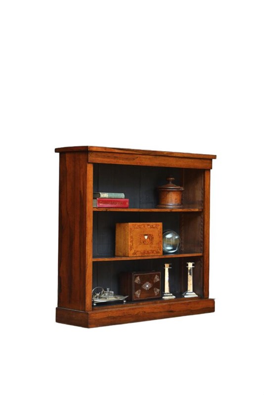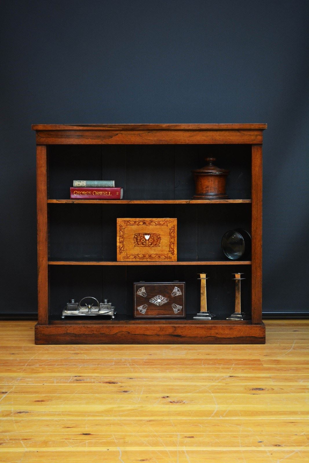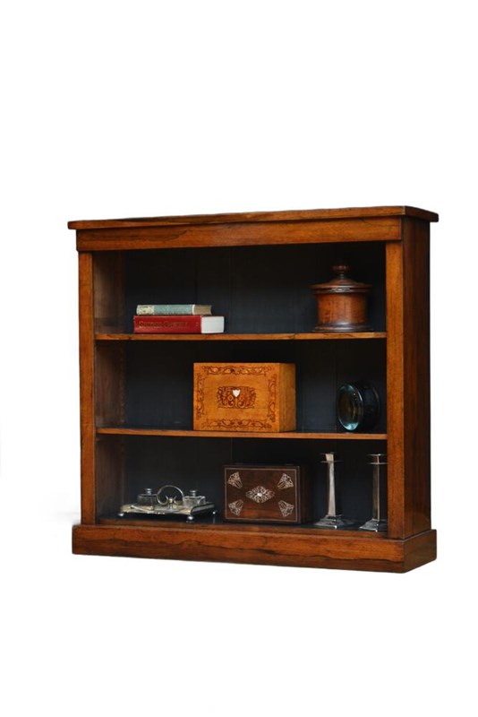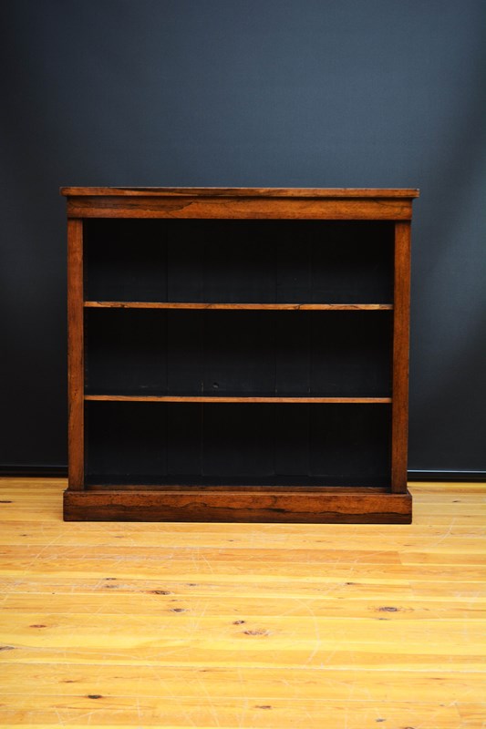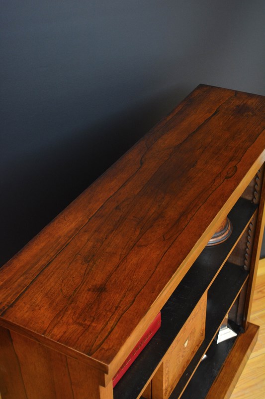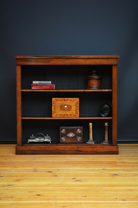 K0634 English 19th century, William IV open bookcase of simple and elegant design with well figured sides and well figured oversailing top above a shallow frieze and two height adjustable and removable shelves, flanked by figured uprights, all standing on plinth base. This antique bookcase has been sympathetically restored and is in home ready condition. The bookcase retains its original finish with good patina, good colour and antique character. No woodworm. c1830