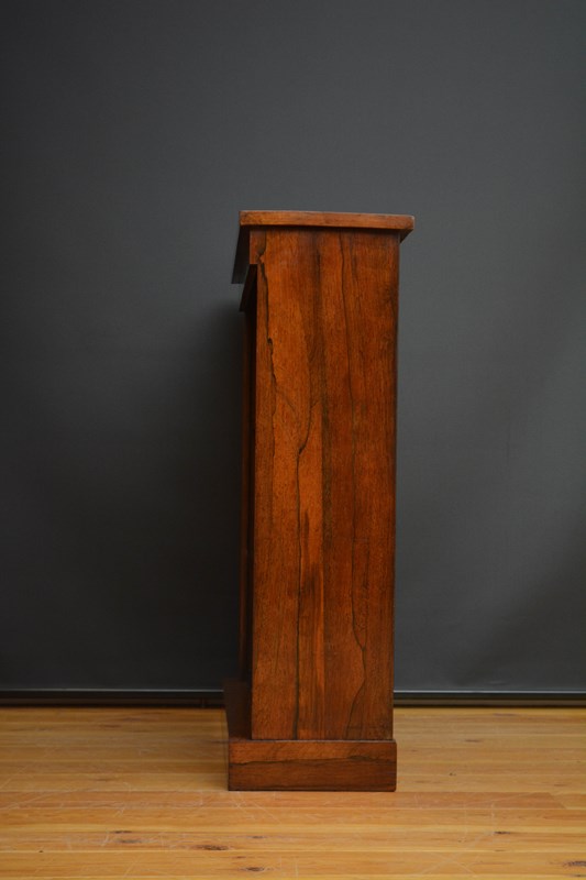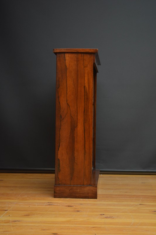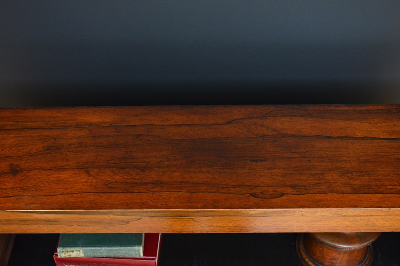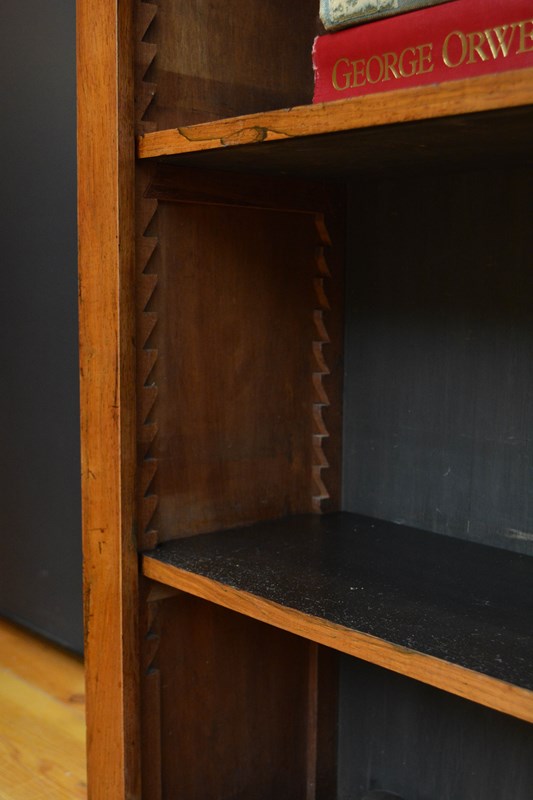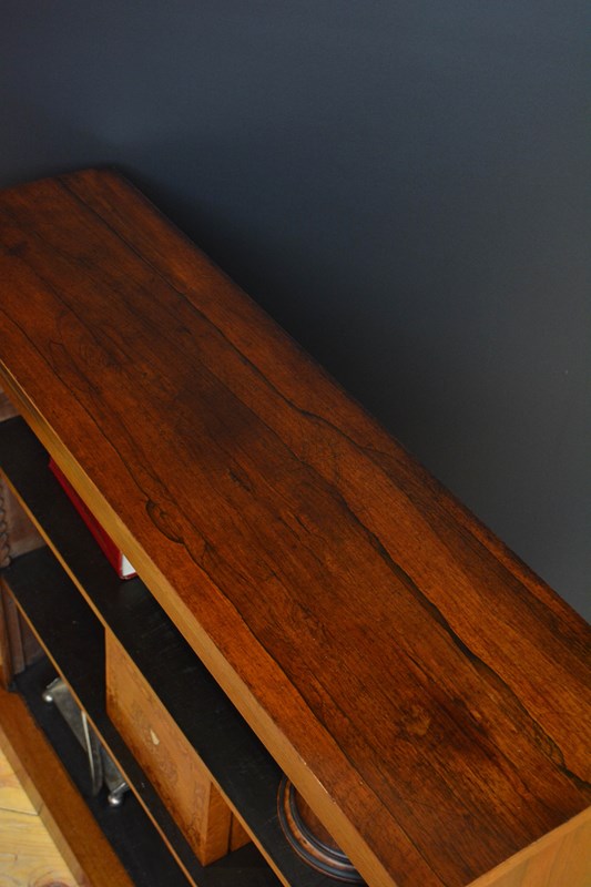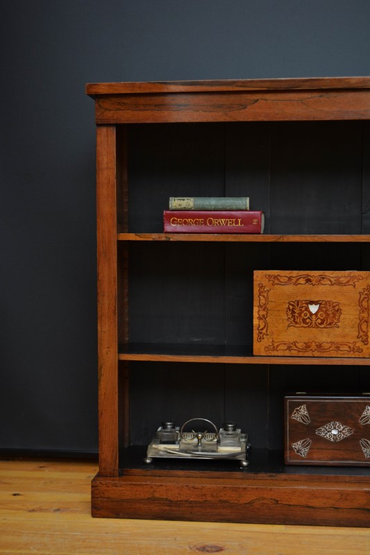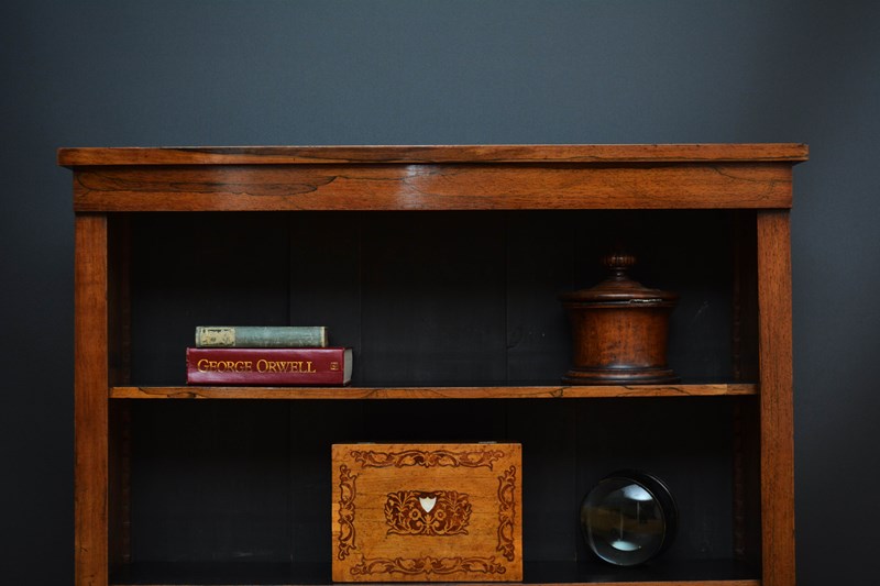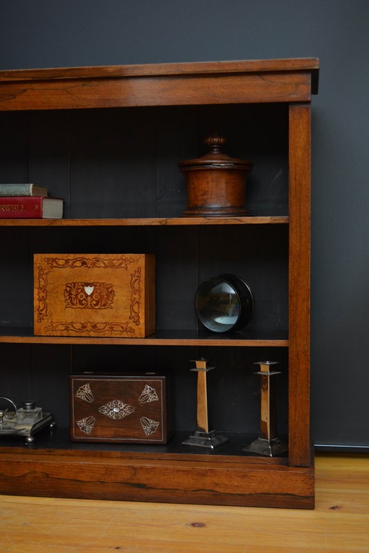 K0634 English 19th century, William IV open bookcase of simple and elegant design with well figured sides and well figured oversailing top above a shallow frieze and two height adjustable and removable shelves, flanked by figured uprights, all standing on plinth base. This antique bookcase has been sympathetically restored and is in home ready condition. The bookcase retains its original finish with good patina, good colour and antique character. No woodworm. c1830
