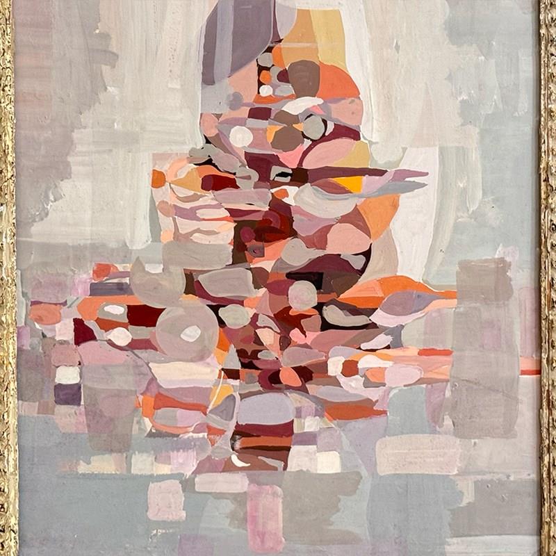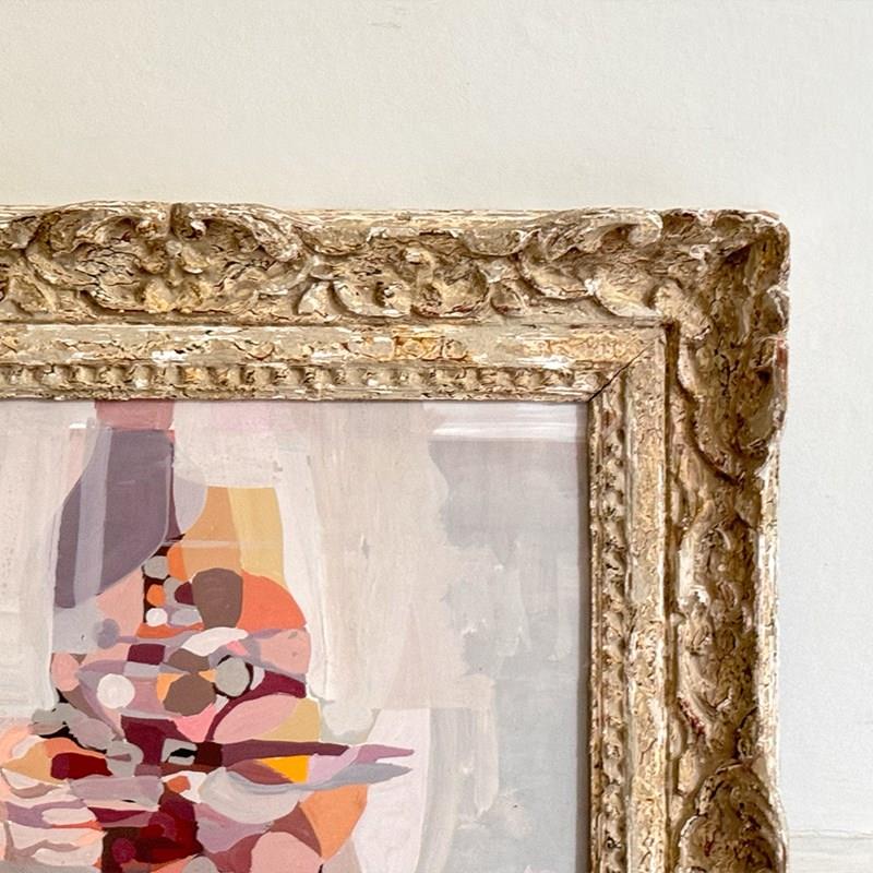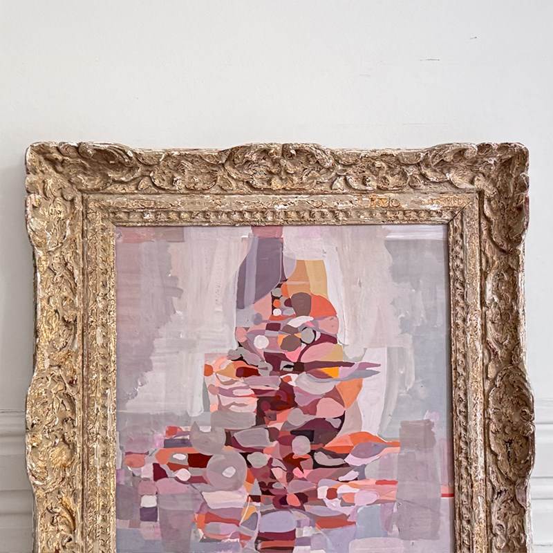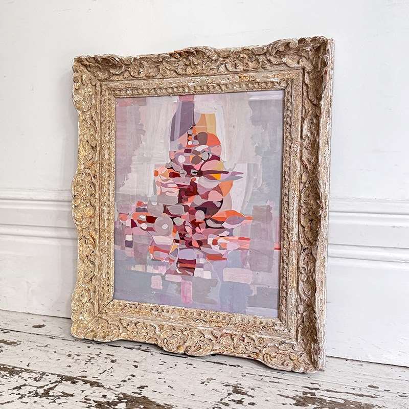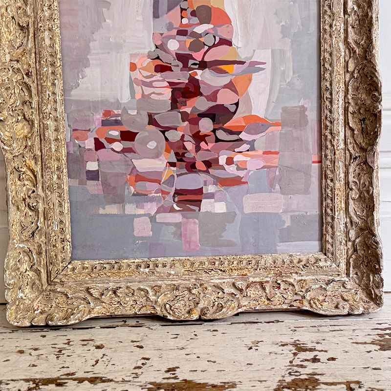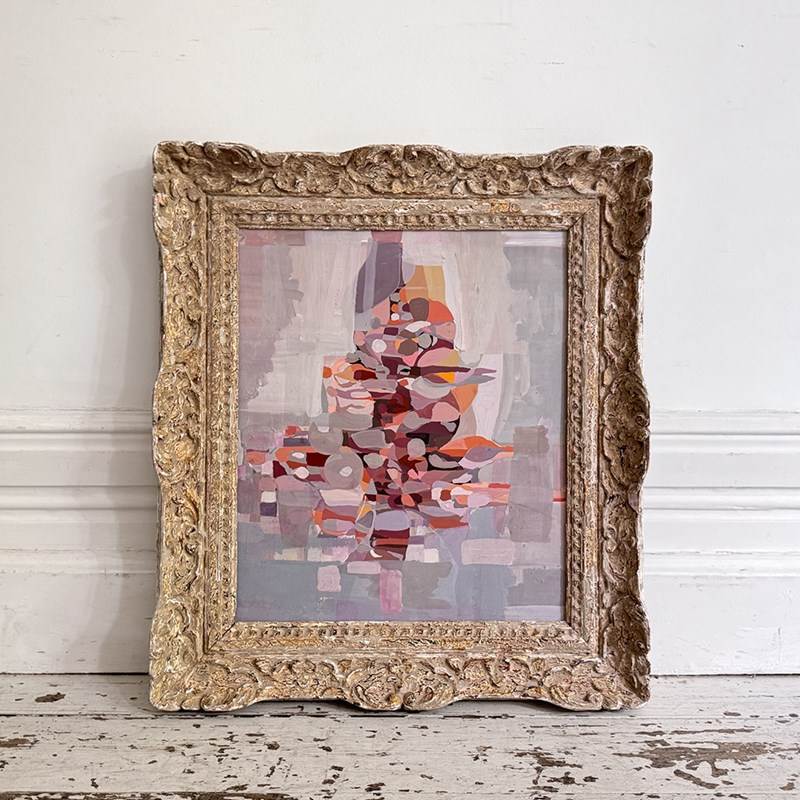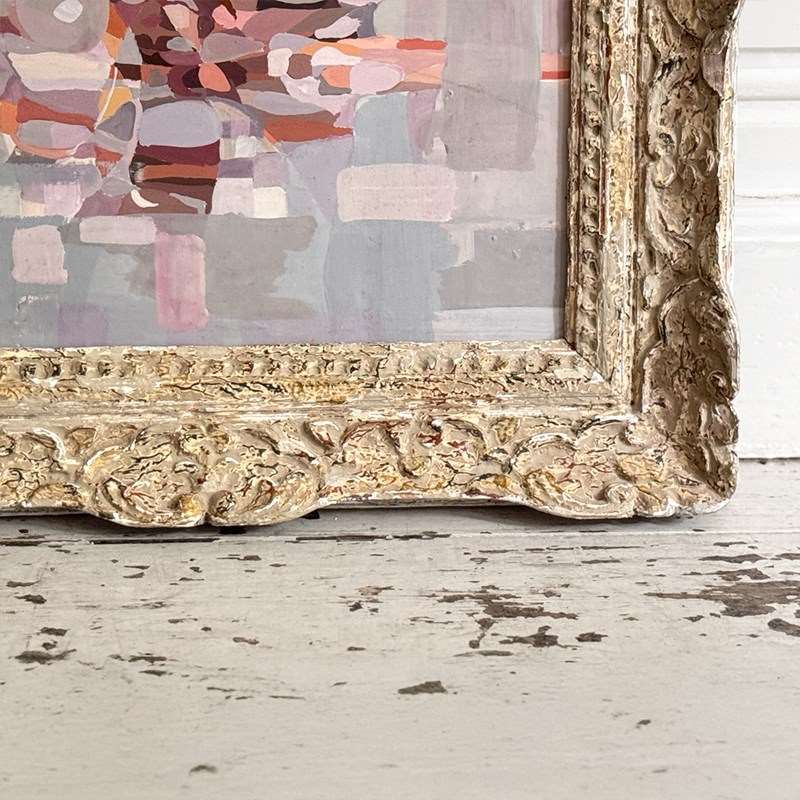 One of three abstract acrylic artworks in pink and purple tones and set within an antique Montparnasse frame. By an American artist who lived in the South of France (name unknown).