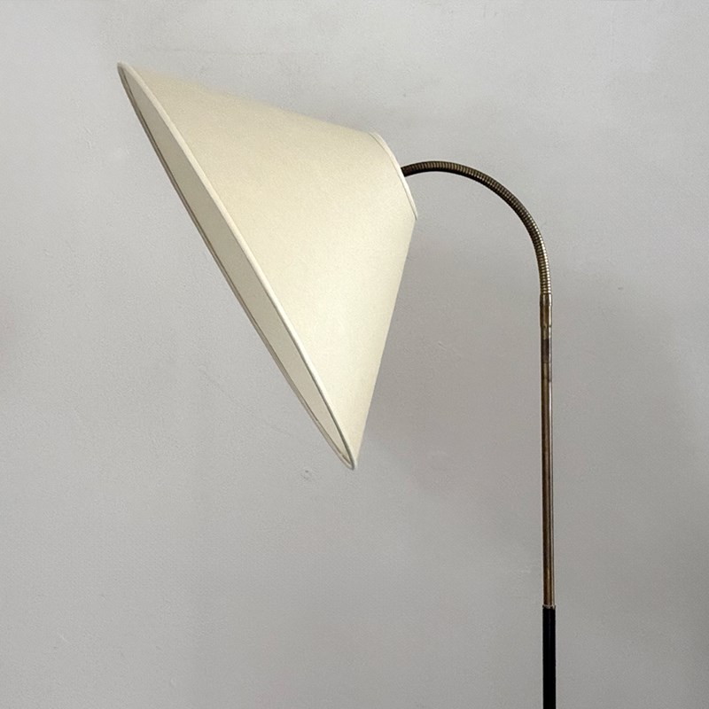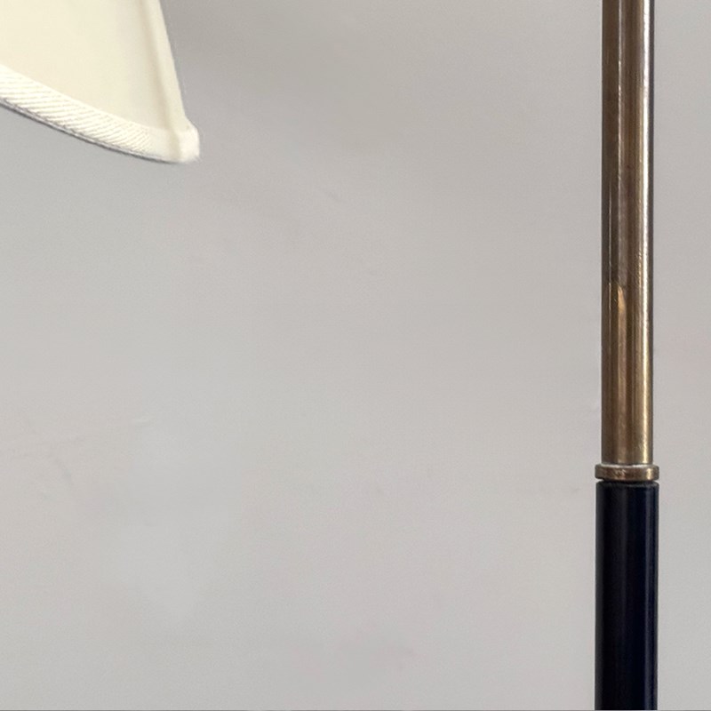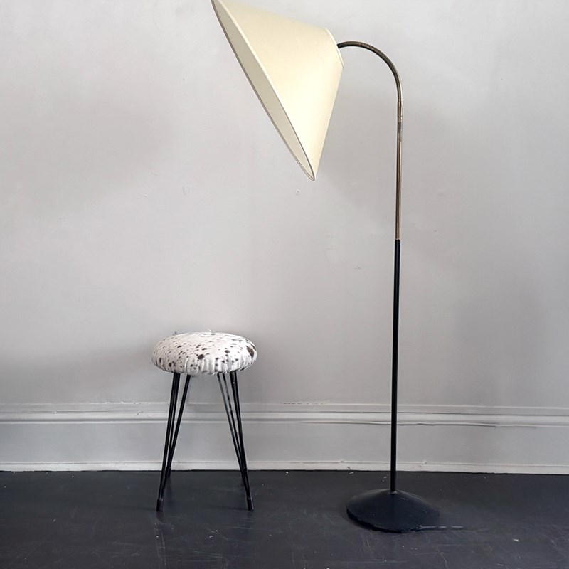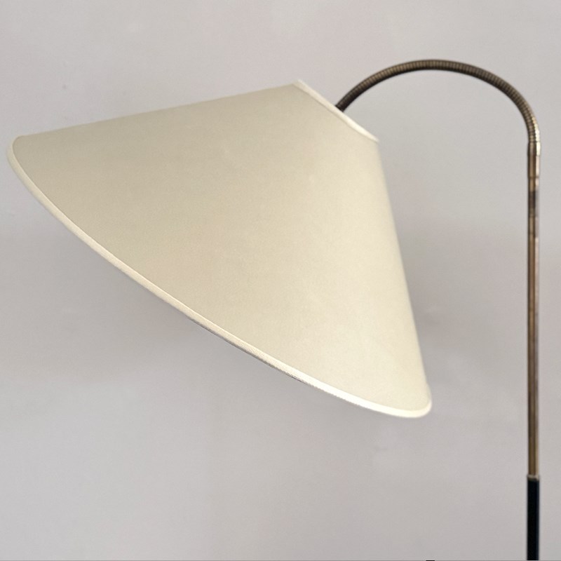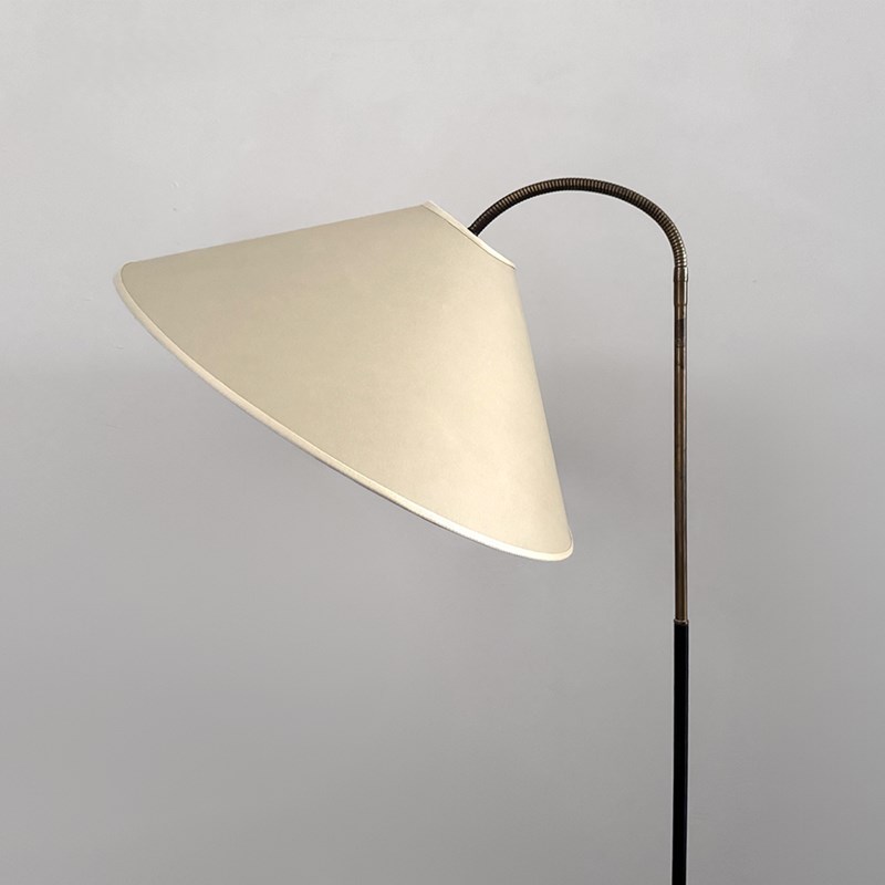A charming standing lamp, the lower half black metal, the top half a brass, articulated arm holding the a new parchment shade based on a vintage pattern. Newly rewired & PAT tested.