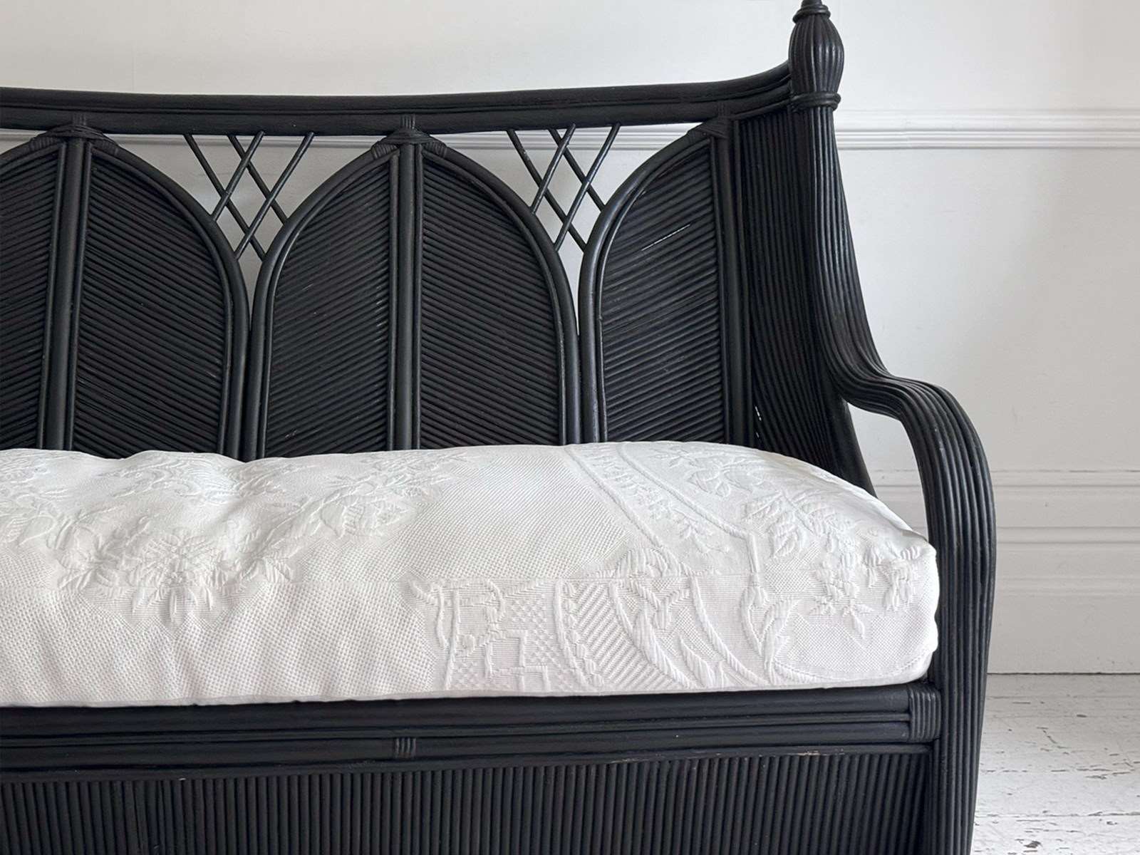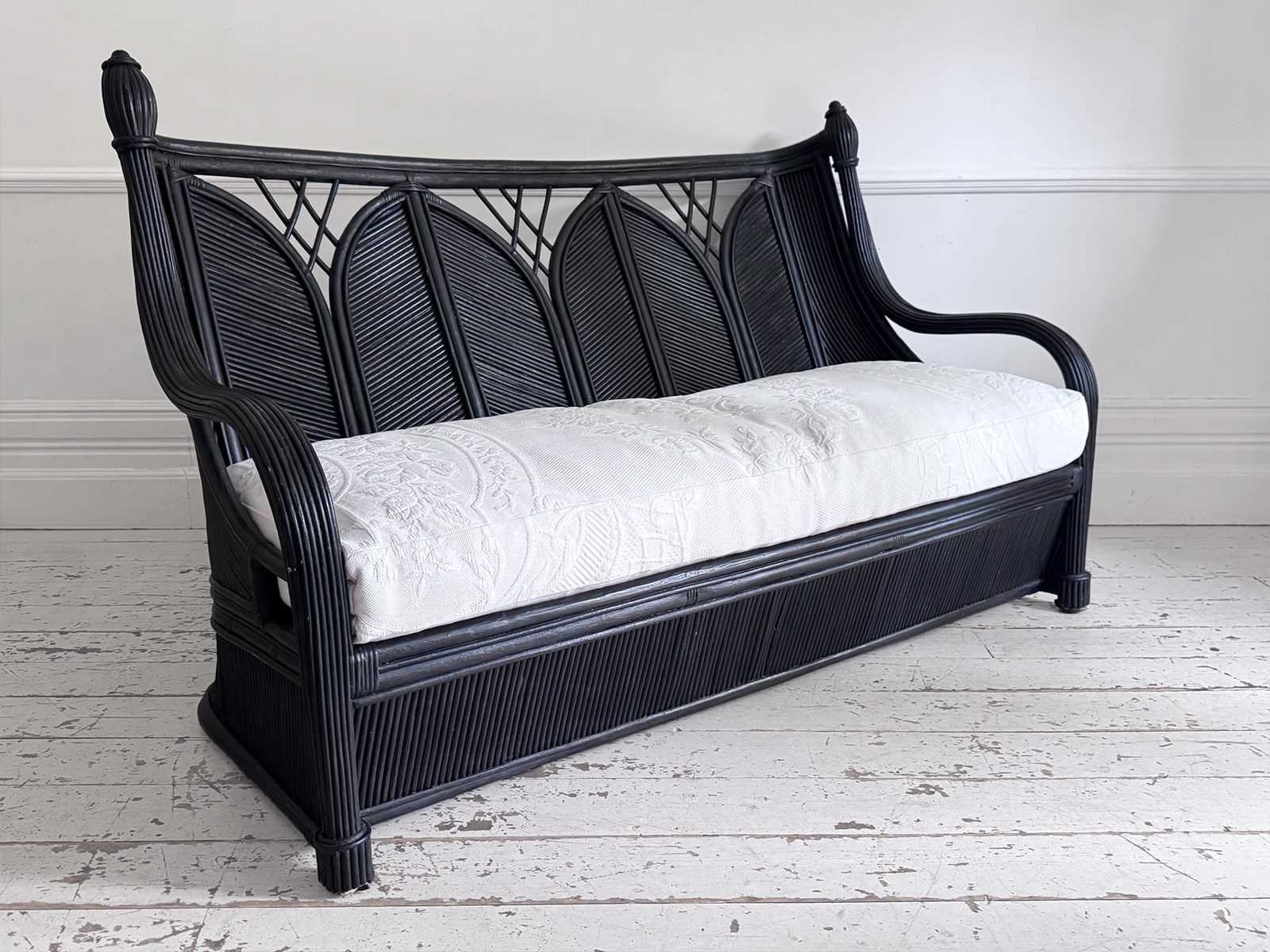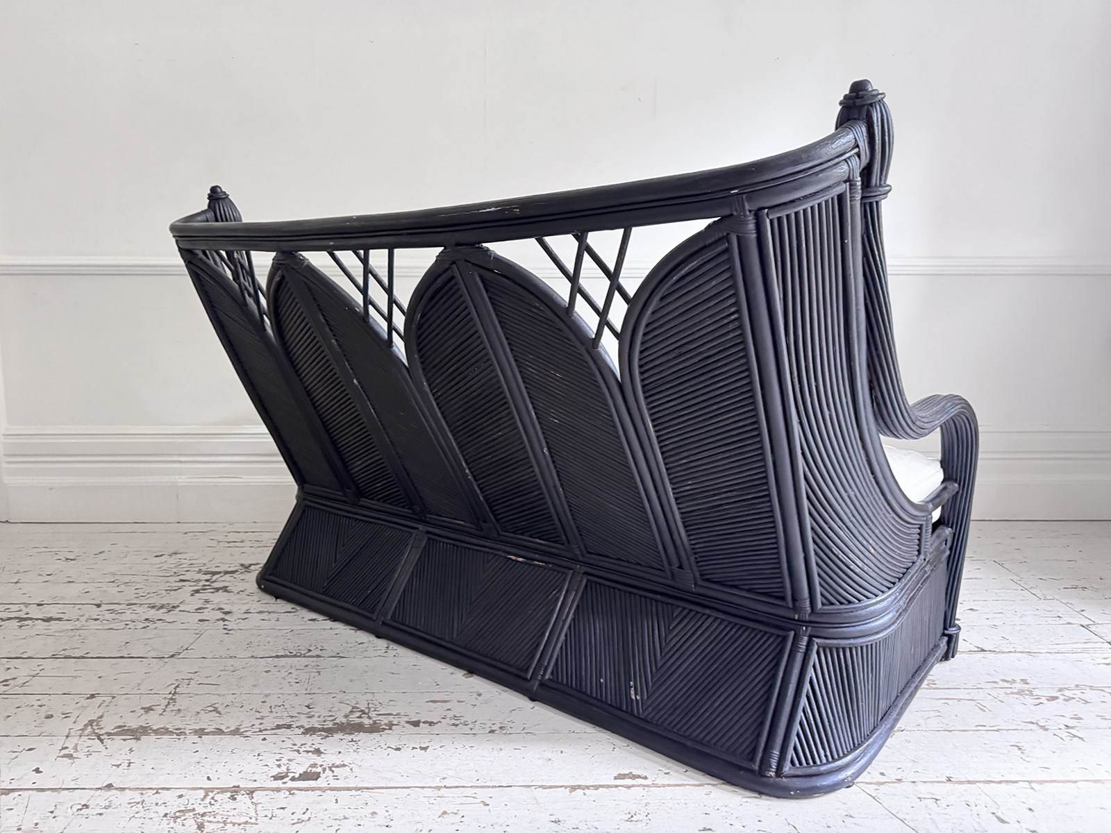 A beautifully sculptural painted black rattan mid-century sofa with decorative back and finials and shaped back. Newly upholstered with antique French piqué. Later paint. Further photography with back cushions to follow..