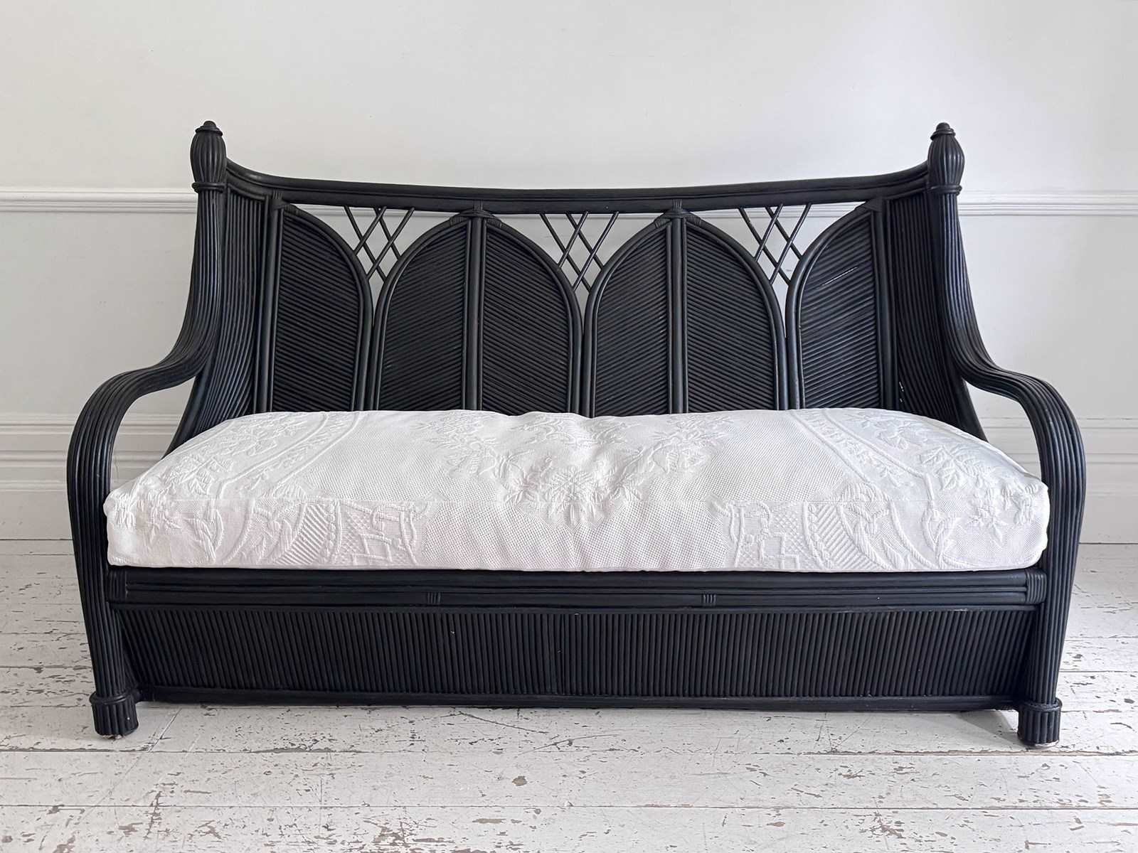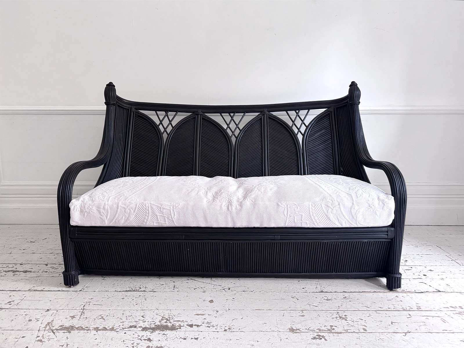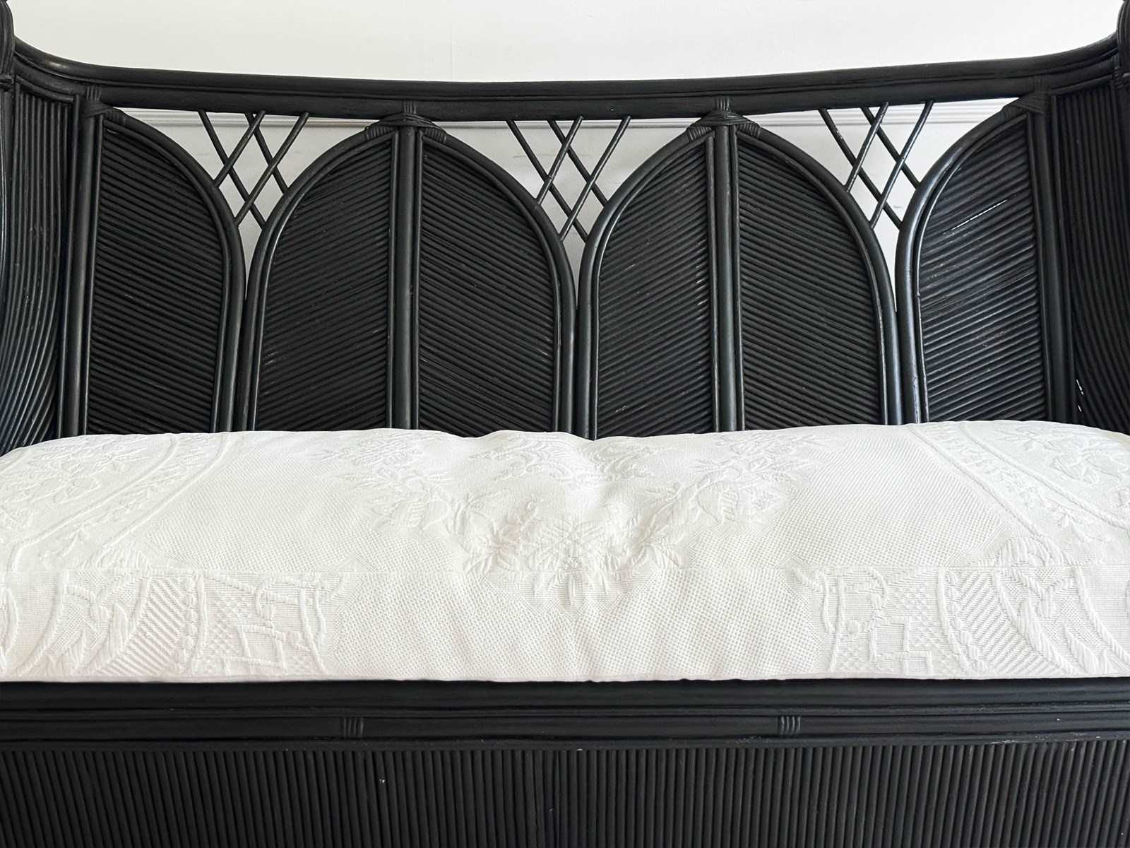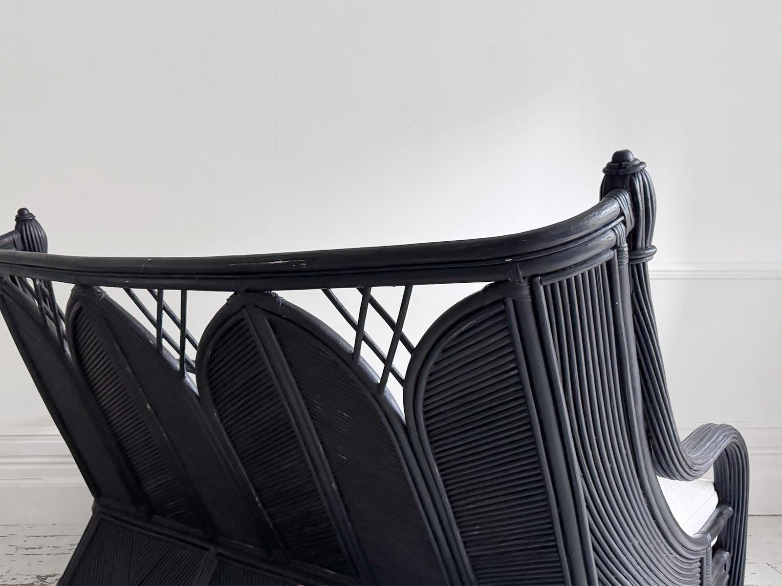 A beautifully sculptural painted black rattan mid-century sofa with decorative back and finials and shaped back. Newly upholstered with antique French piqué. Later paint. Further photography with back cushions to follow..