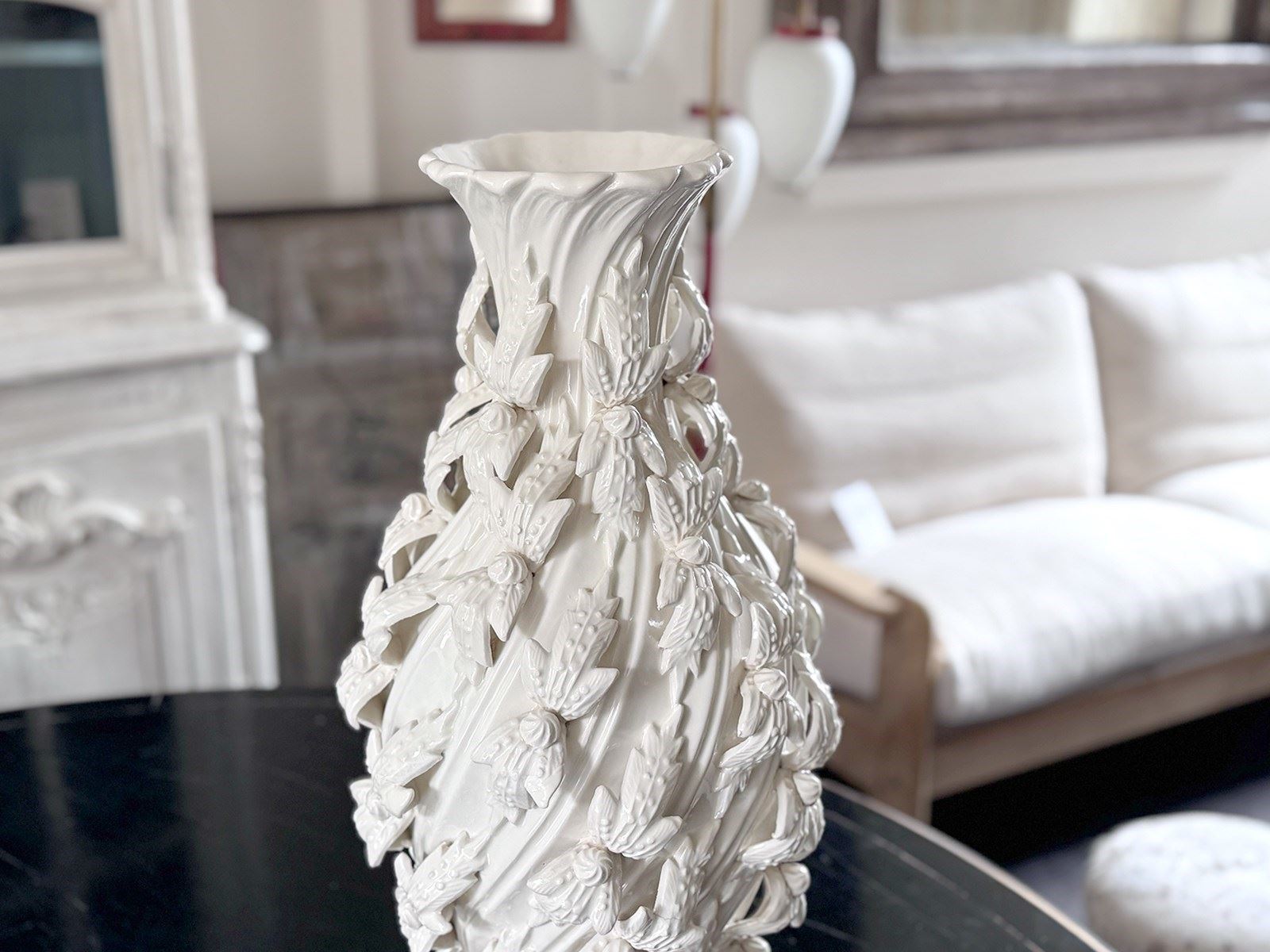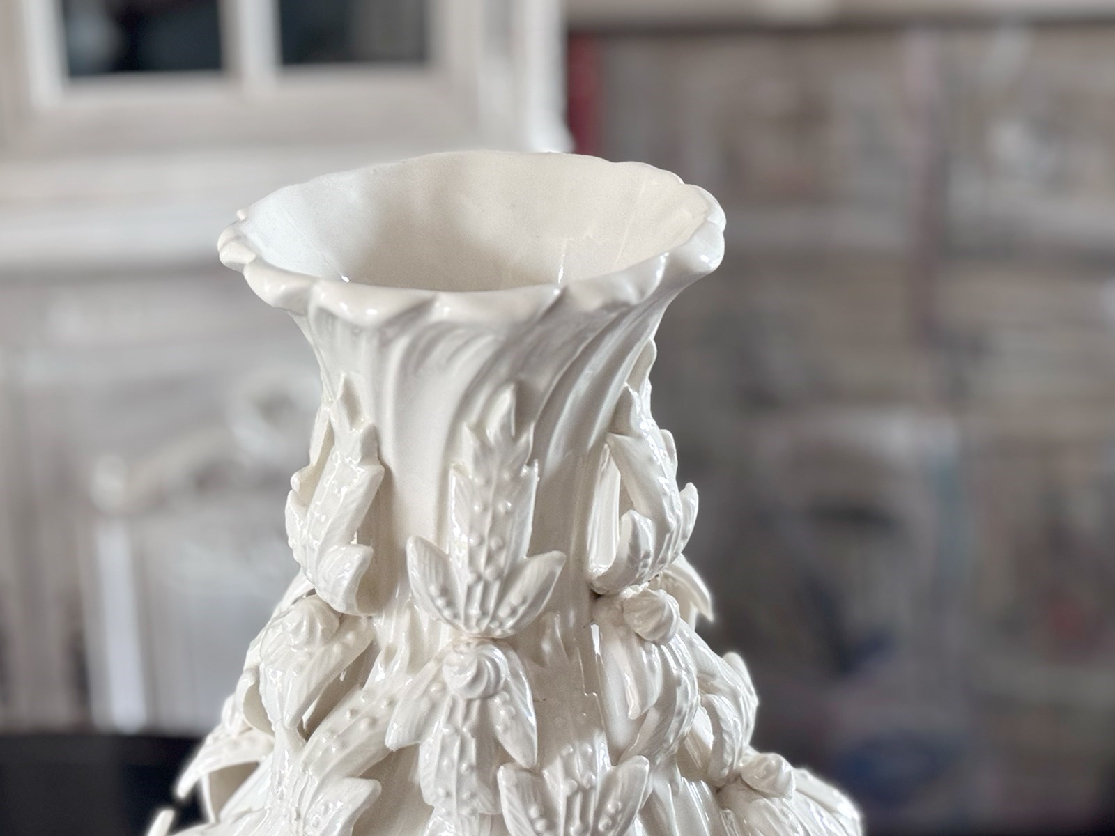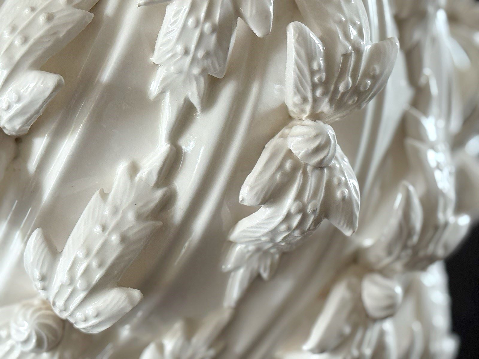A very large white ceramic vase from the Valencia region of Spain, decorated with three-dimensional leaves.