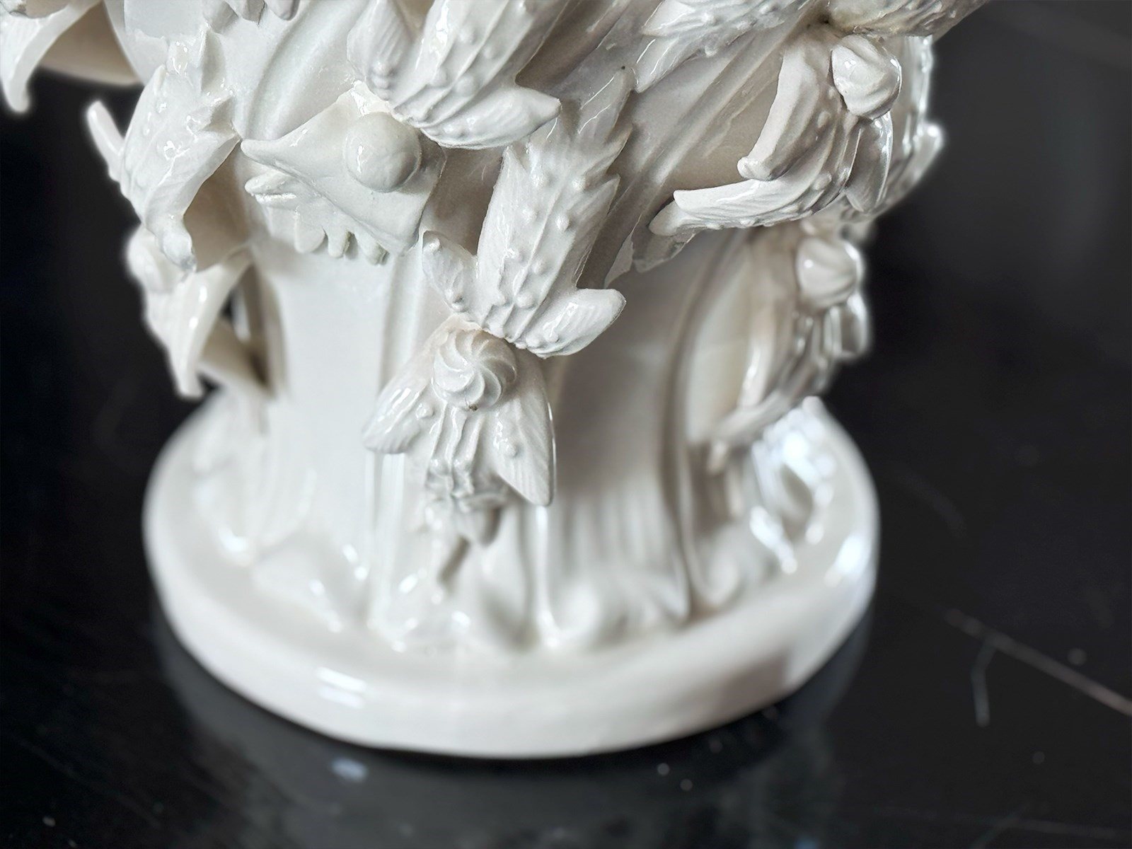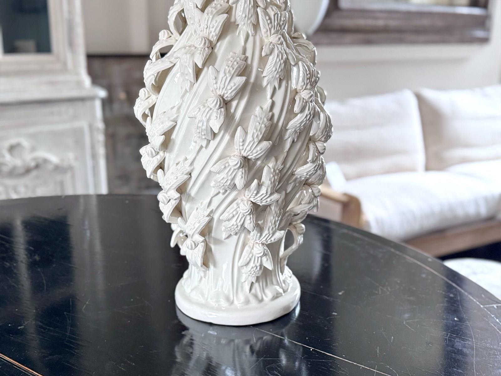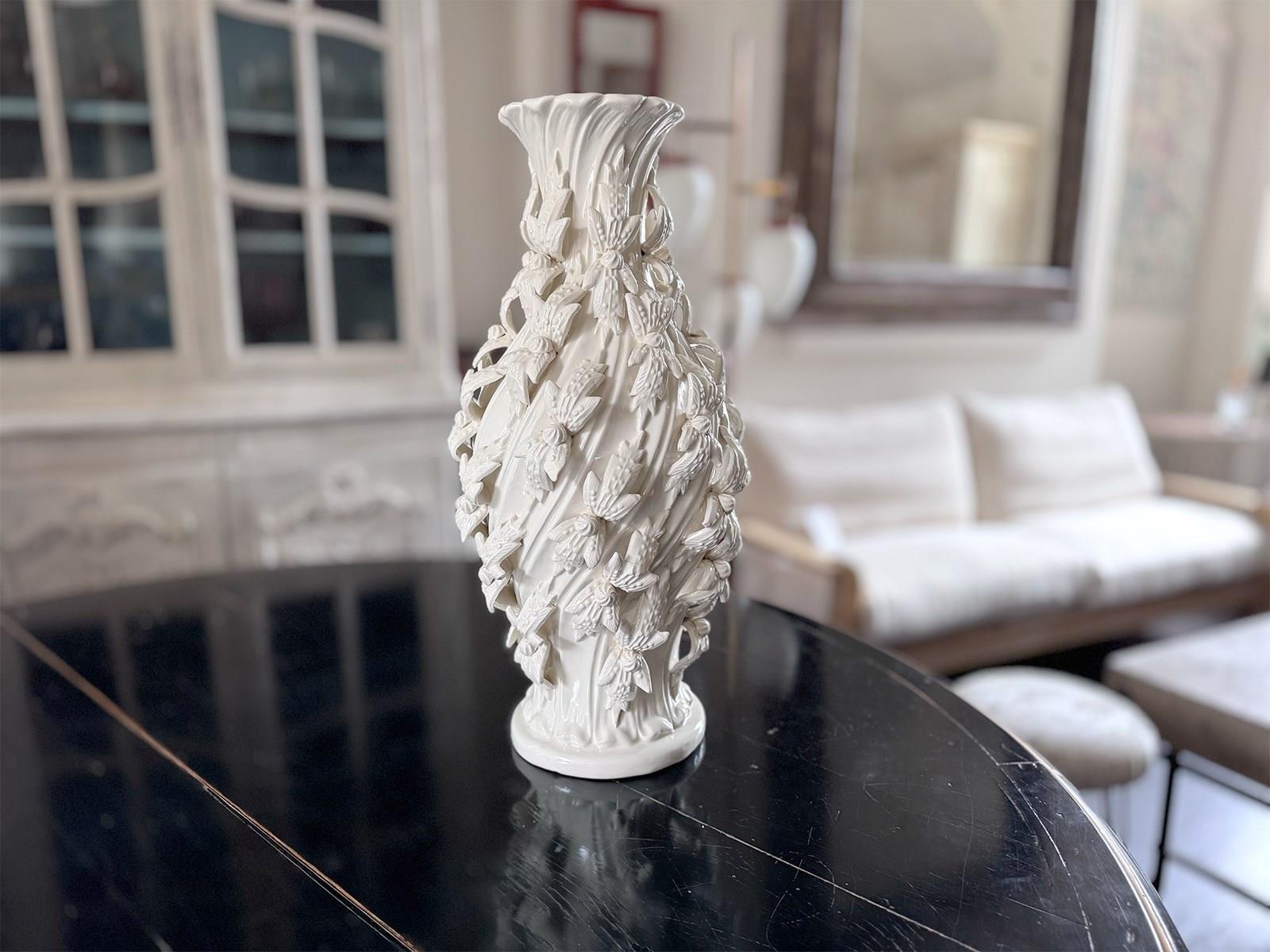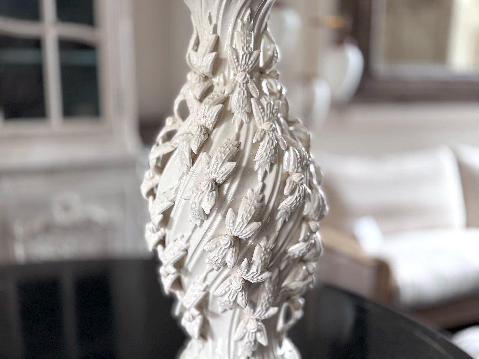 A very large white ceramic vase from the Valencia region of Spain, decorated with three-dimensional leaves.