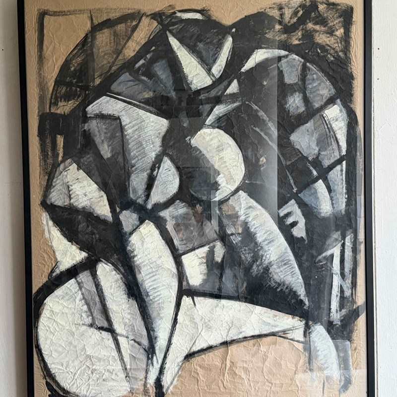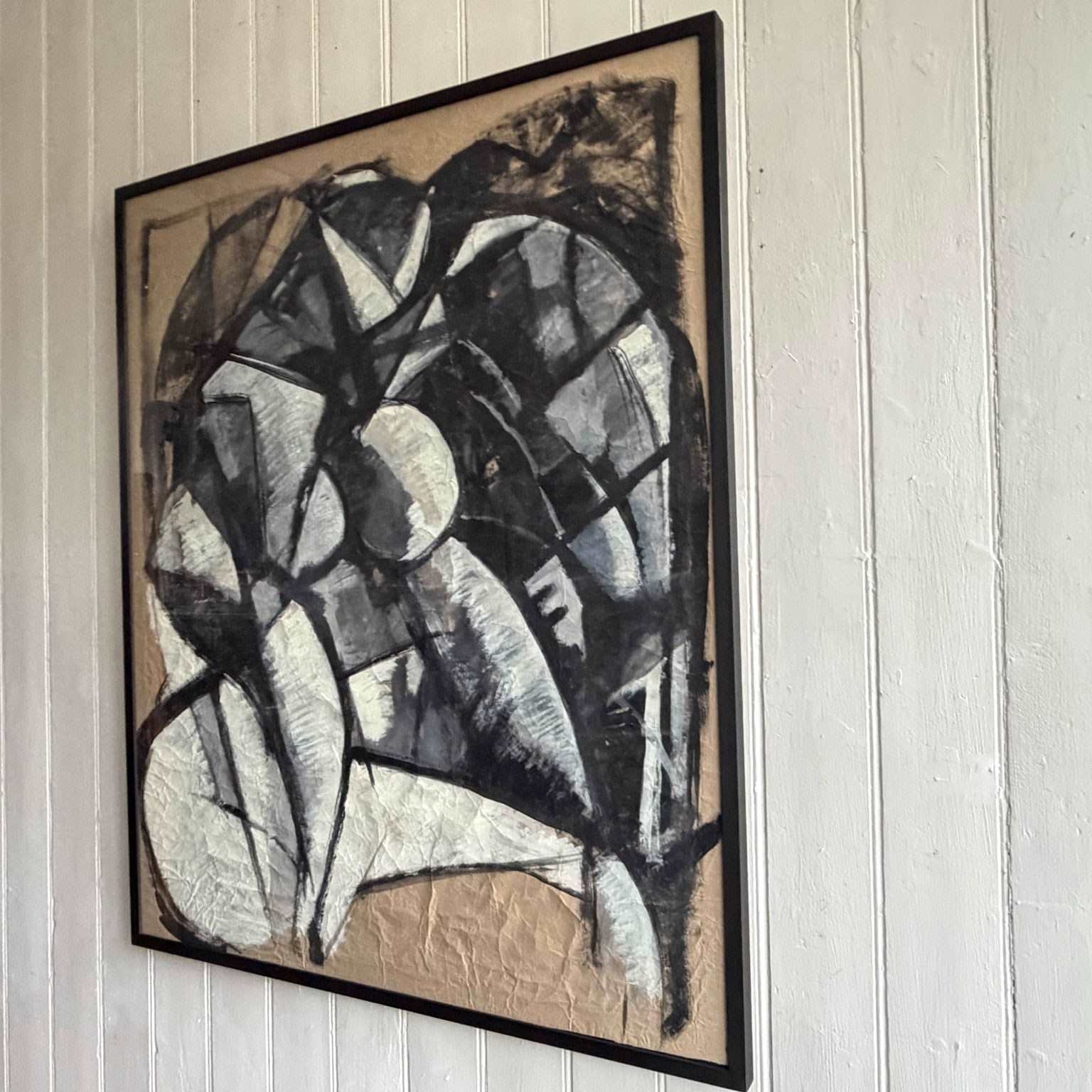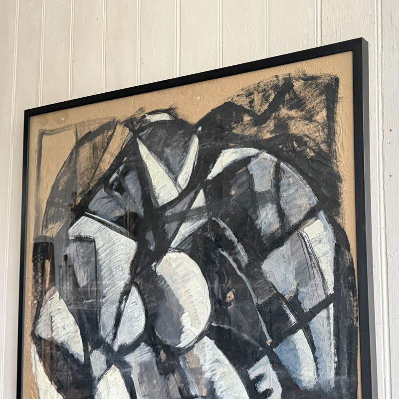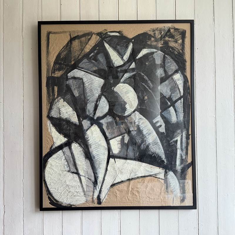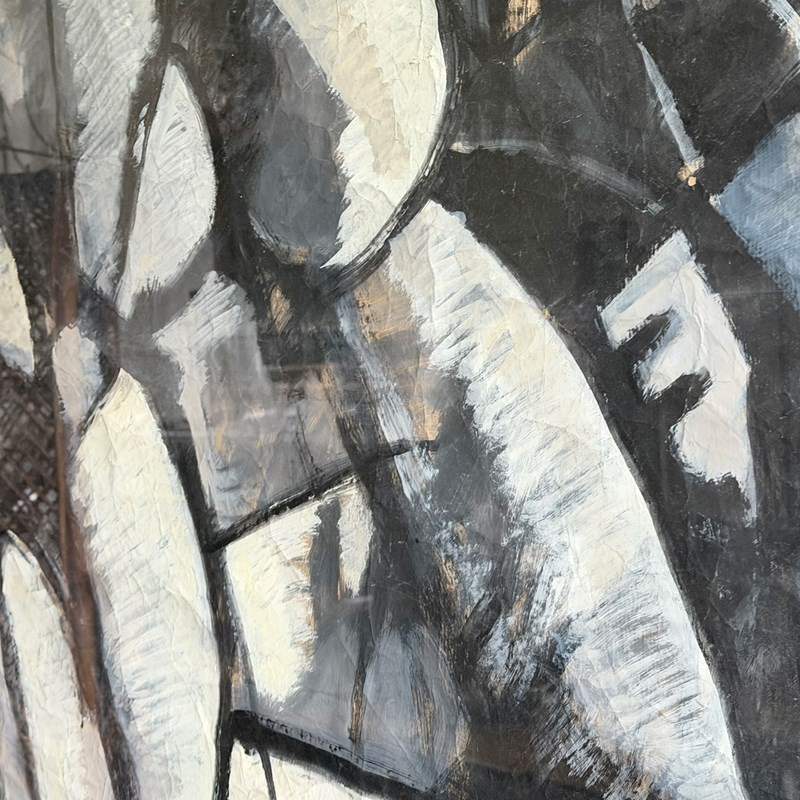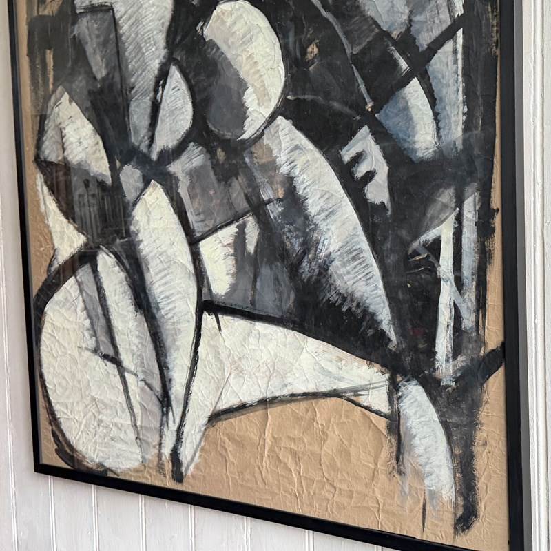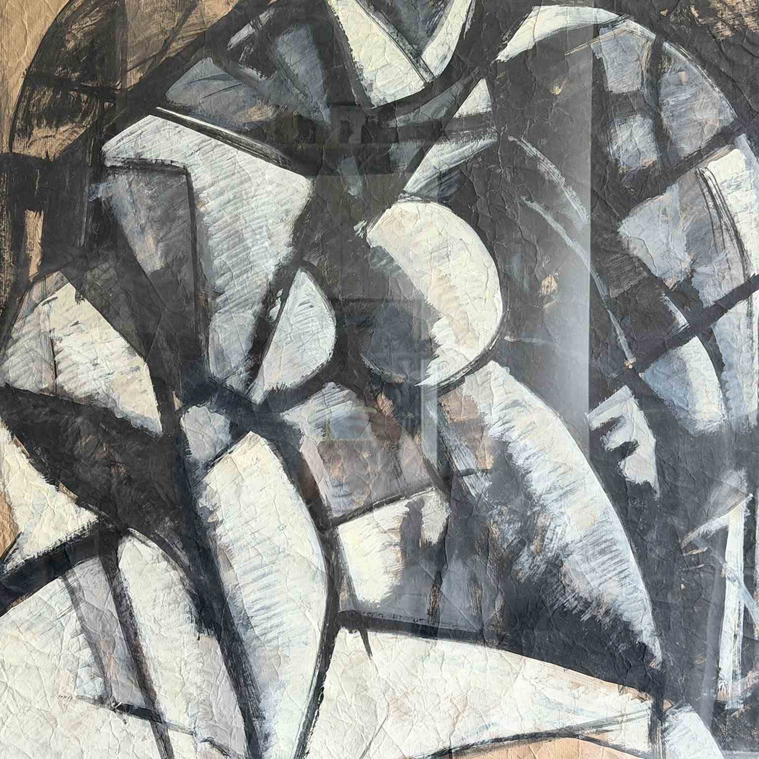 A large scale vintage Italian abstract artwork in a strong, monochrome, geometric style and purchased from the collection of a Florentine Art Professor. Whites and greys are set within bold black lines. The use of crumpled paper as a base is very effective.