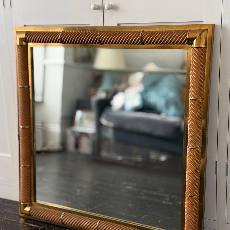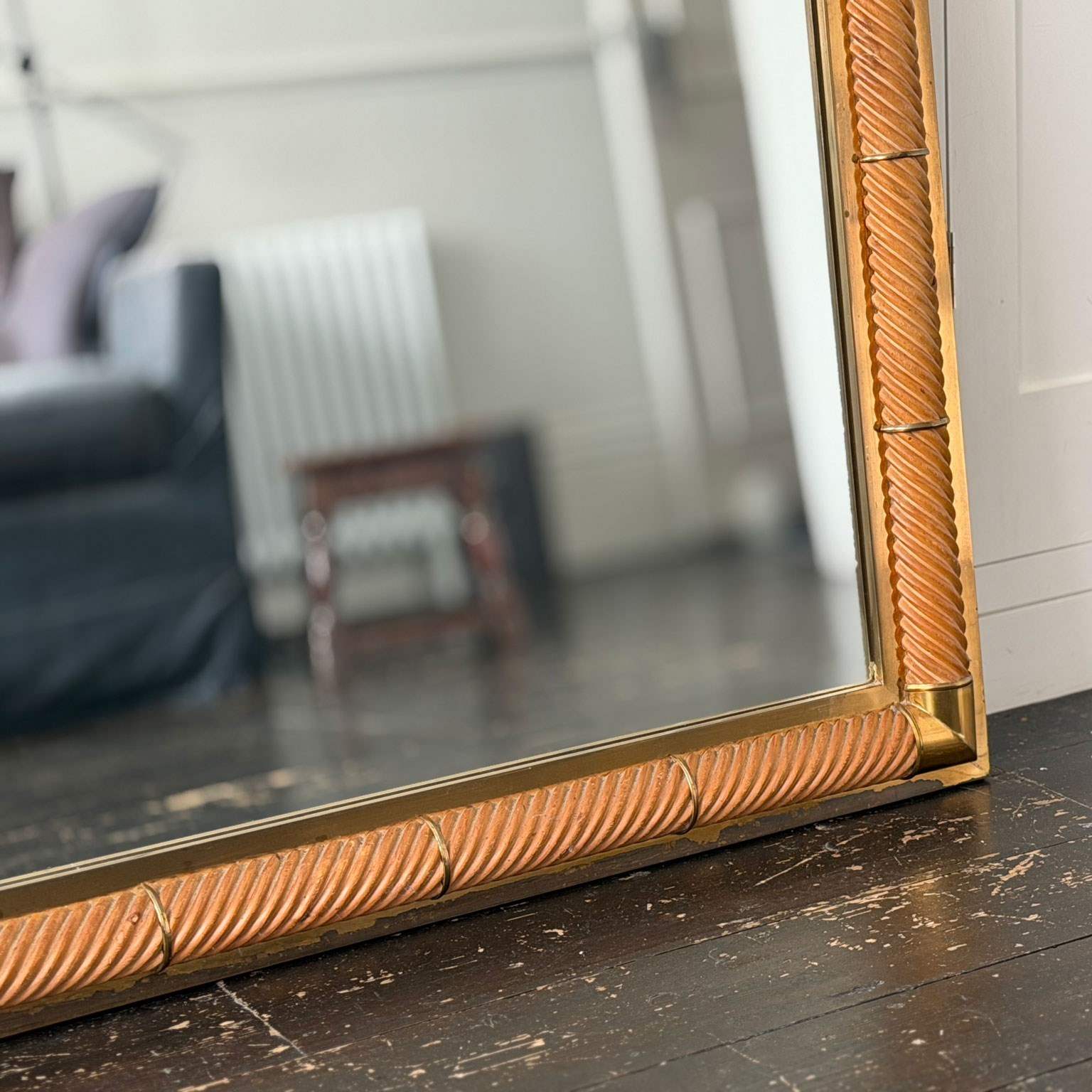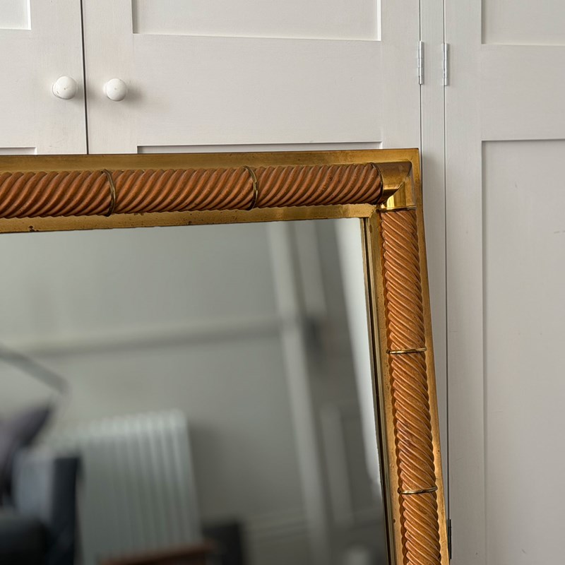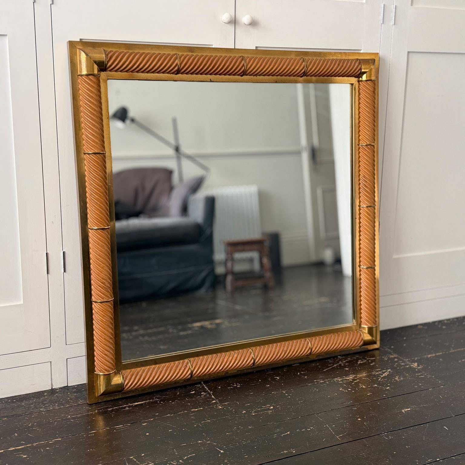 A 1970's French mirror with square spiral carved frame and brass plated bands and corners.