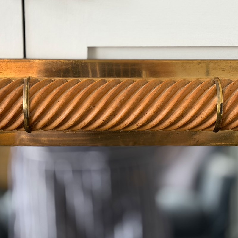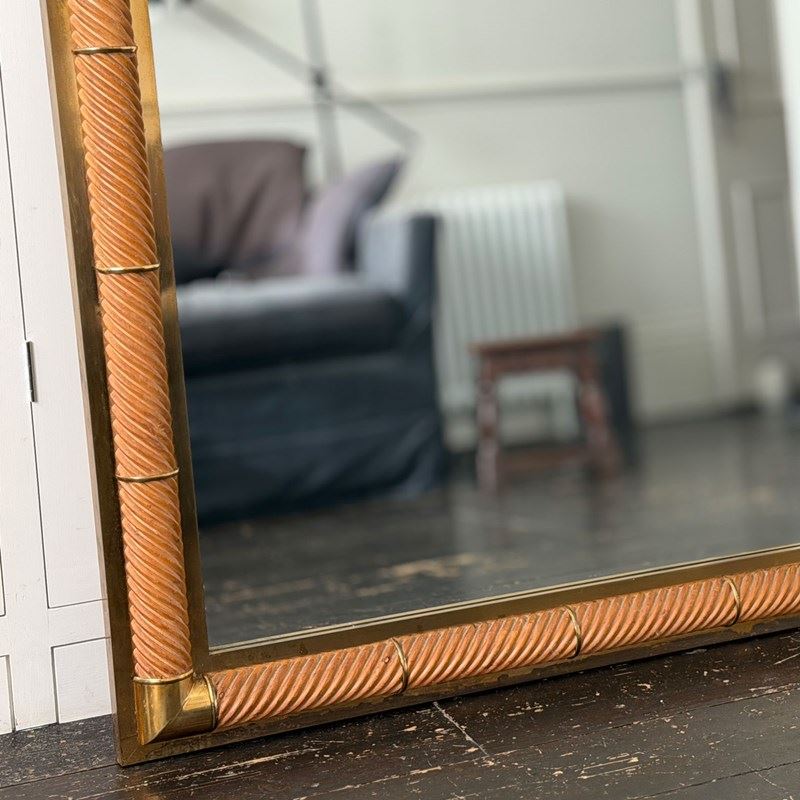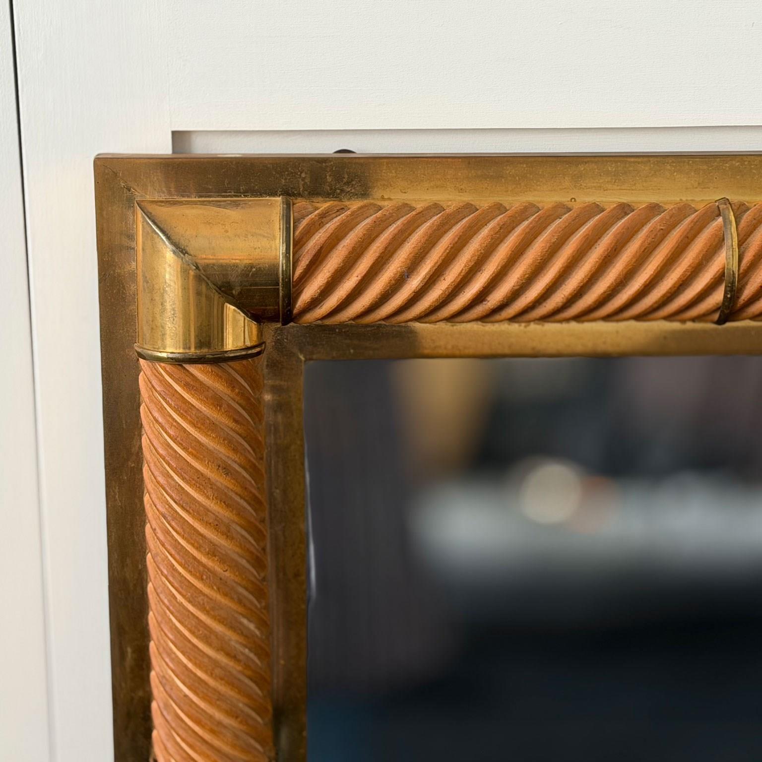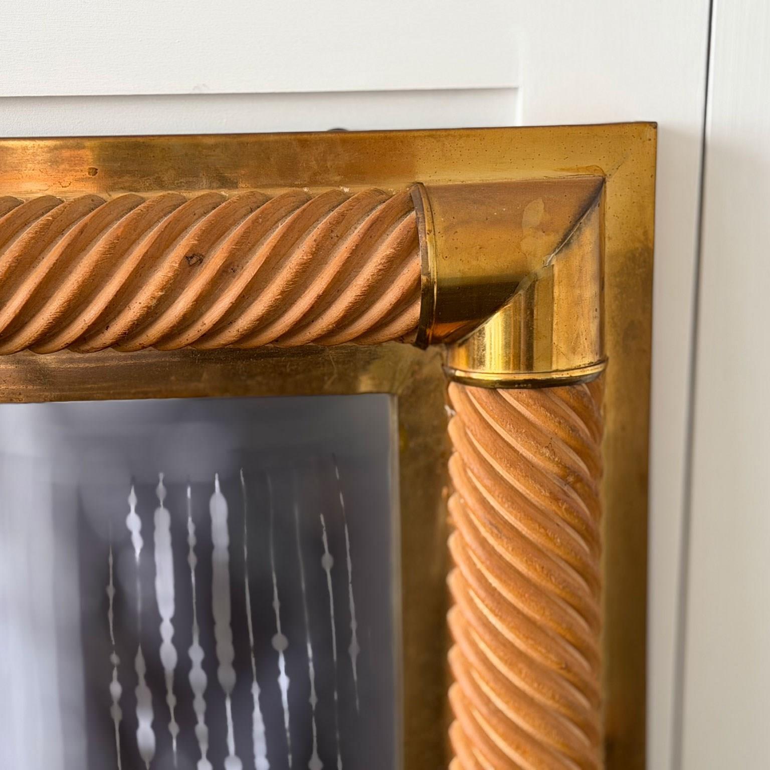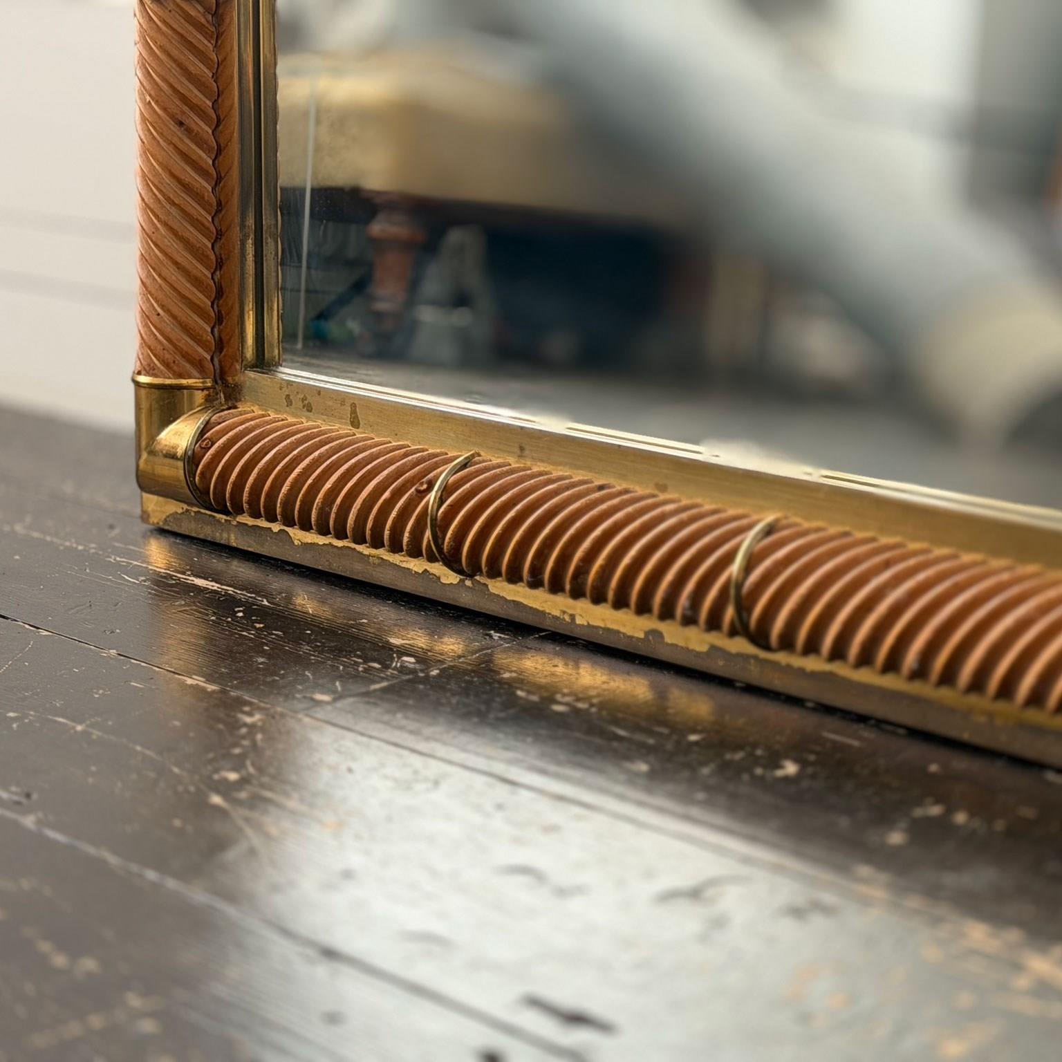 A 1970's French mirror with square spiral carved frame and brass plated bands and corners.