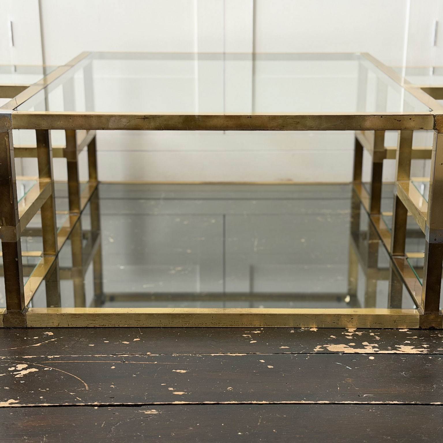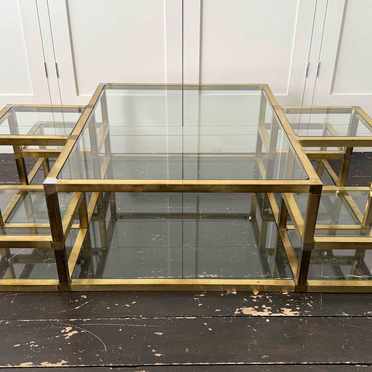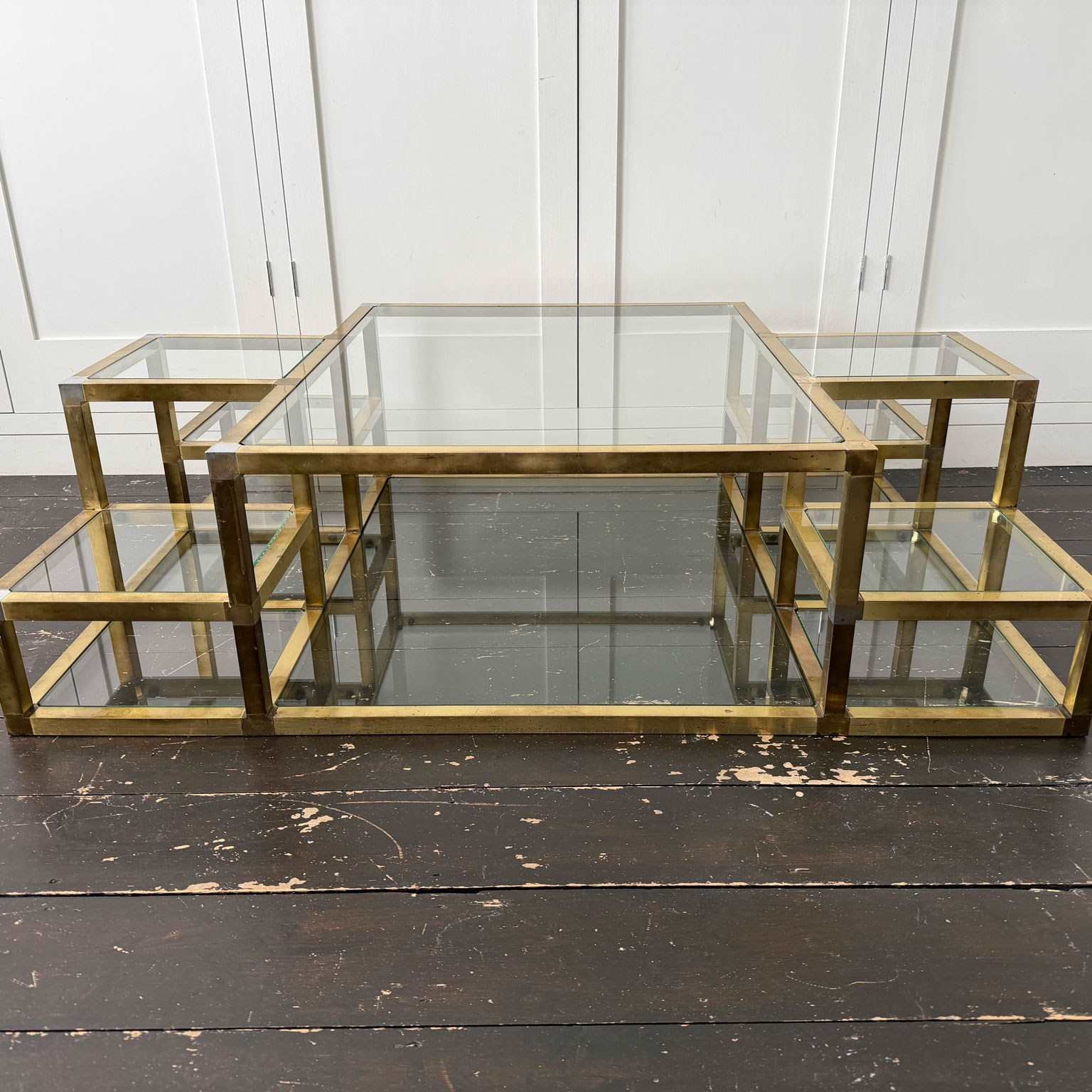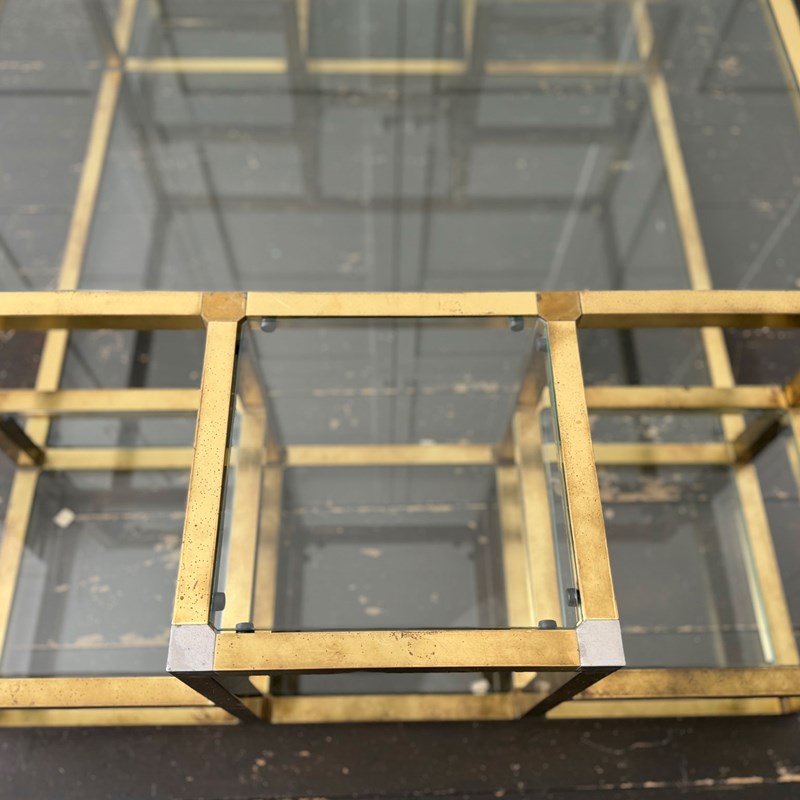 A substantial brass-plated coffee table with small nickel accents. With two tiers and 14 glass shelves set at various levels. The central, larger glass section with a matching lower shelf.